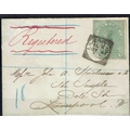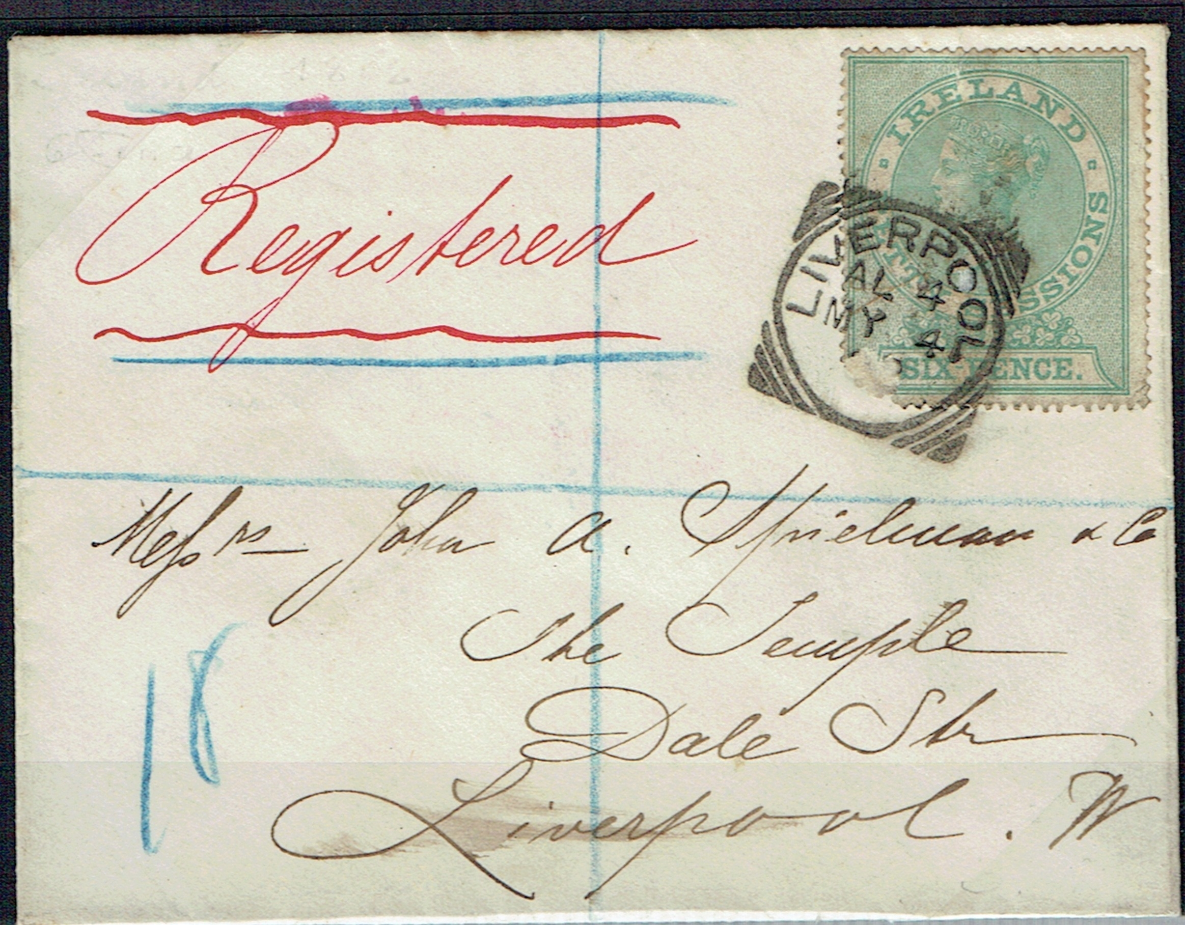 REVENUES & CINDERELLA - Ireland: Petty Sessions 6d green used postally on registered cover sent locally in Liverpool tied squared circle AL 4 cancel. The bottom corner is poorly torn and accepted without charge through the postal system, unusual.
