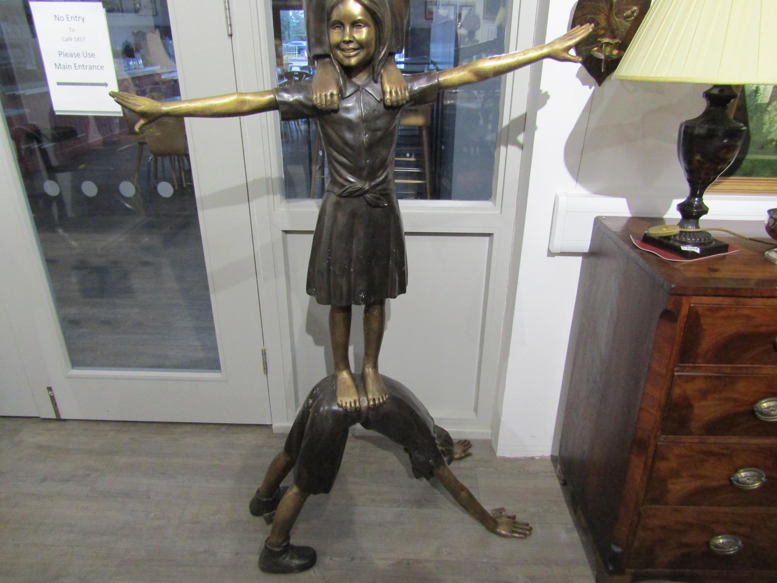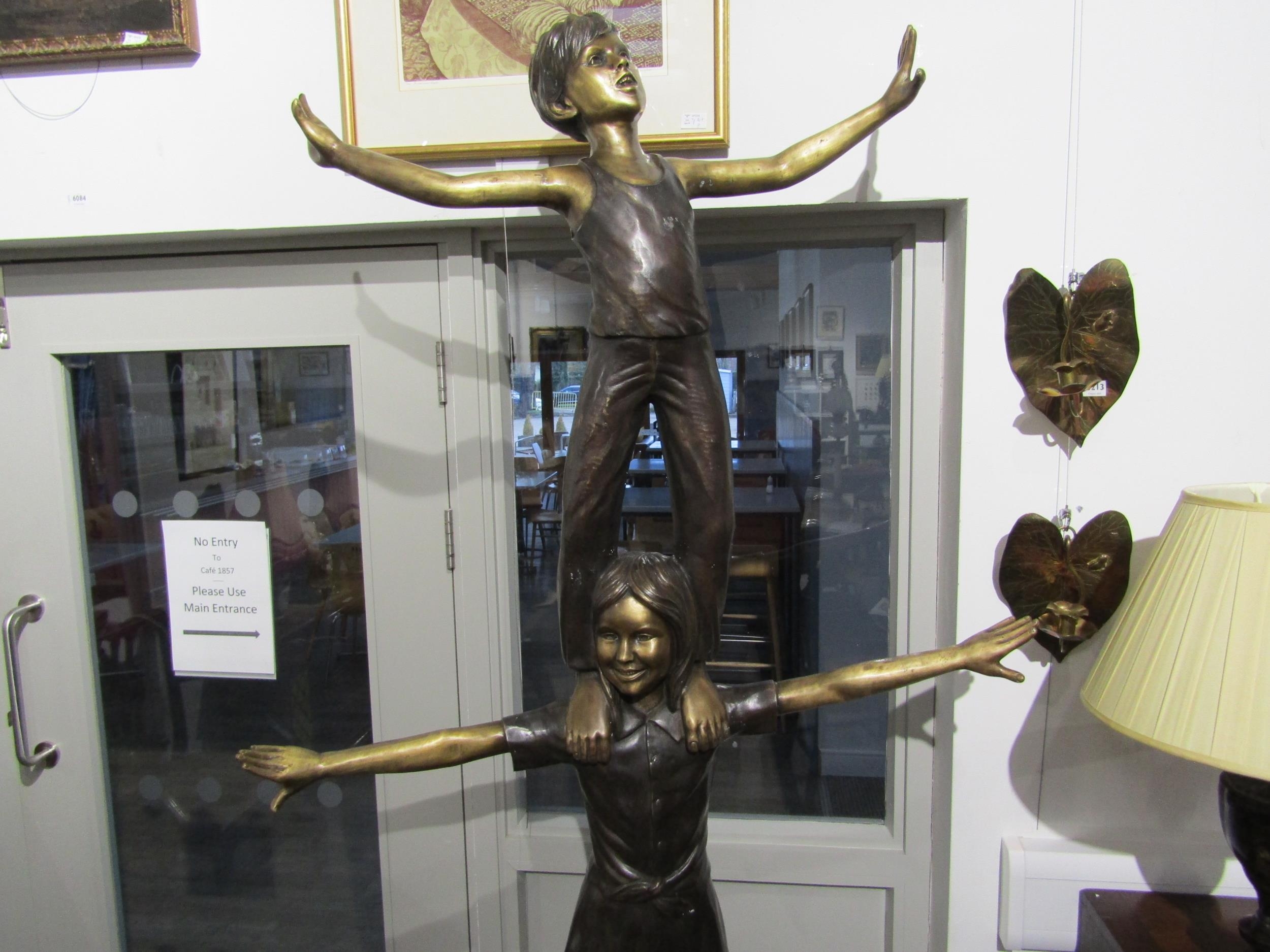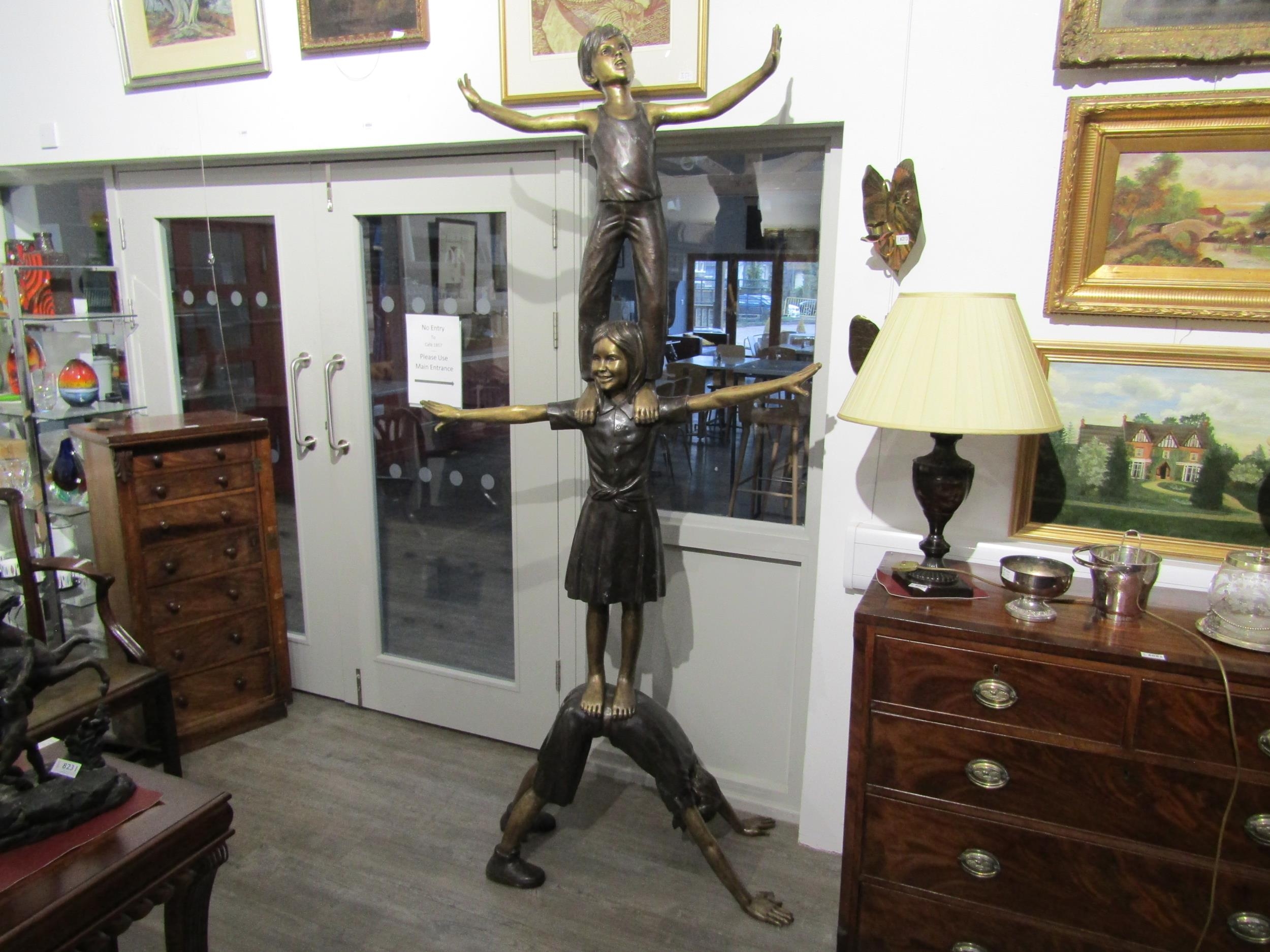 A bronze sculpture of three children balancing on each other, 222cm tall approx (C)