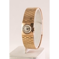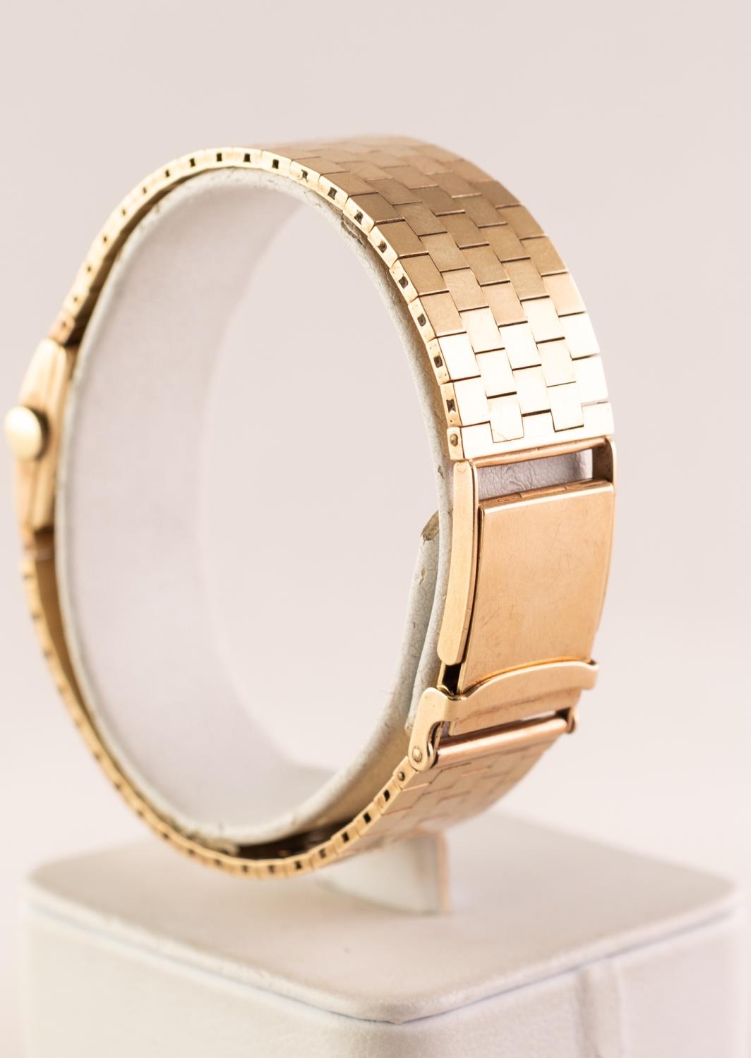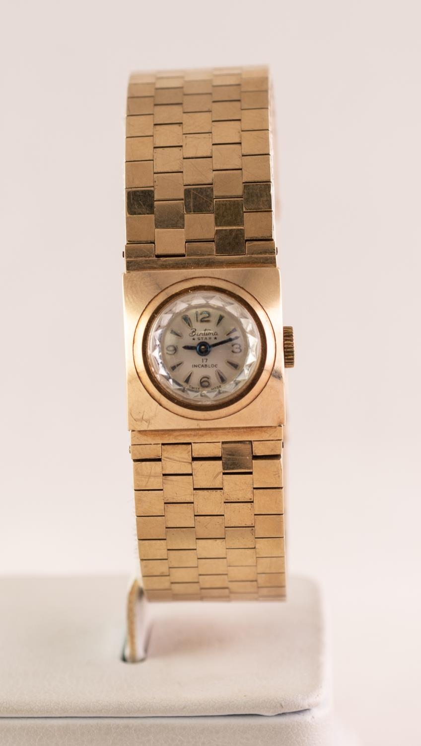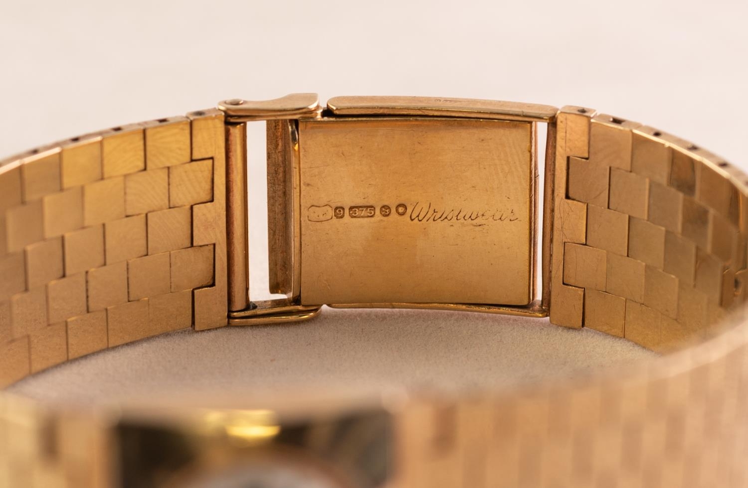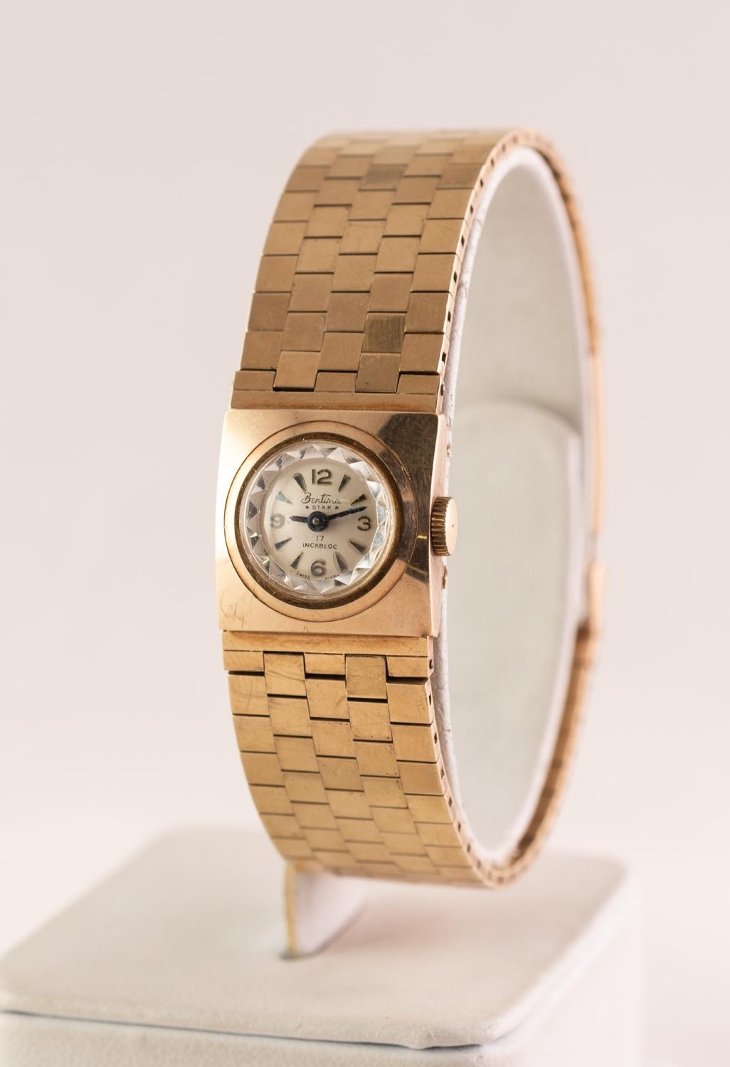 LADY'S BENTIMA STAR 9ct GOLD BROAD BRACELET WATCH with 17 jewels incabloc mechanical movement, tiny circular silvered dial, with four arabic numerals and batons, in square case with integral brick pattern flexible bracelet, London 1968, 39.4 gms gross, is associated case, (c/r good and working)