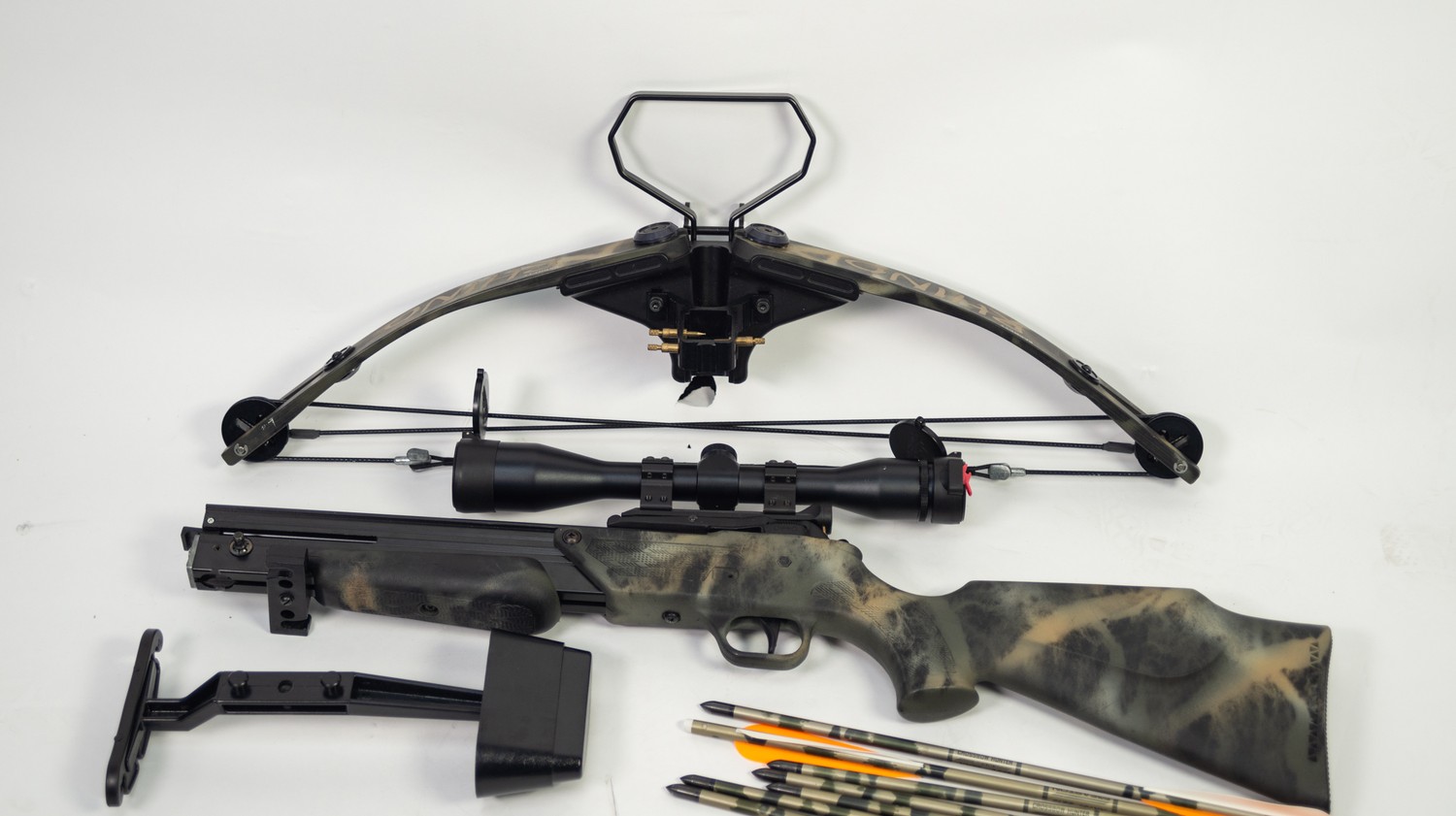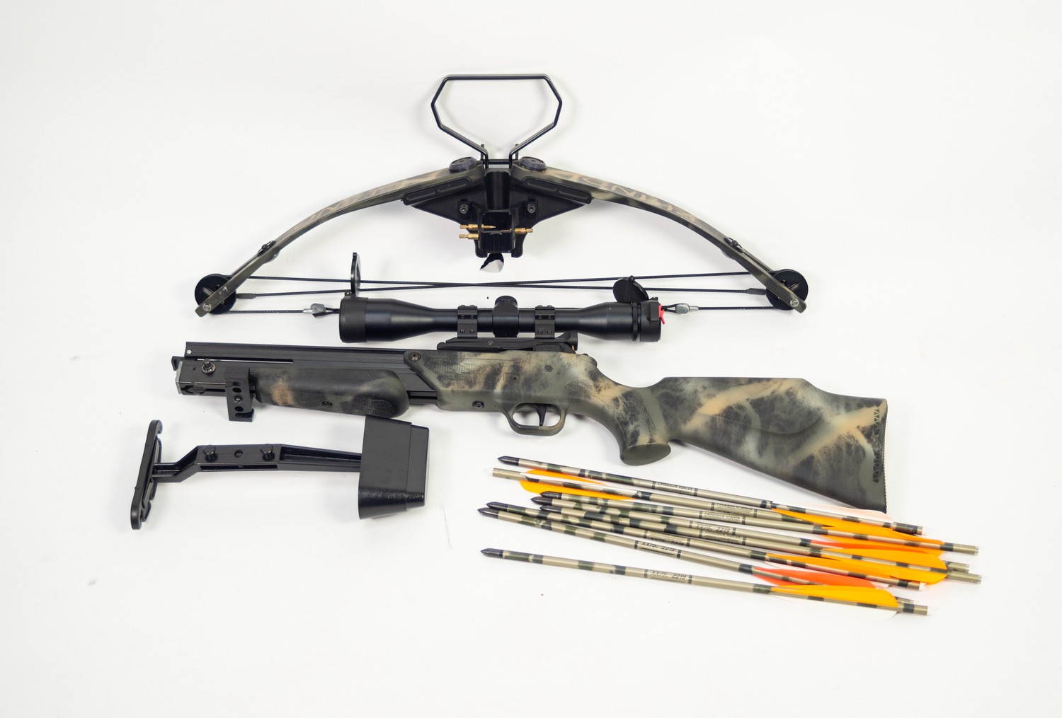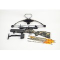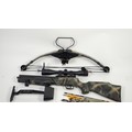 BARNETT RHINO HUNTER CROSSBOW IN CAMO, fitted with a RWS SIGHT, supplied with ORIGINAL SIGHT, BOW QUIVER and SET OF EIGHT EASTON XX75, 2219 ARROWS, in an unbranded soft quilted green and shoulder case with brown leather trim PLEASE NOTE: THIS LOT CANNOT BE PURCHASED BY ANYONE UNDER THE AGE OF 18 AND PROOF OF AGE WILL BE REQUIRED