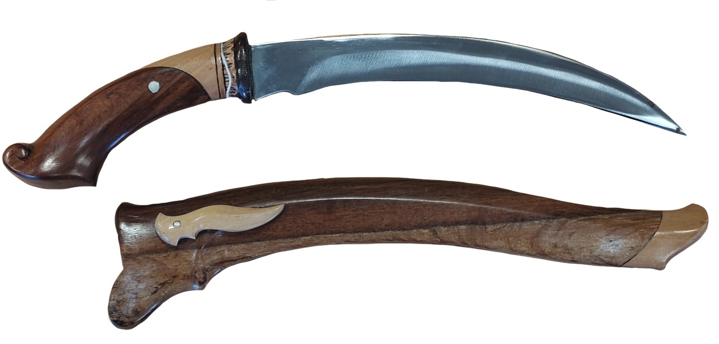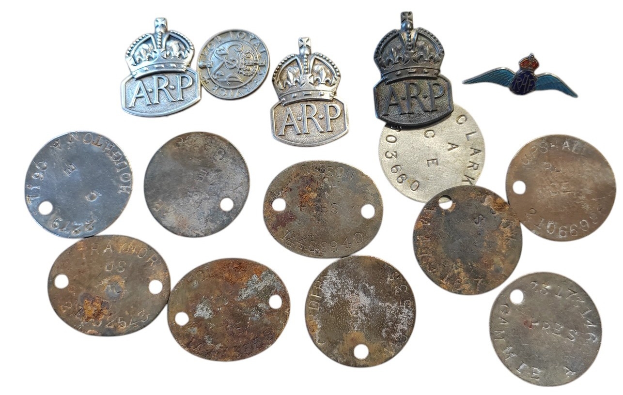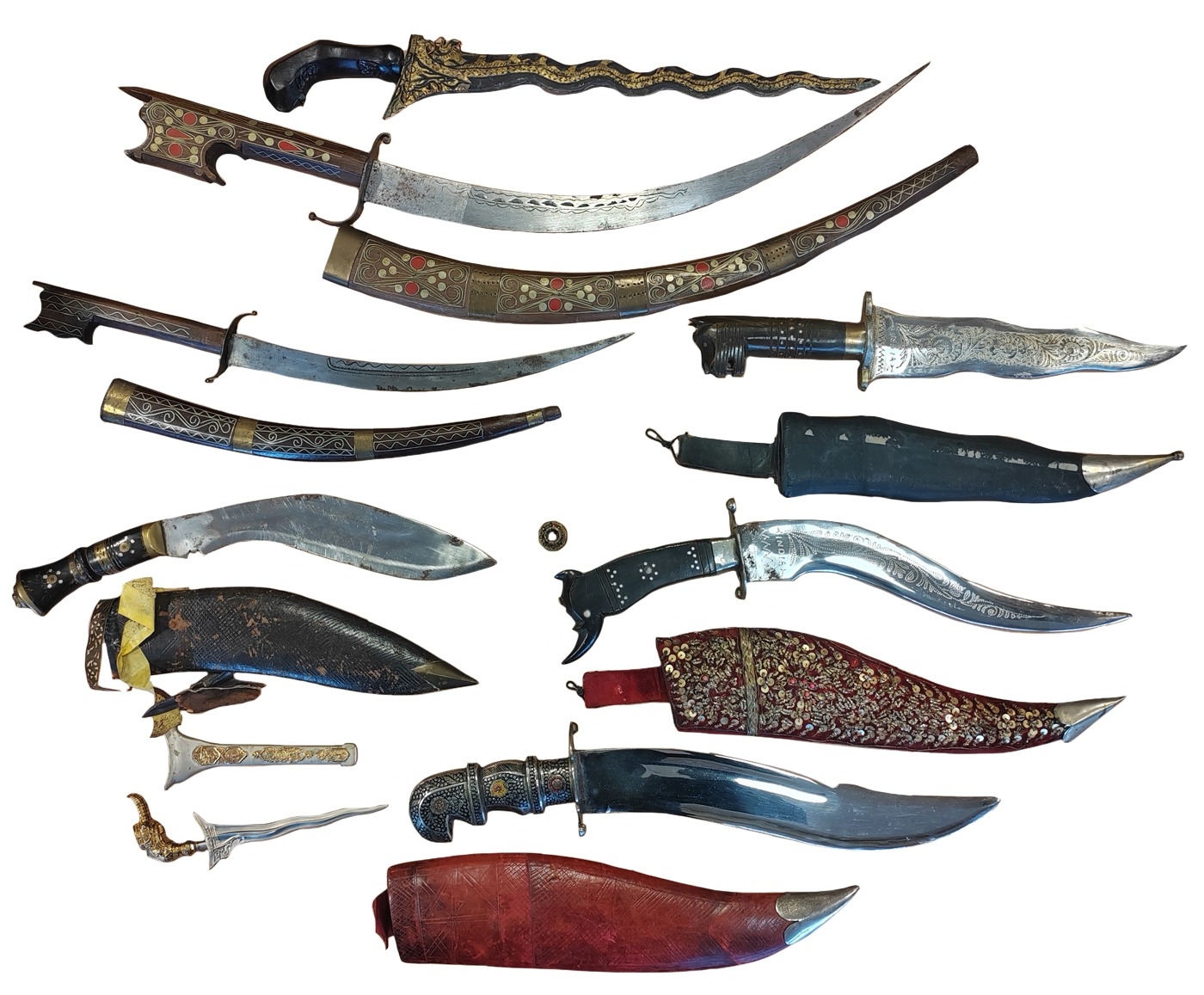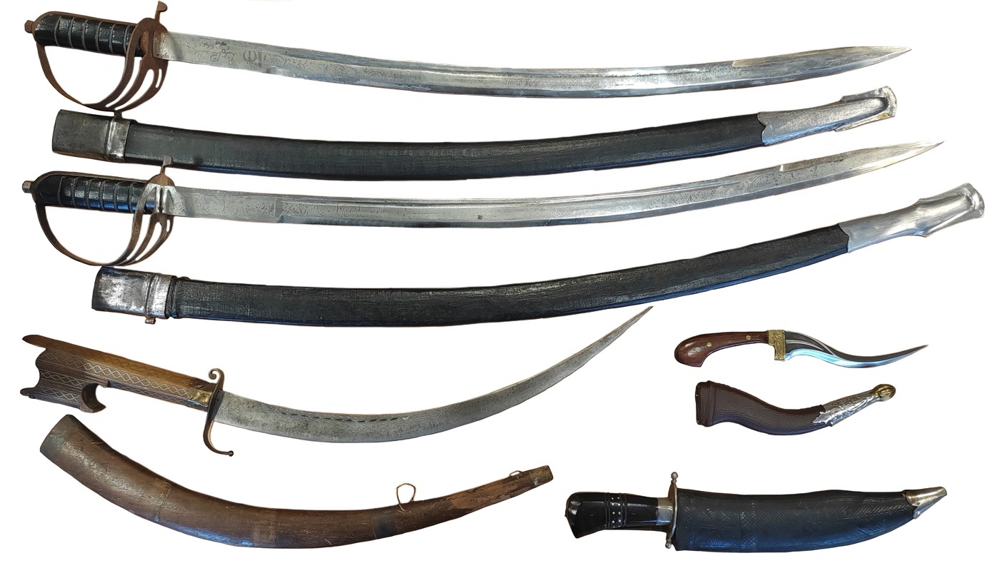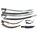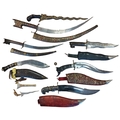 Collection of Indian Kirpans and Kukris of various designs and sizes mostly blunted, Indonesian Kris knife, modern Korambi (very sharp), plus reproduction (tourist piece) Indian Army Pattern Cavalry Trooper's Sword (2) and range of WW1 identification tags and disc. BUYER MUST COLLECT (B)