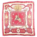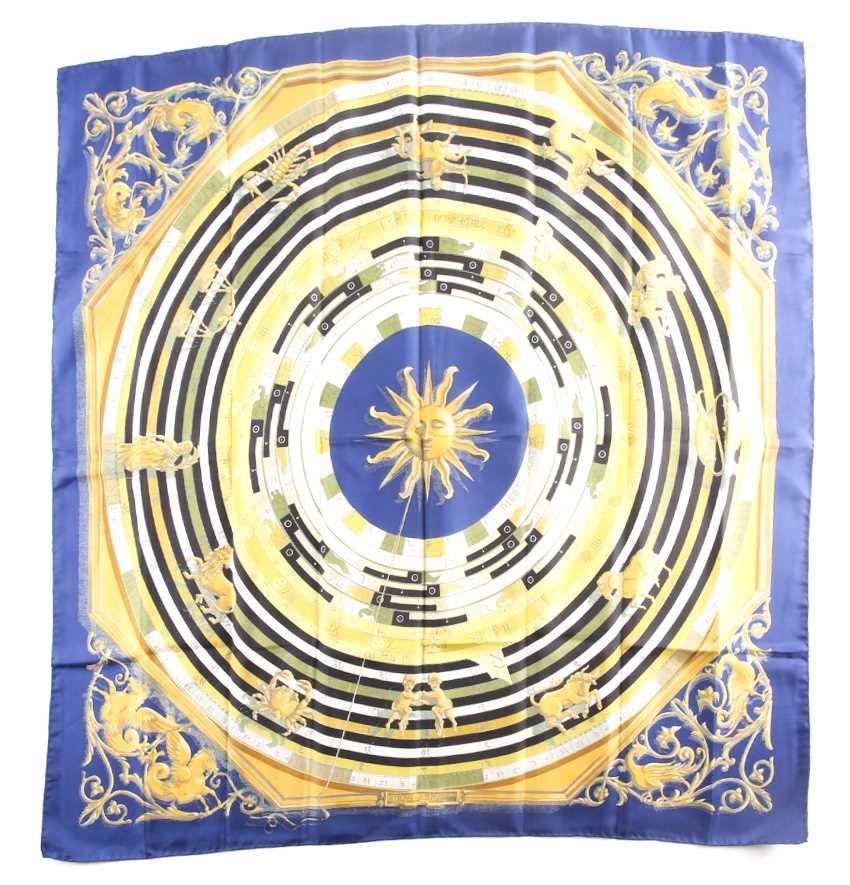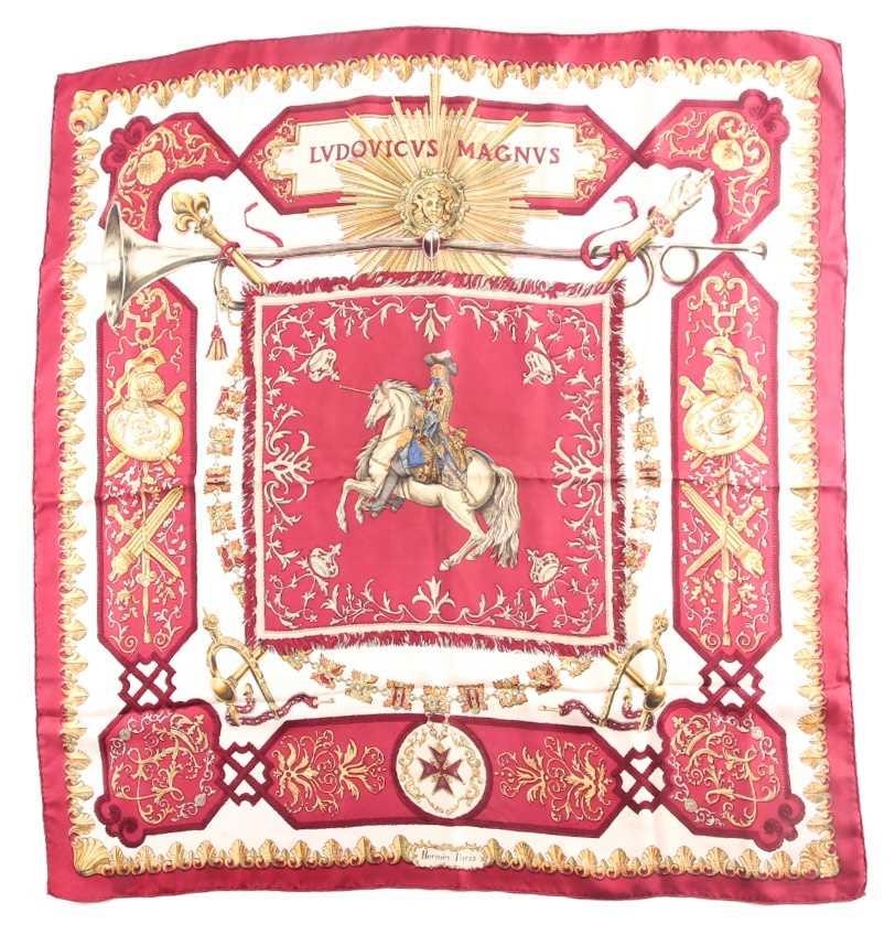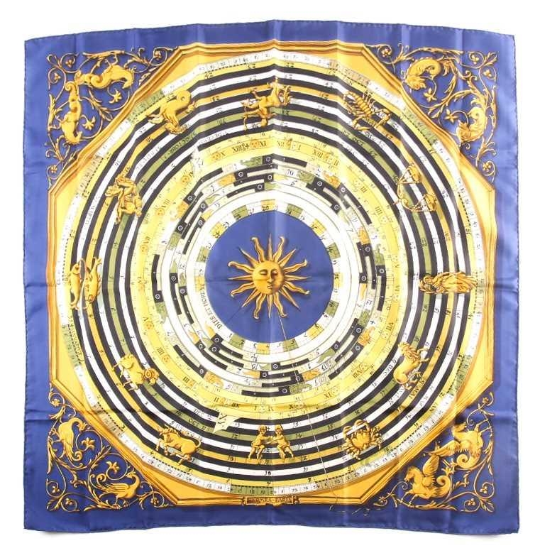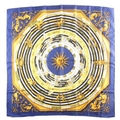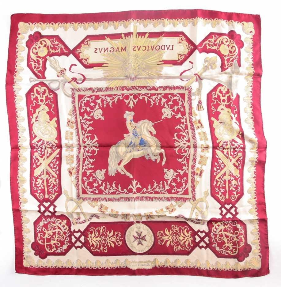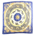 Hermes, Paris. A polychrome zodiac scarf, with dark blue border, together with a Hermes scarf with the Ludovicus Magnus design by F.de La Perriere. (2)