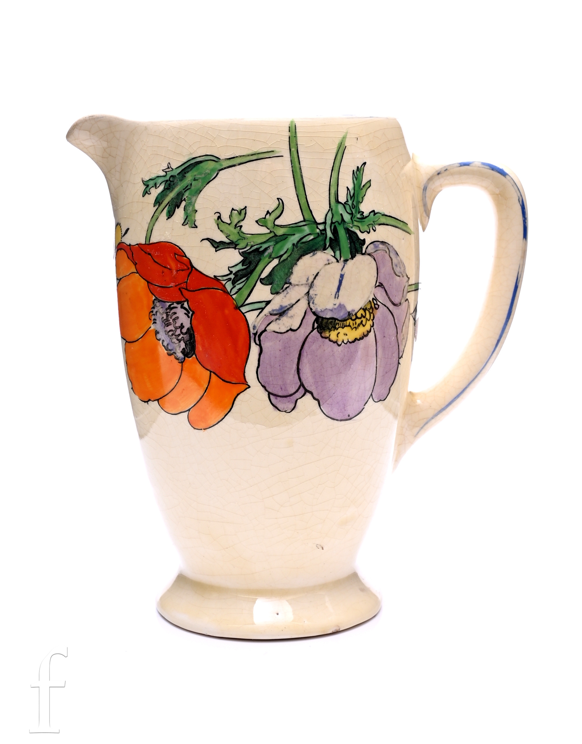 A 1930s A.J.Wilkinson Coronet jug in the Japonica pattern with transfer printed and hand enamelled with flowers and foliage over a honey glaze ground, printed signature, height 16cm.