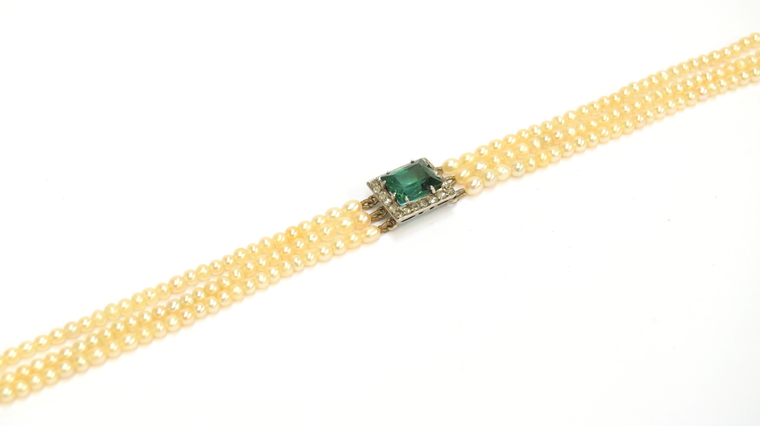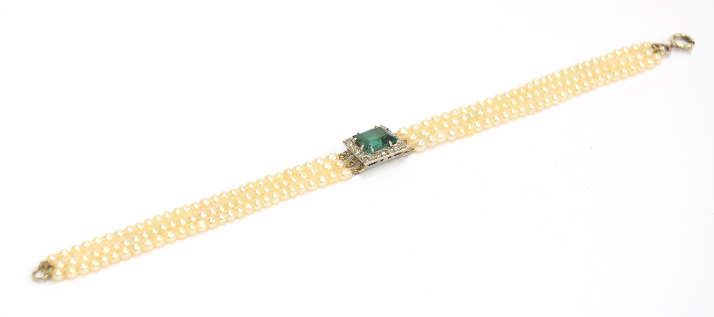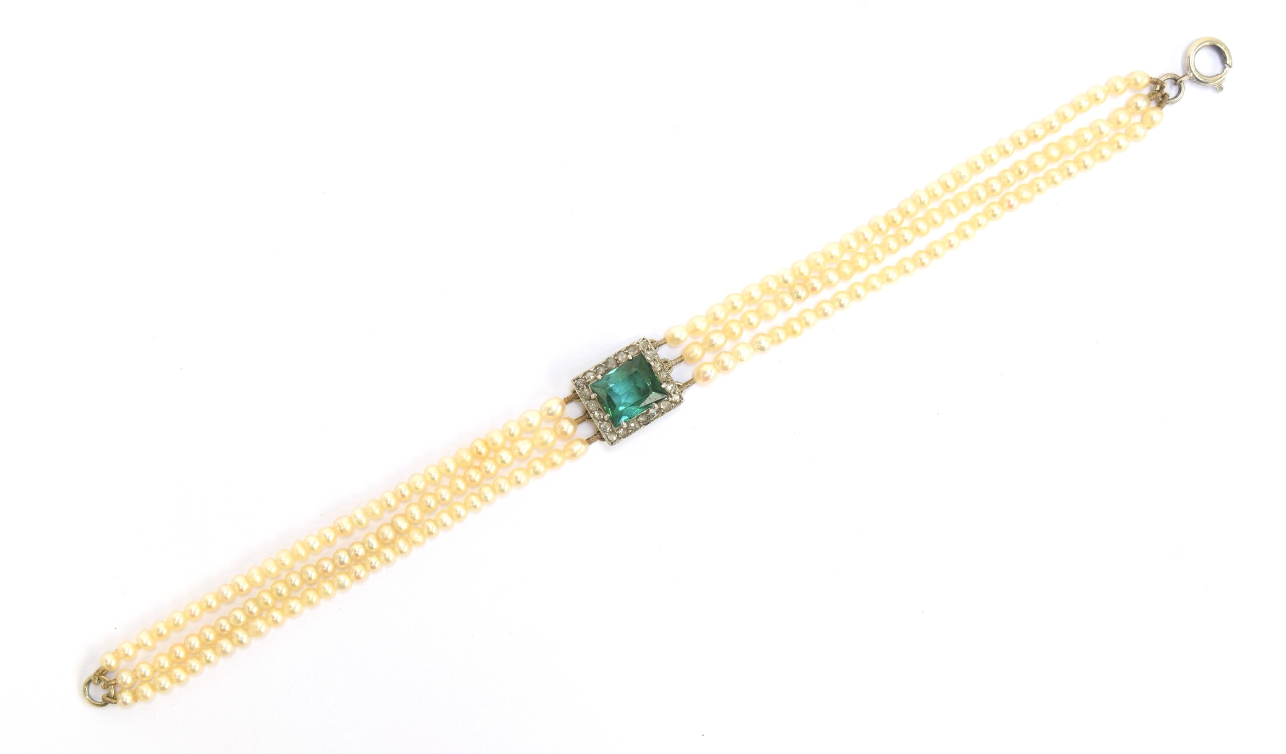 An Edwardian three strand seed pearl bracelet with central rectangular bluish-green tourmaline surrounded by a border of diamonds, the tourmaline 7.9x6.5mm, 16cm long unclasped, 6.3g
