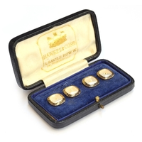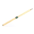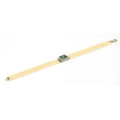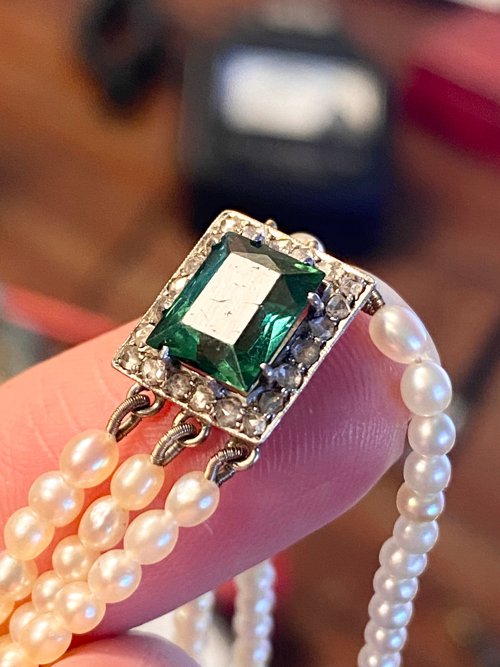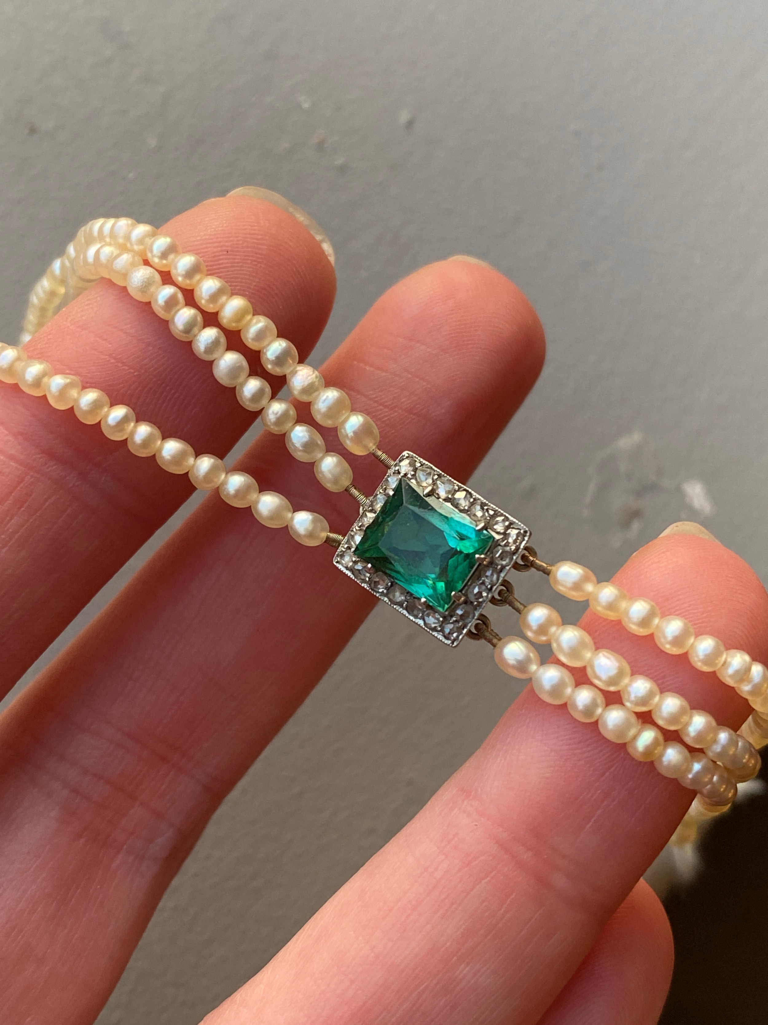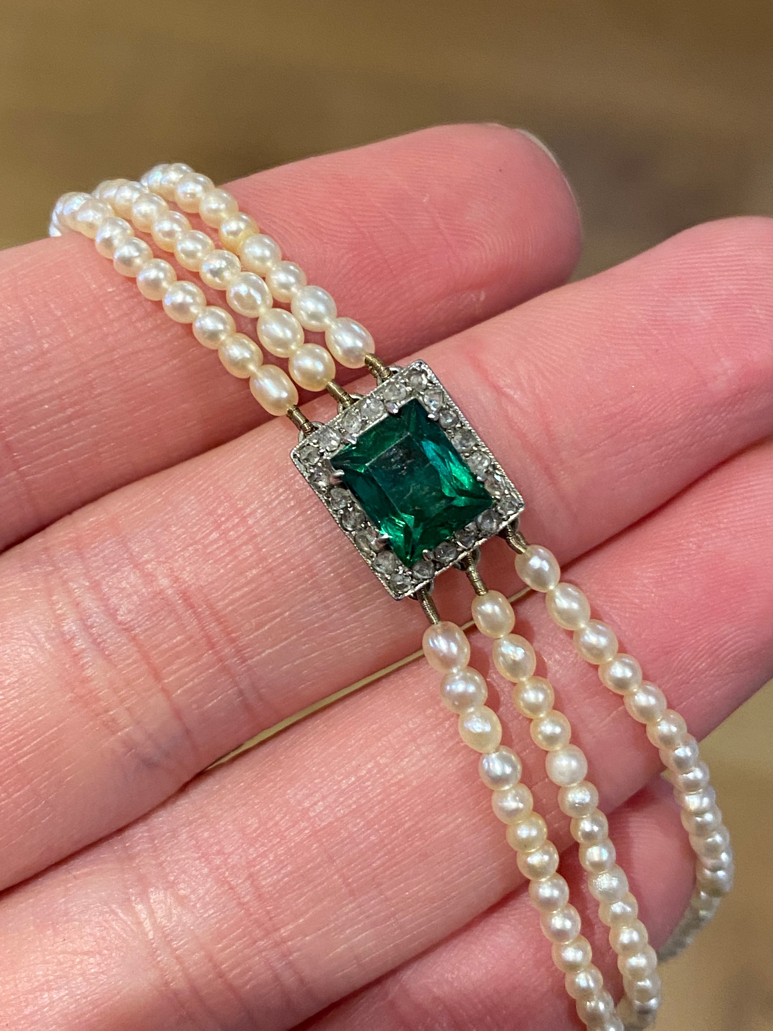 An Edwardian three strand seed pearl bracelet with central rectangular bluish-green tourmaline surrounded by a border of diamonds, the tourmaline 7.9x6.5mm, 16cm long unclasped, 6.3g