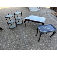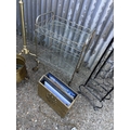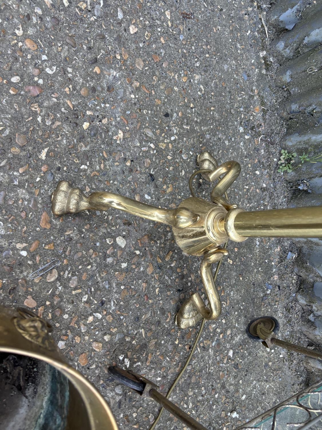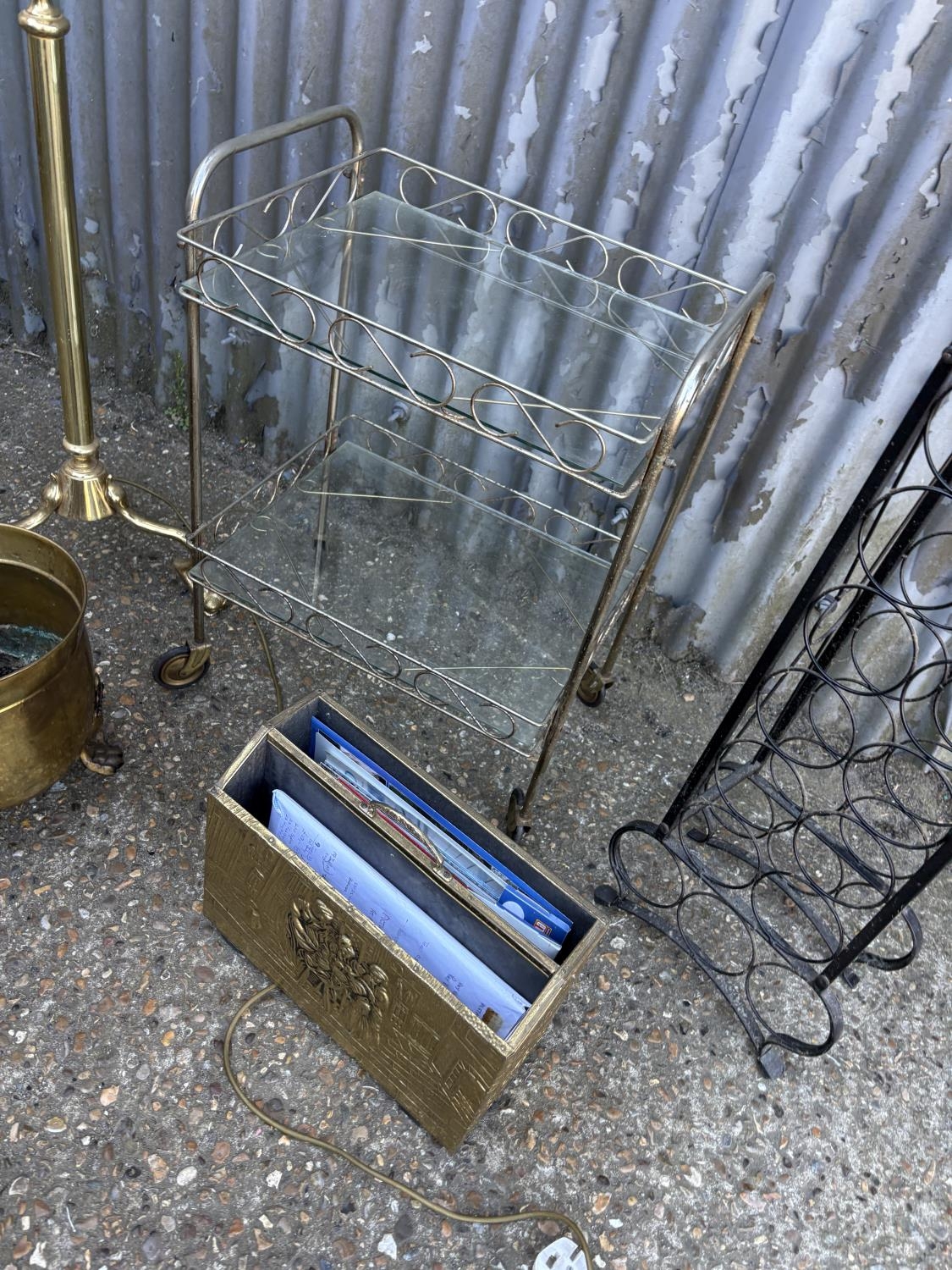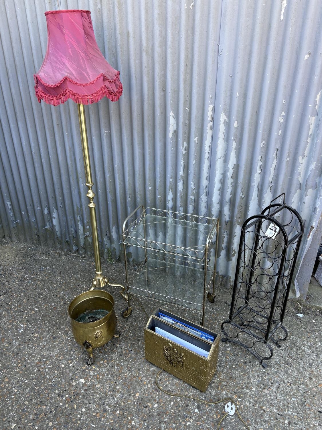 Brass standard lamp, retro trolley, wine rack, brass planter and paper rack
