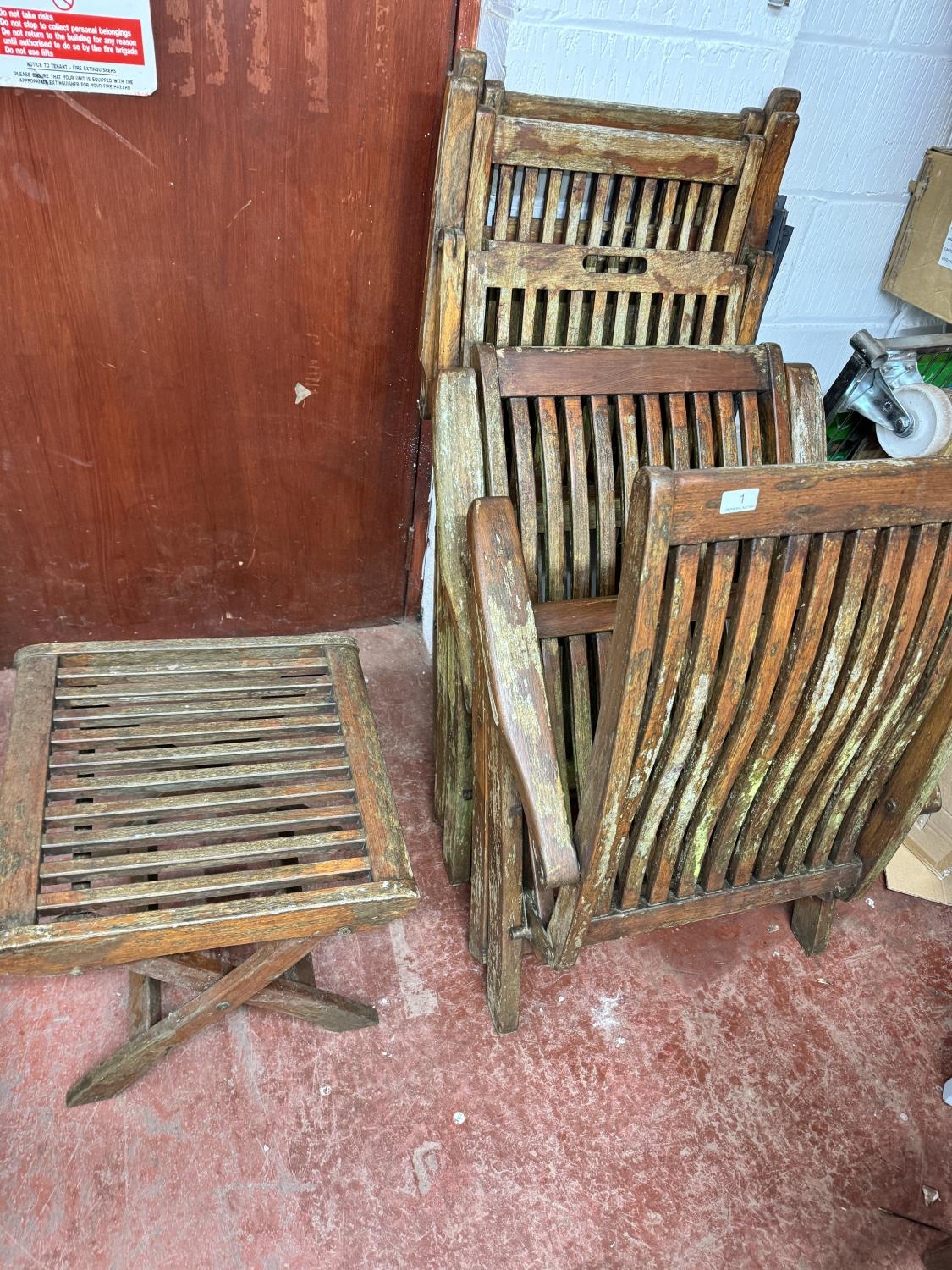 4 WOODEN RECLINING GARDEN CHAIRS & STOOL