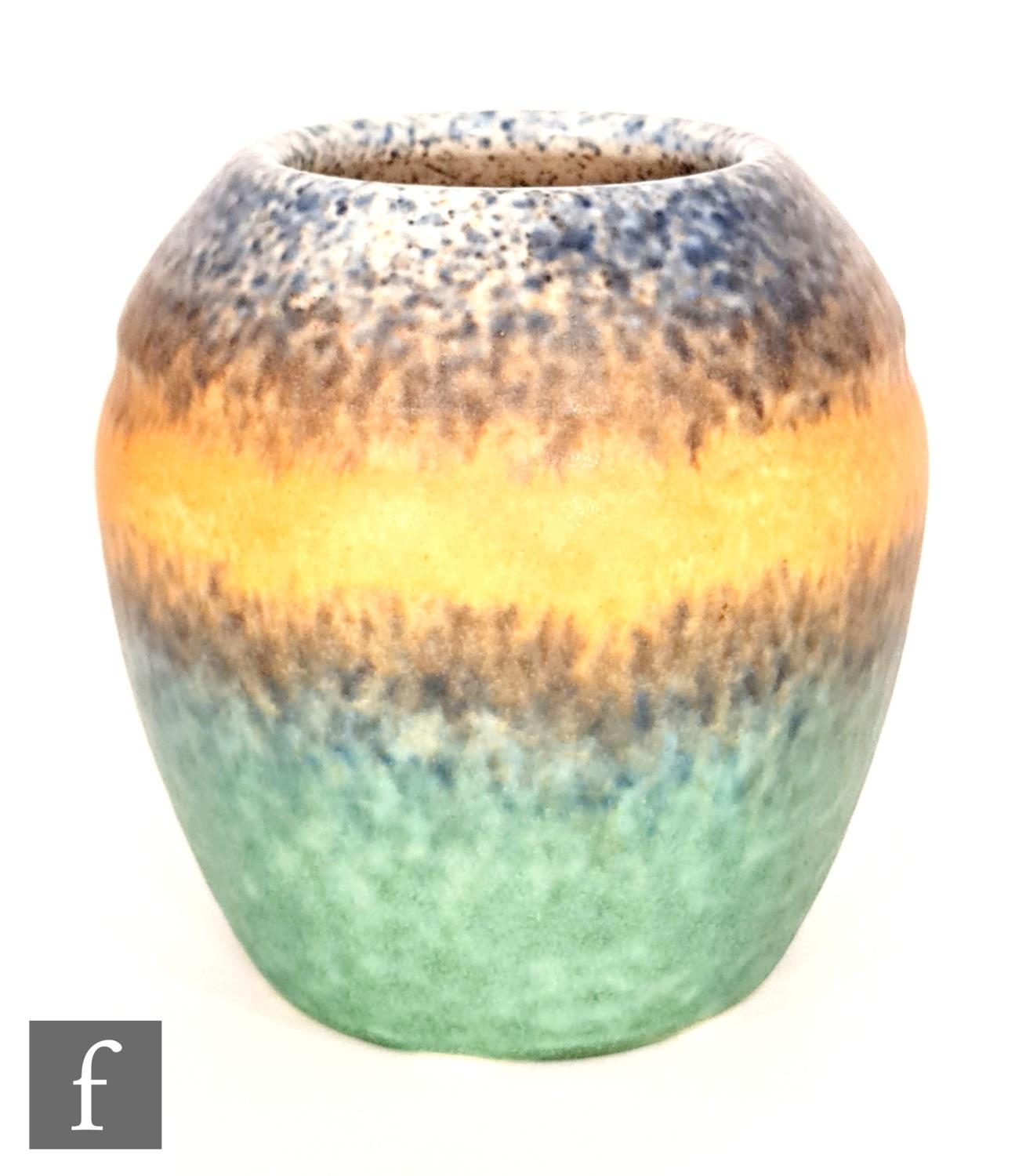 Ruskin Pottery - A vase of swollen ovoid form with a slight banding to the shoulder decorated with a mottled blue to orange to mottled blue green glaze, impressed mark, height 15cm.