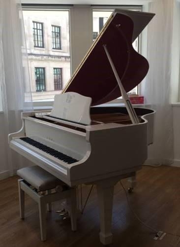 Kawai A recent 5ft Model GM10 grand piano in a bright white case on square tapered legs; together with a stool. Fitted with an IQ Air piano disc system. AMENDMENT Is a Ritter 4ft 8in grand piano.