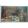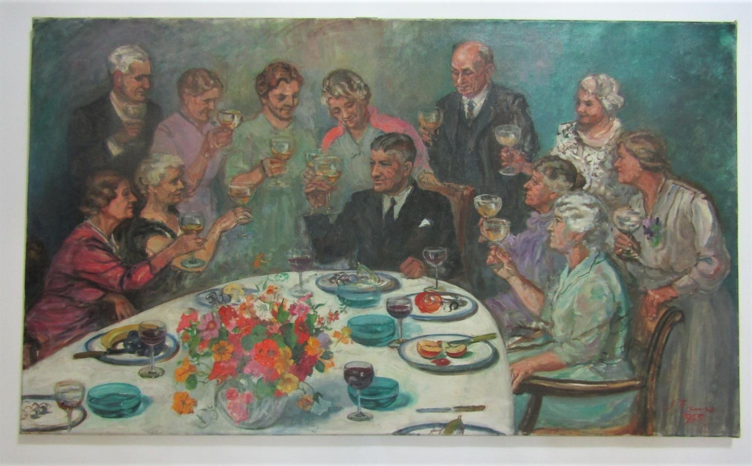 J Fare (mid-20th century school) - Scene with twelve diners surrounding a table, all raising their glass to a central seated figure, oil on canvas, signed, 70 x 120cm approx, unframed