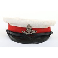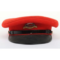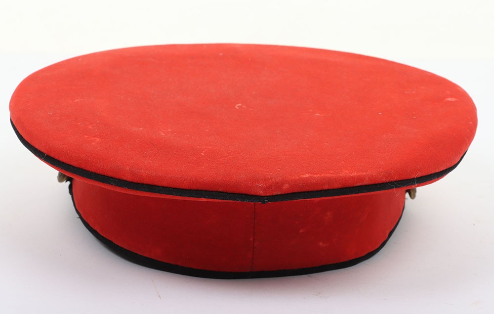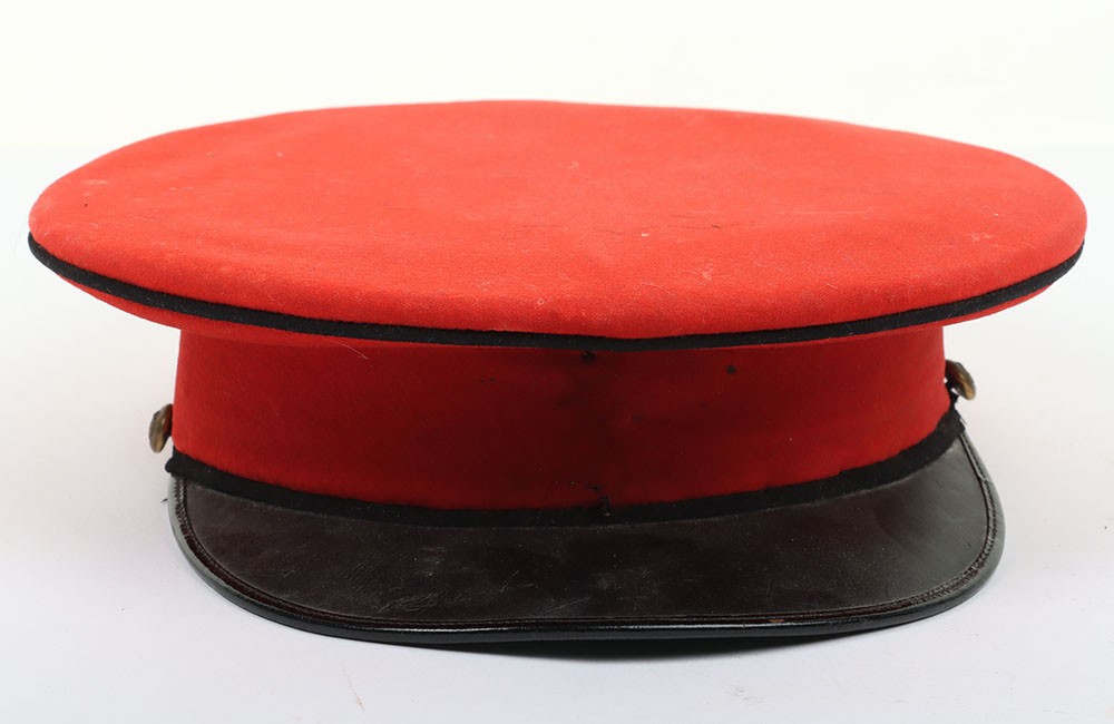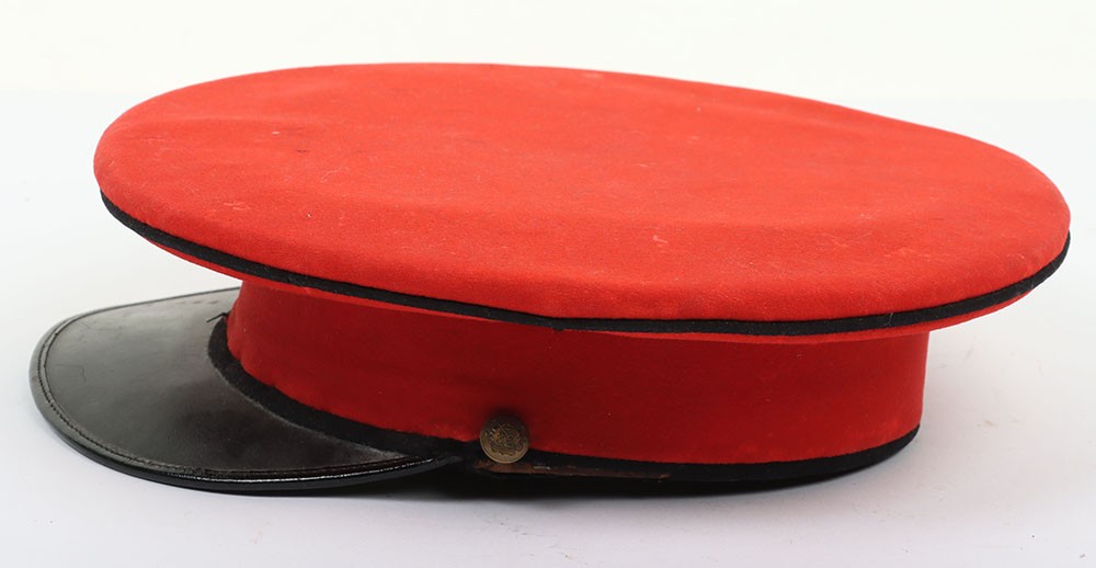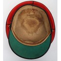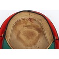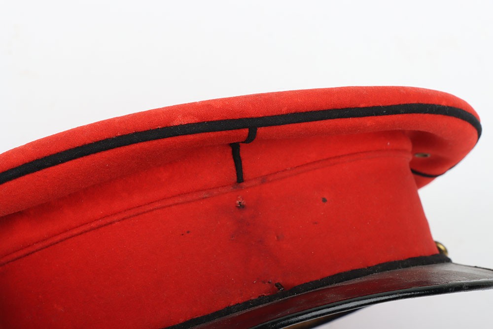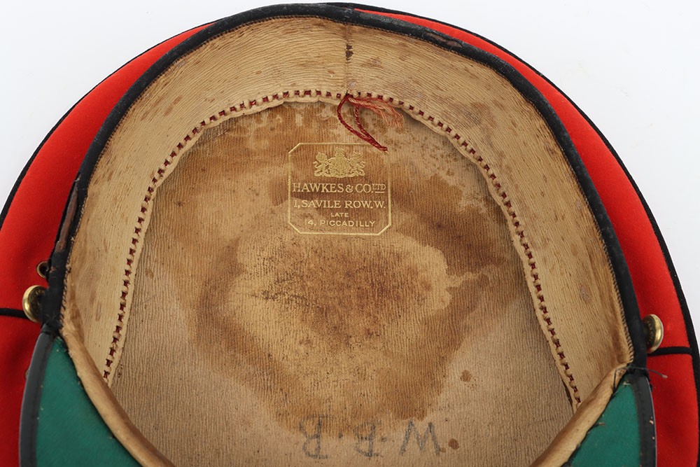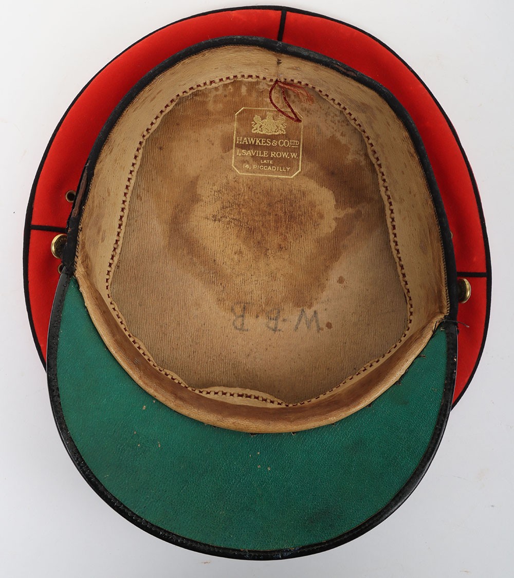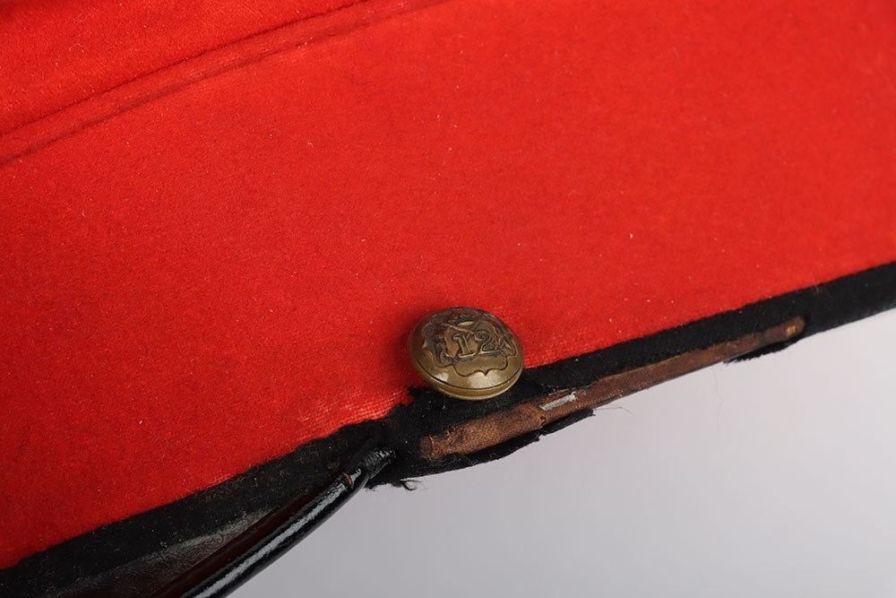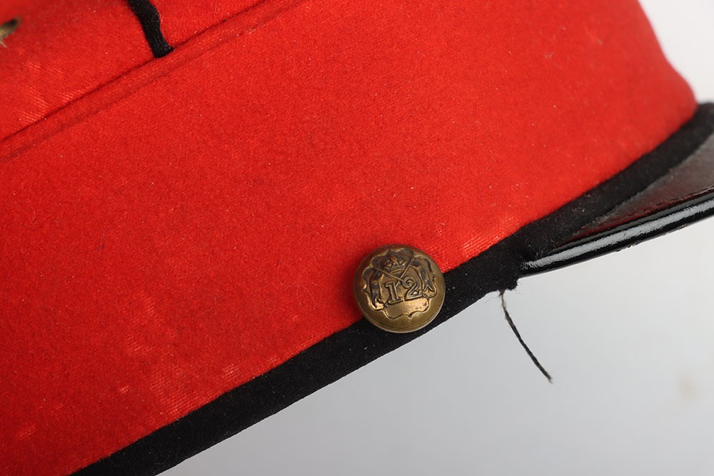 Early 20th Century 12th Lancers Other Ranks Peaked Dress Cap. A fair example of the dress cap for the 12th lancers other ranks. Scarlet wool construction with black piping to the crown. Leather peak and 12th lancers brass buttons to each side to hold the chin strap, which is unfortunately missing. Green under peak and an off white leather sweatband is in situ. A gold lettered tailors mark of 'Hawkes' is embossed to the crown inner. Age related wear and mothing, otherwise a good example.