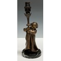 A bronze effect figural lamp, after Mednat (1890-1940), of a young girl holding a flower stem, marble base, Paris foundry mark, 32.5cm high overall