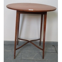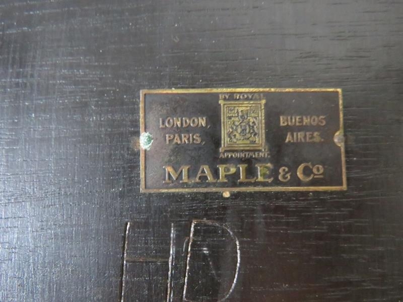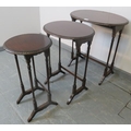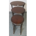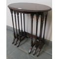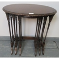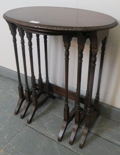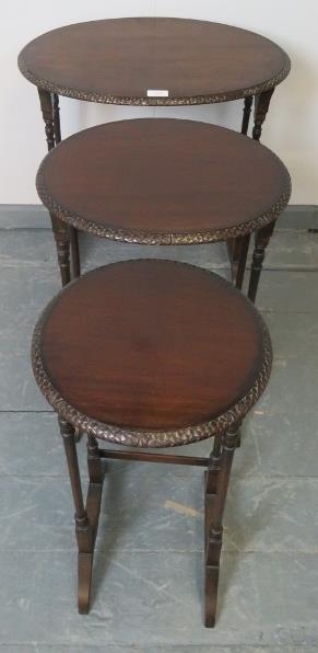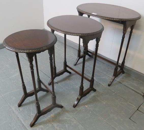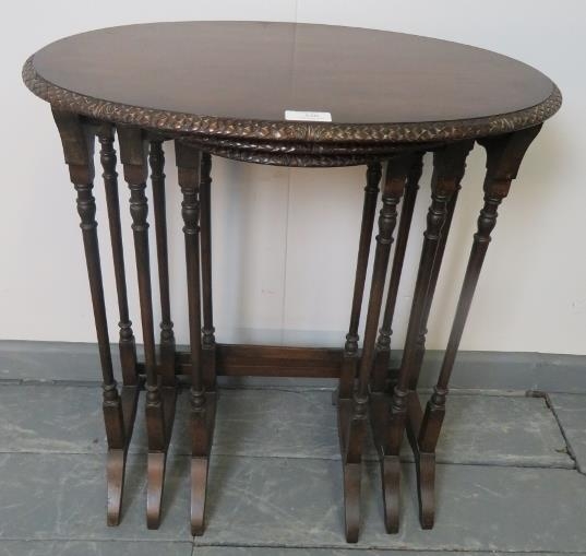 An Edwardian mahogany nest of three oval tables by Maple & Co, with foliate carved borders, on turned supports with splayed feet.