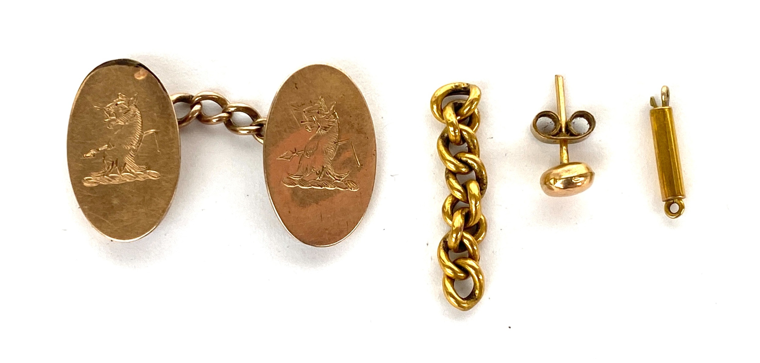 A 9ct gold cufflink; small section of chain; barrel clasp and a single earrings, gross weight 3.5g