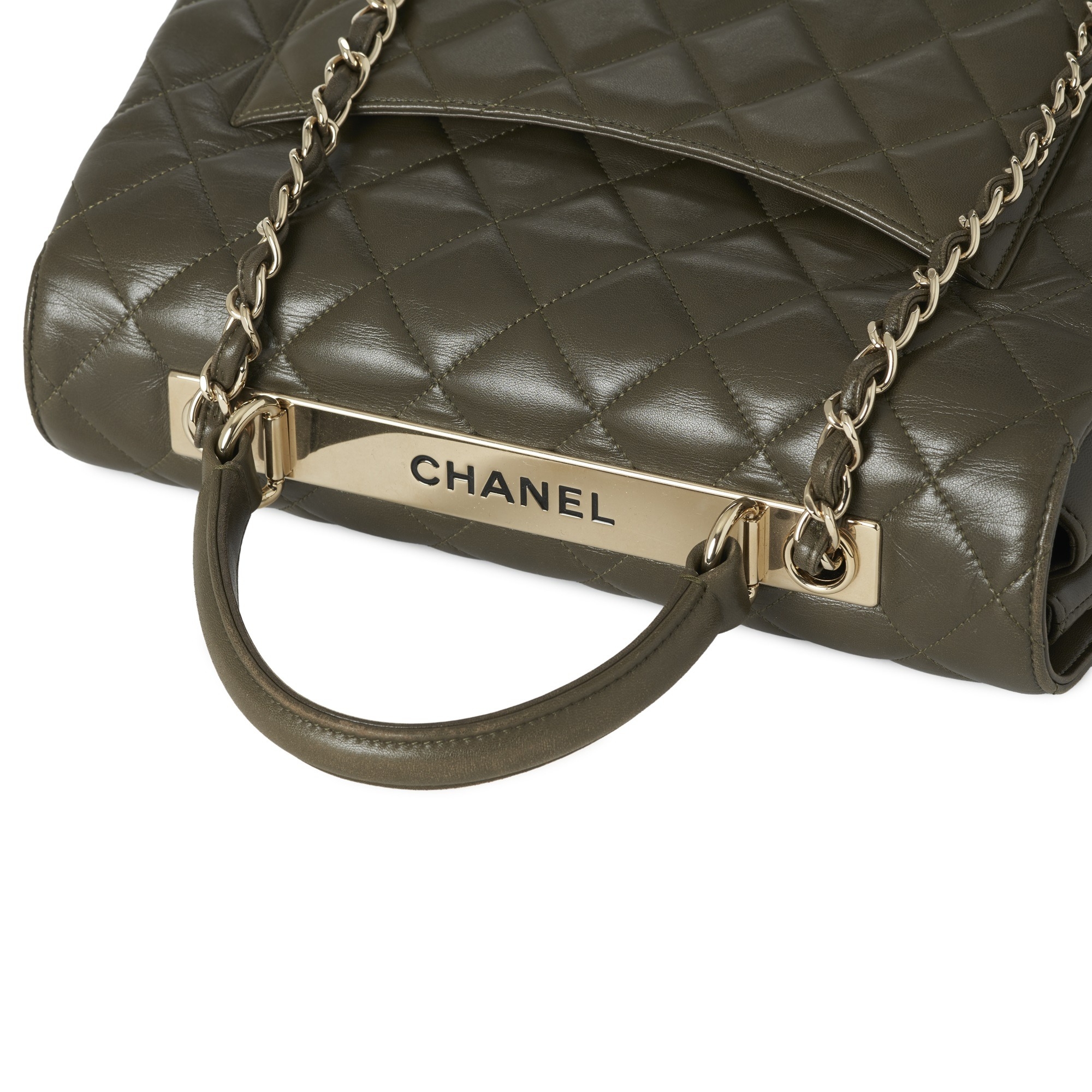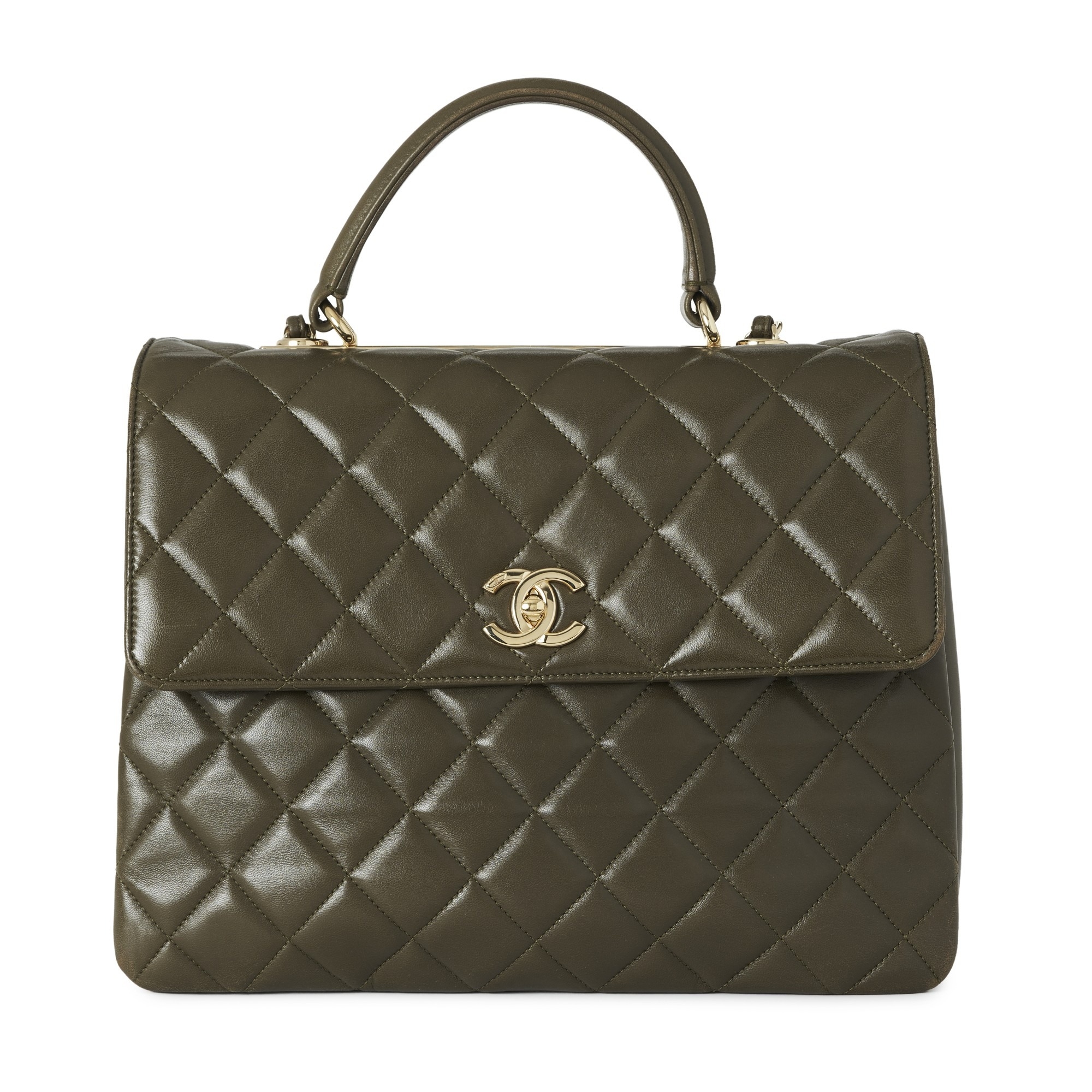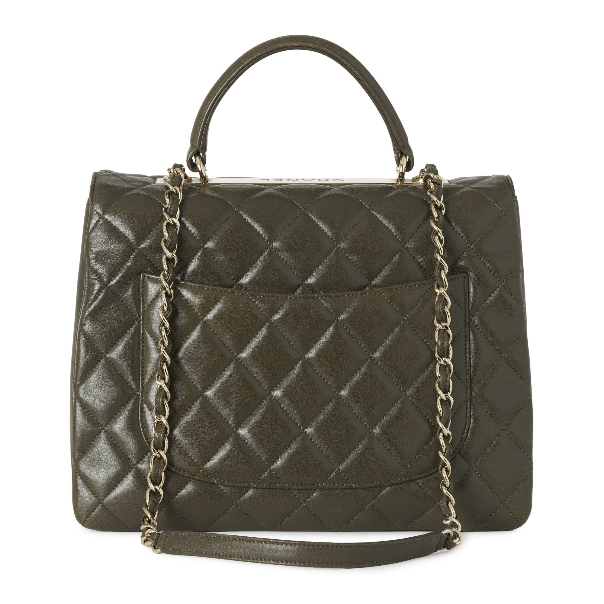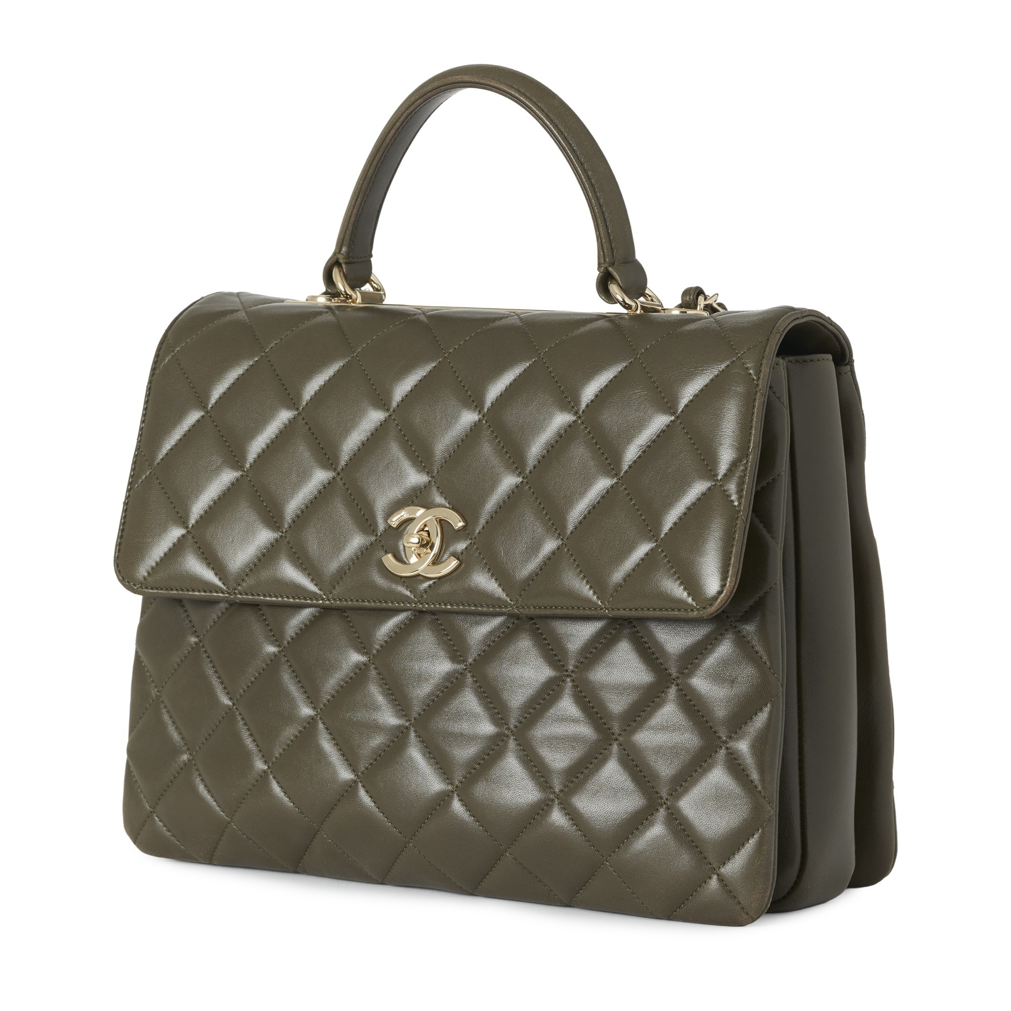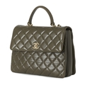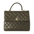 Chanel, a Trendy CC Top Handle handbag, crafted from green quilted lambskin leather with gold-tone hardware, single leather top handle, woven chain and leather shoulder strap, a rear patch pocket, CC turn-lock fastening and a burgundy leather-lined interior, measuring 10 by 22 by 26cm