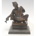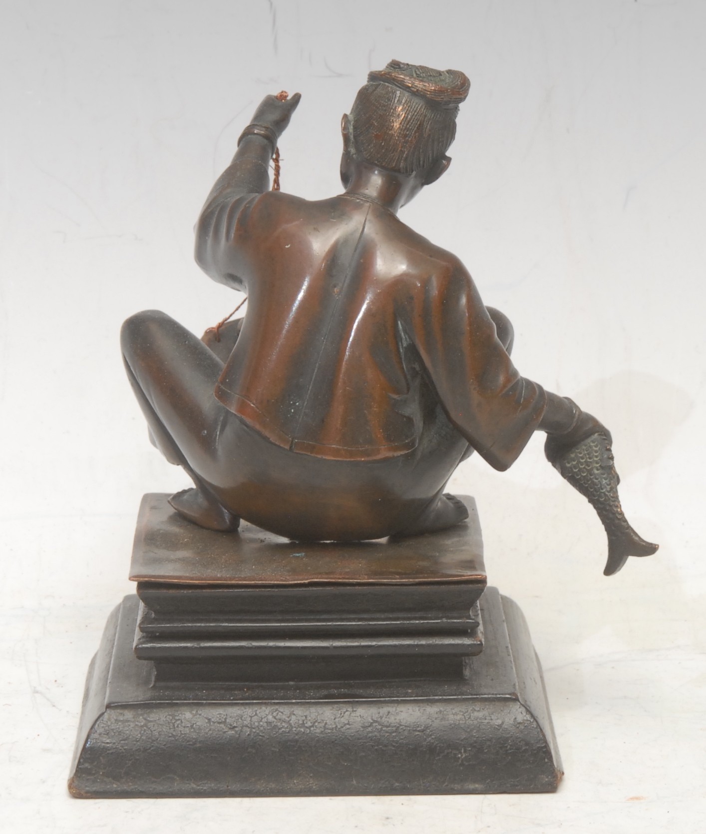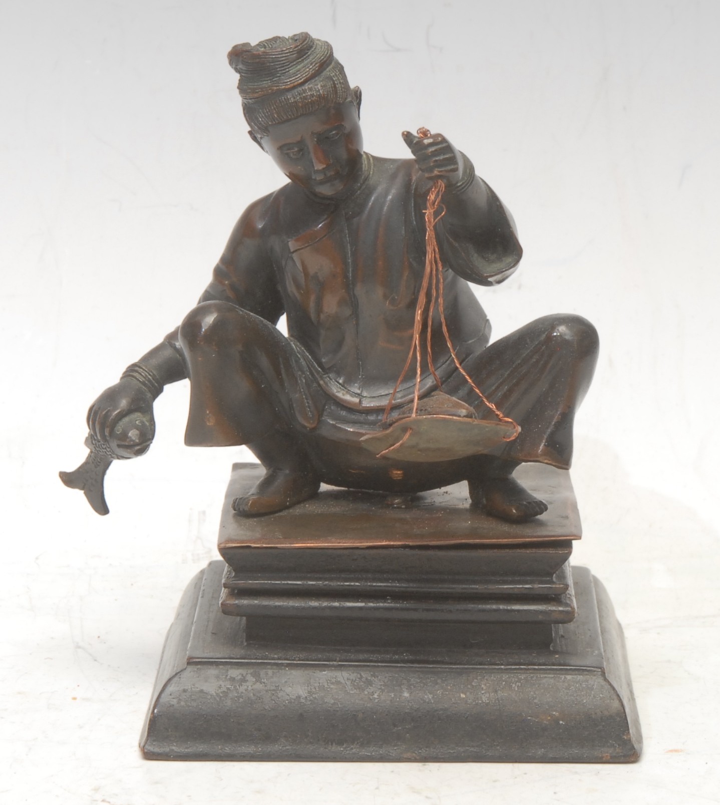 A 19th century South East Asian bronze, of a fisher-boy weighing his catch, moulded hardwood base, 12cm high, Java