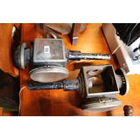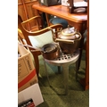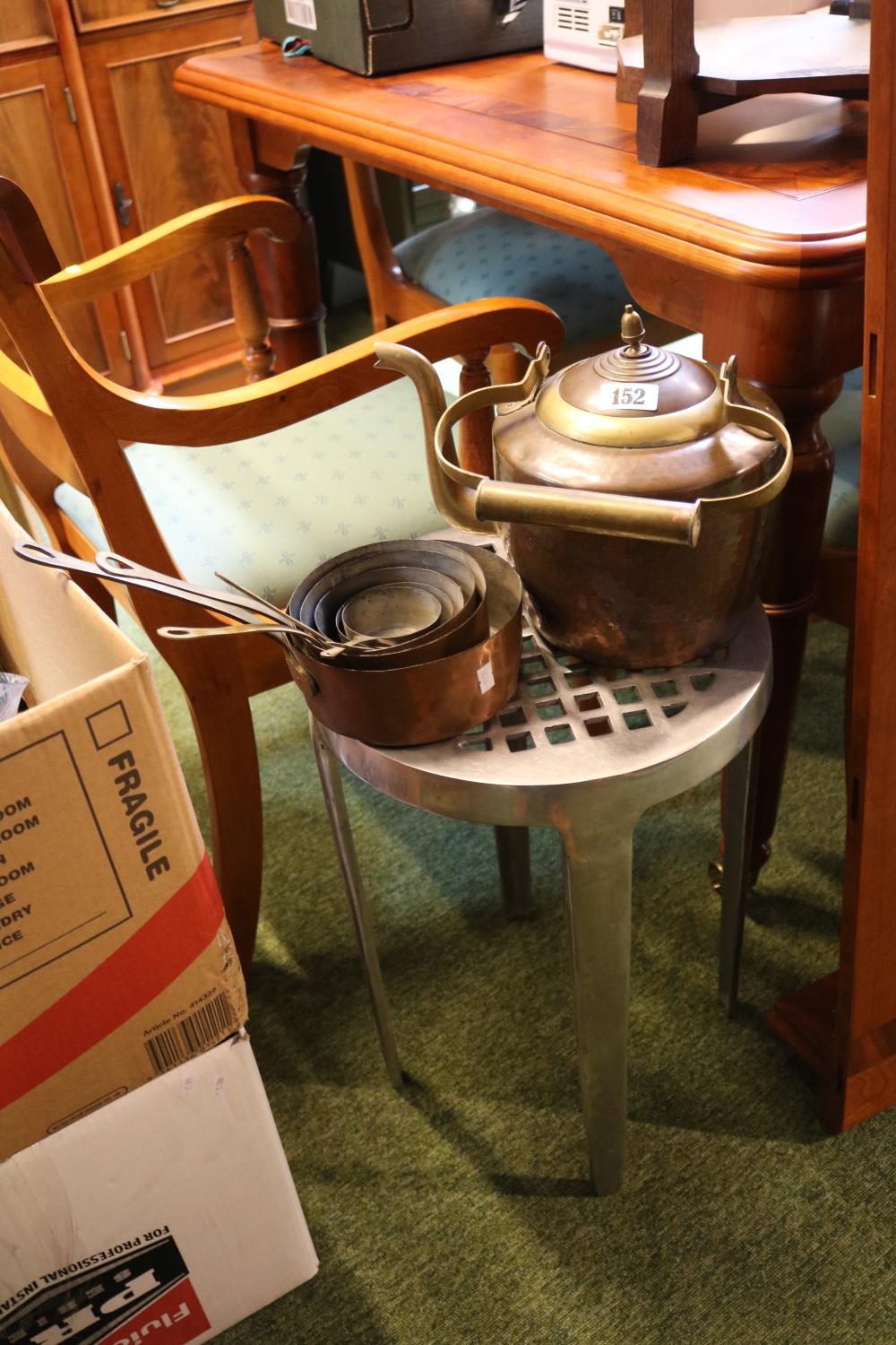 Hammered Copper Kettle with brass fittings, a Graduated set of Copper Pans with Brass Handles and a Metal pierced stool on tapering legs