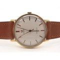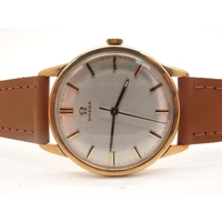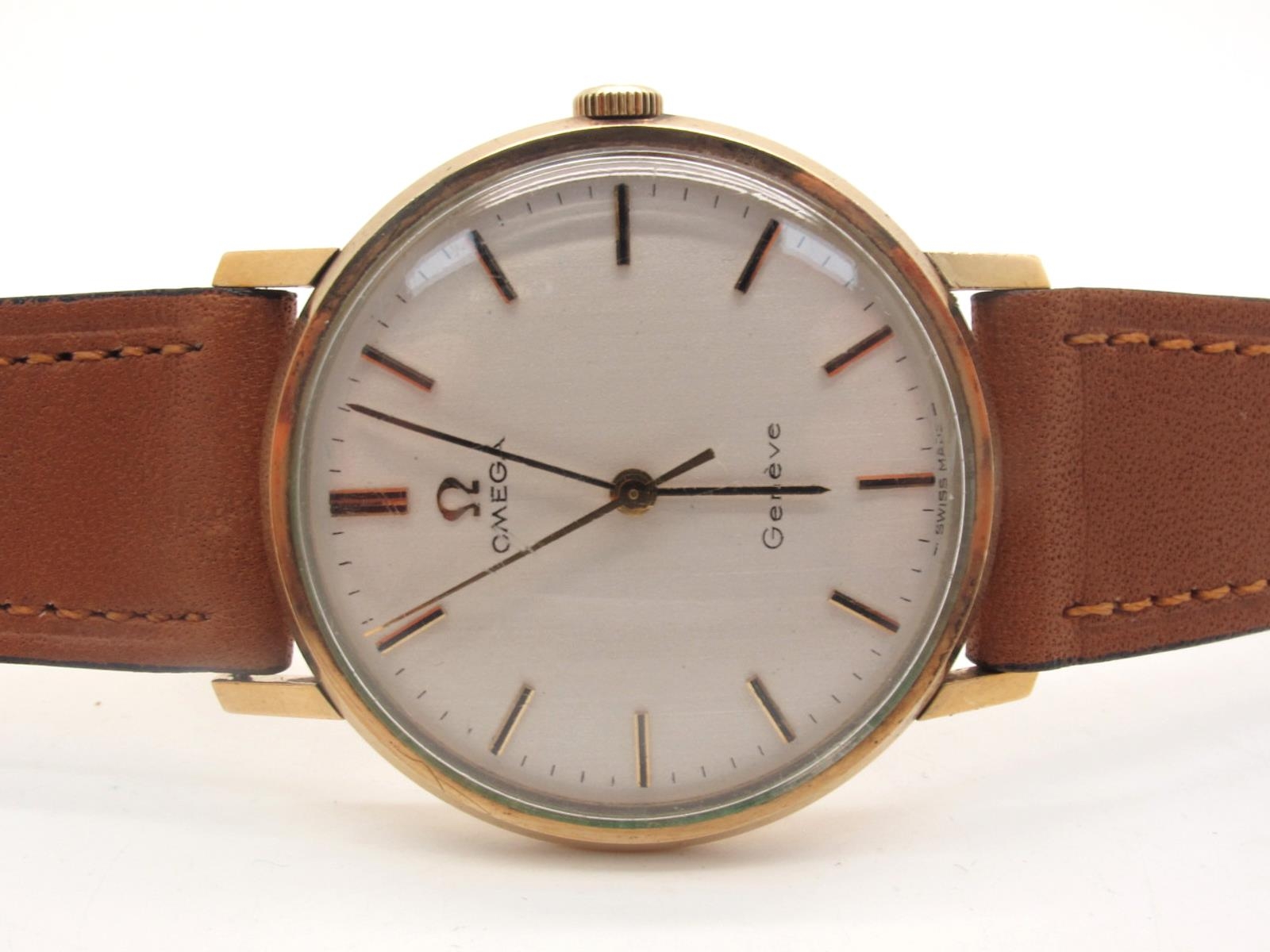 Omega; A Vintage Gent's Wristwatch, the signed dial with line markers and centre seconds (movement unseen), within plain case, on a modern strap.