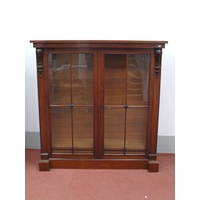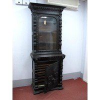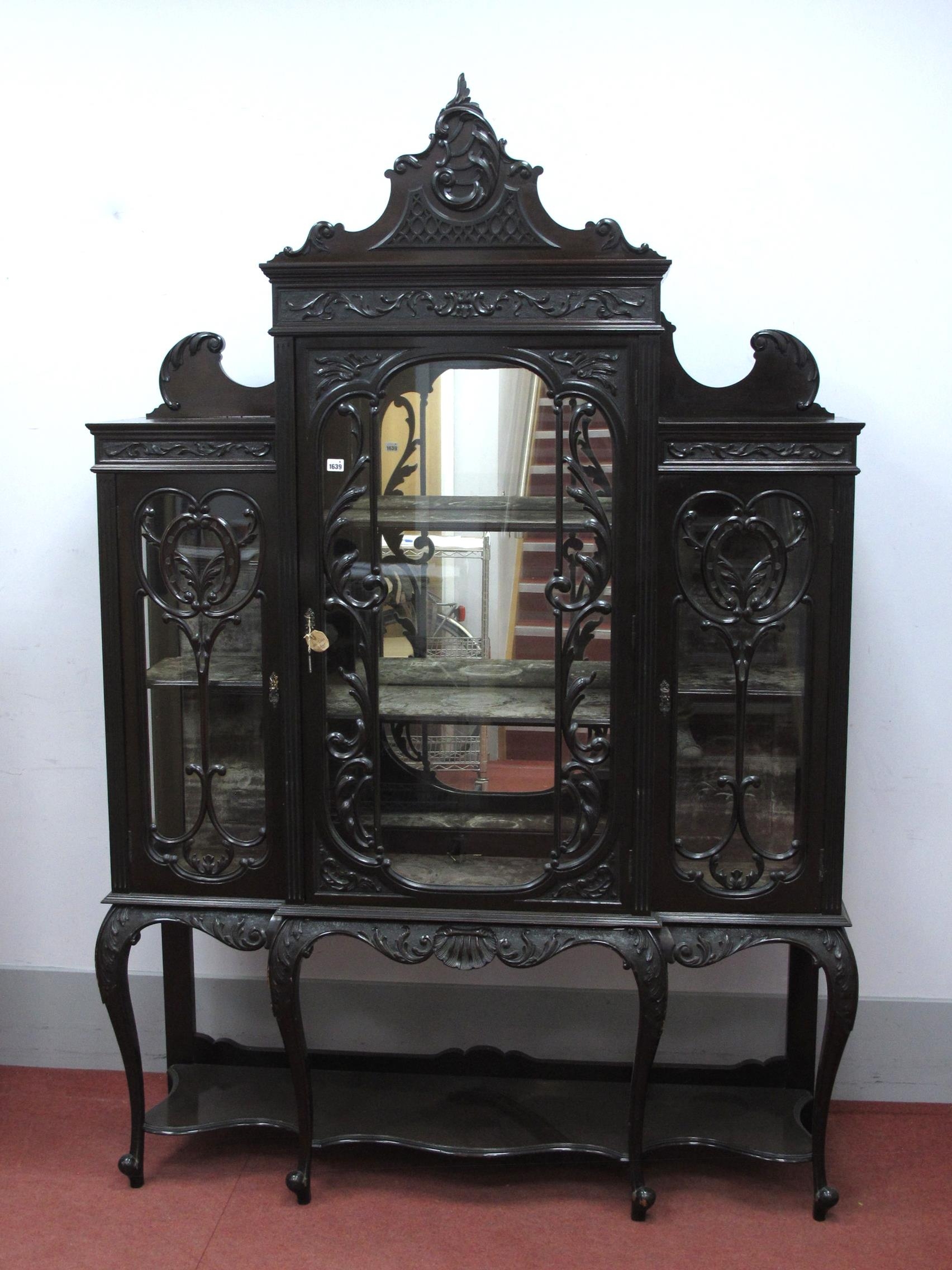 An Early XX Century Glazed Display Cabinet, the central door and flanking doors with scroll decoration, shaped apron on cabriole legs with scroll feet and undershelf, 187cm high, 140cm wide.