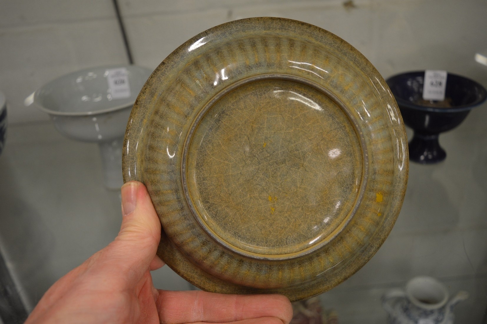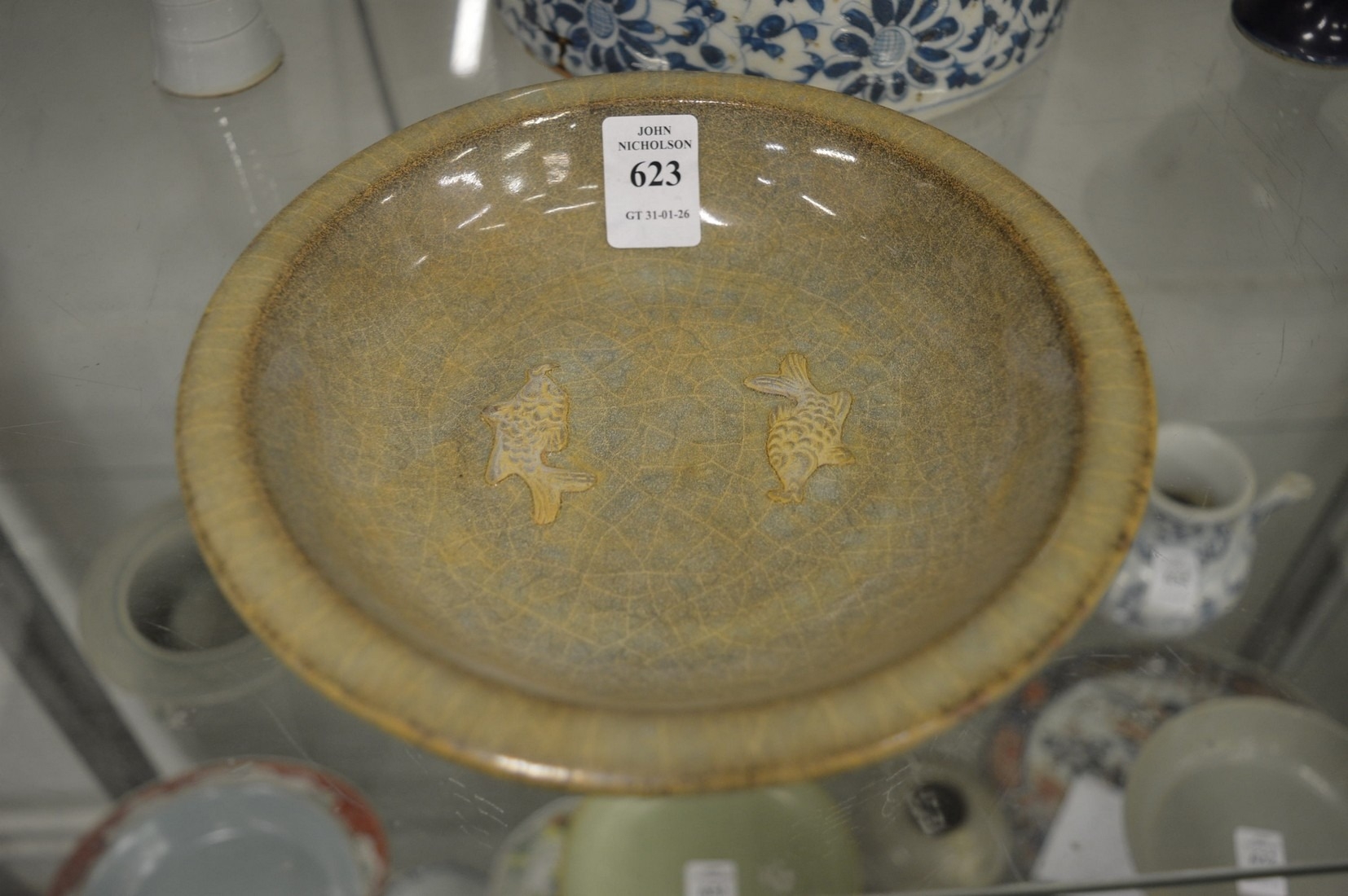 A Chinese crackle glazed dish moulded with two fish.