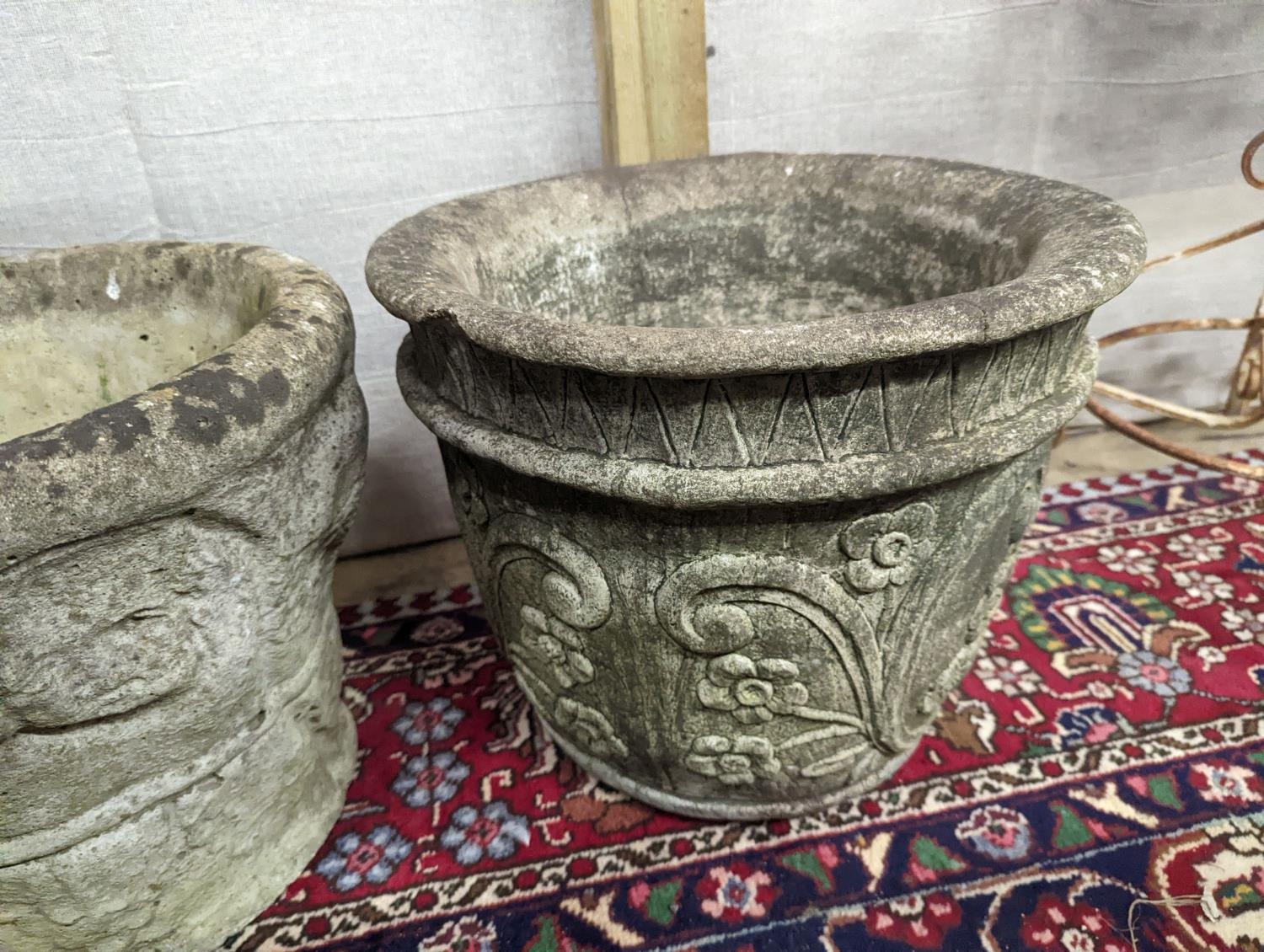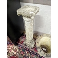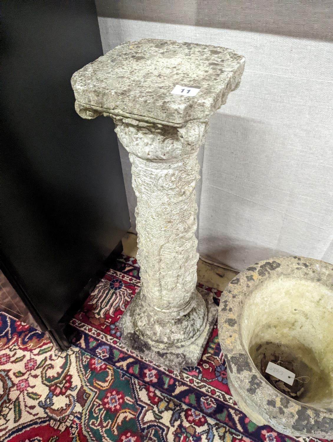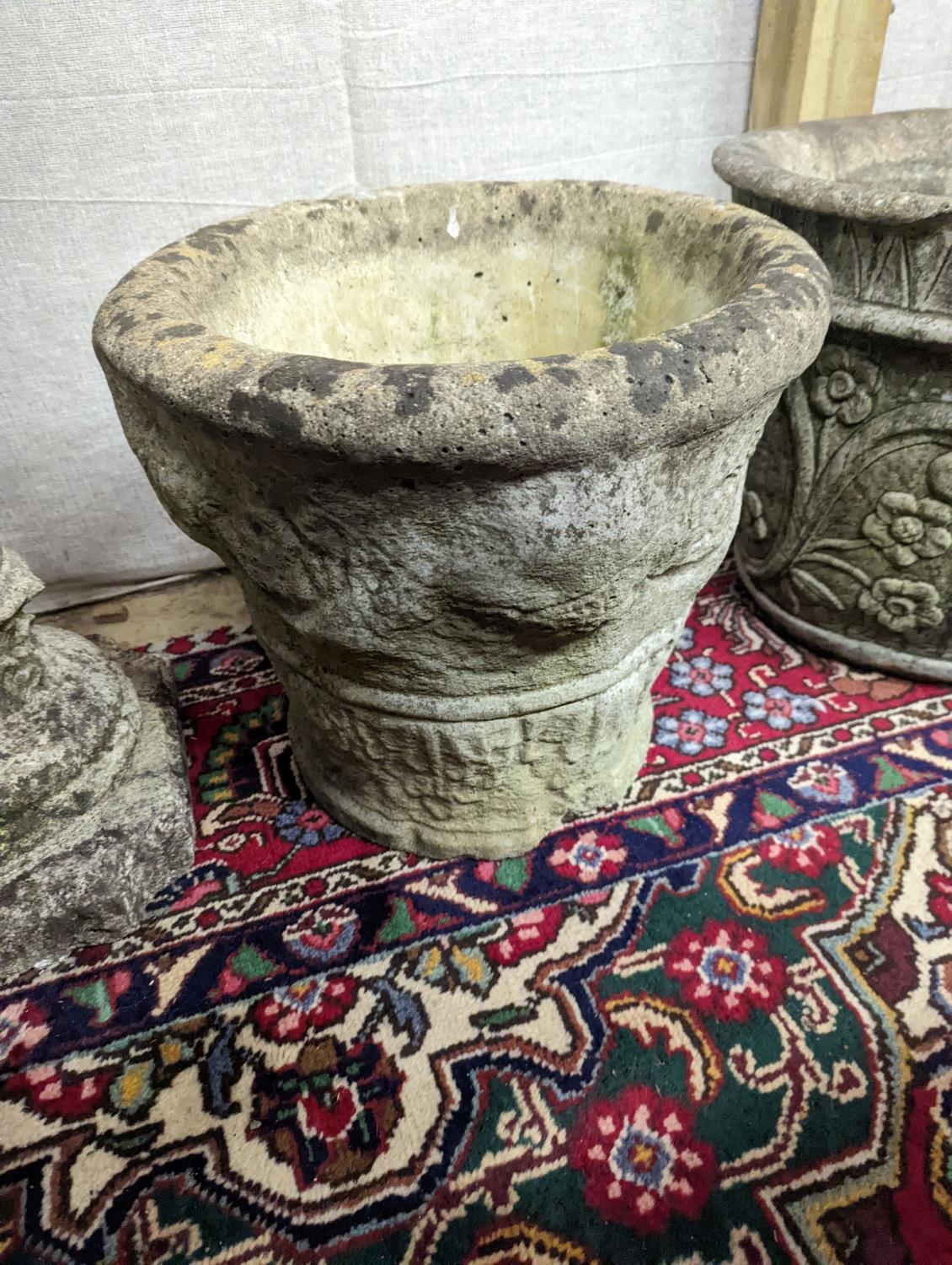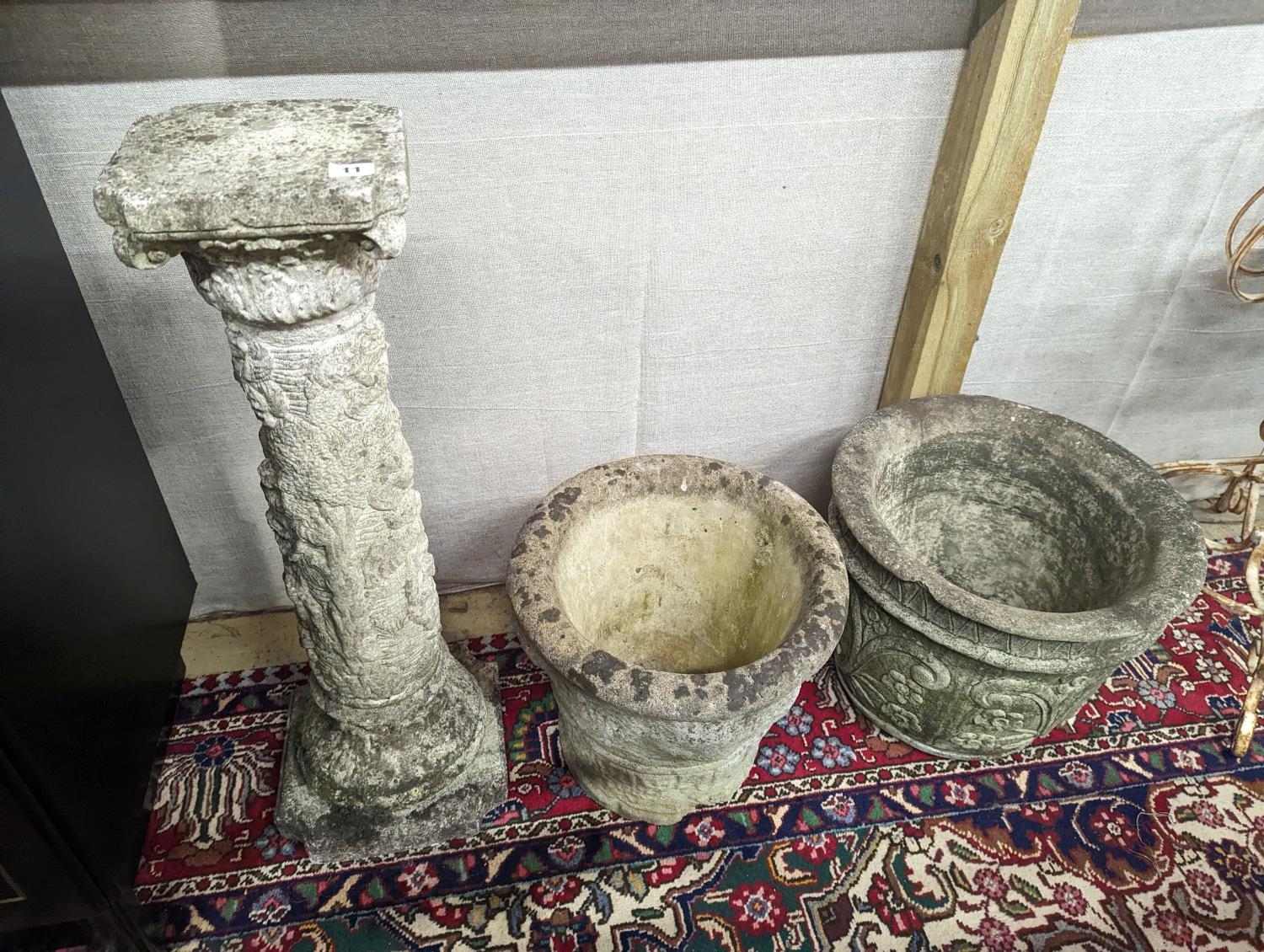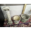 A reconstituted stone garden plinth, height 79cm, together with two circular garden planters, larger diameter 42cm