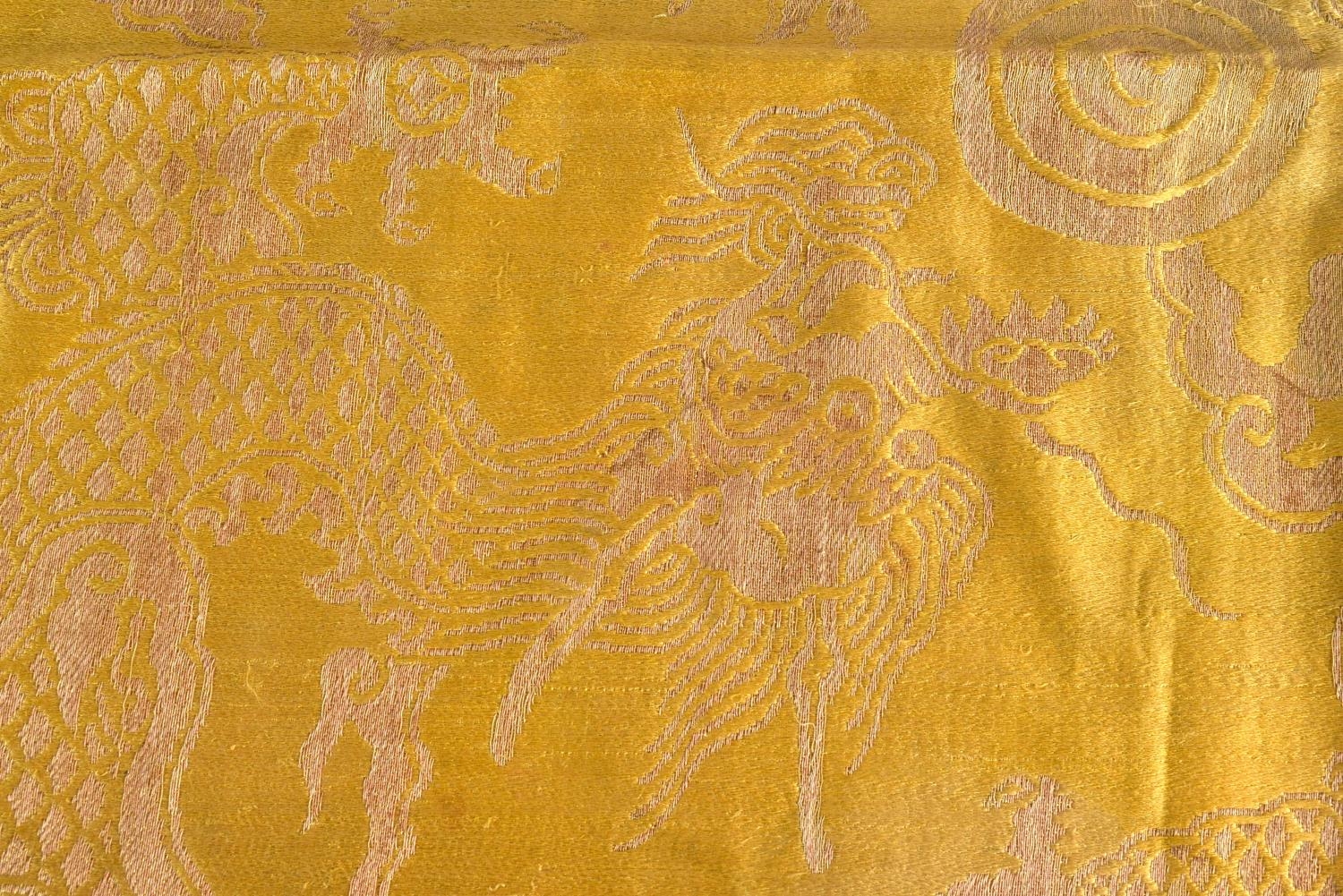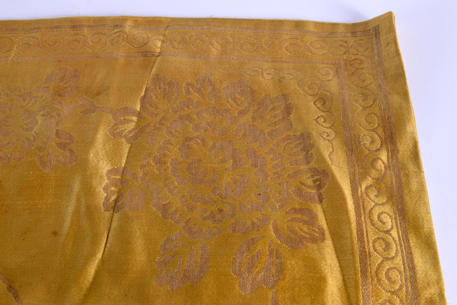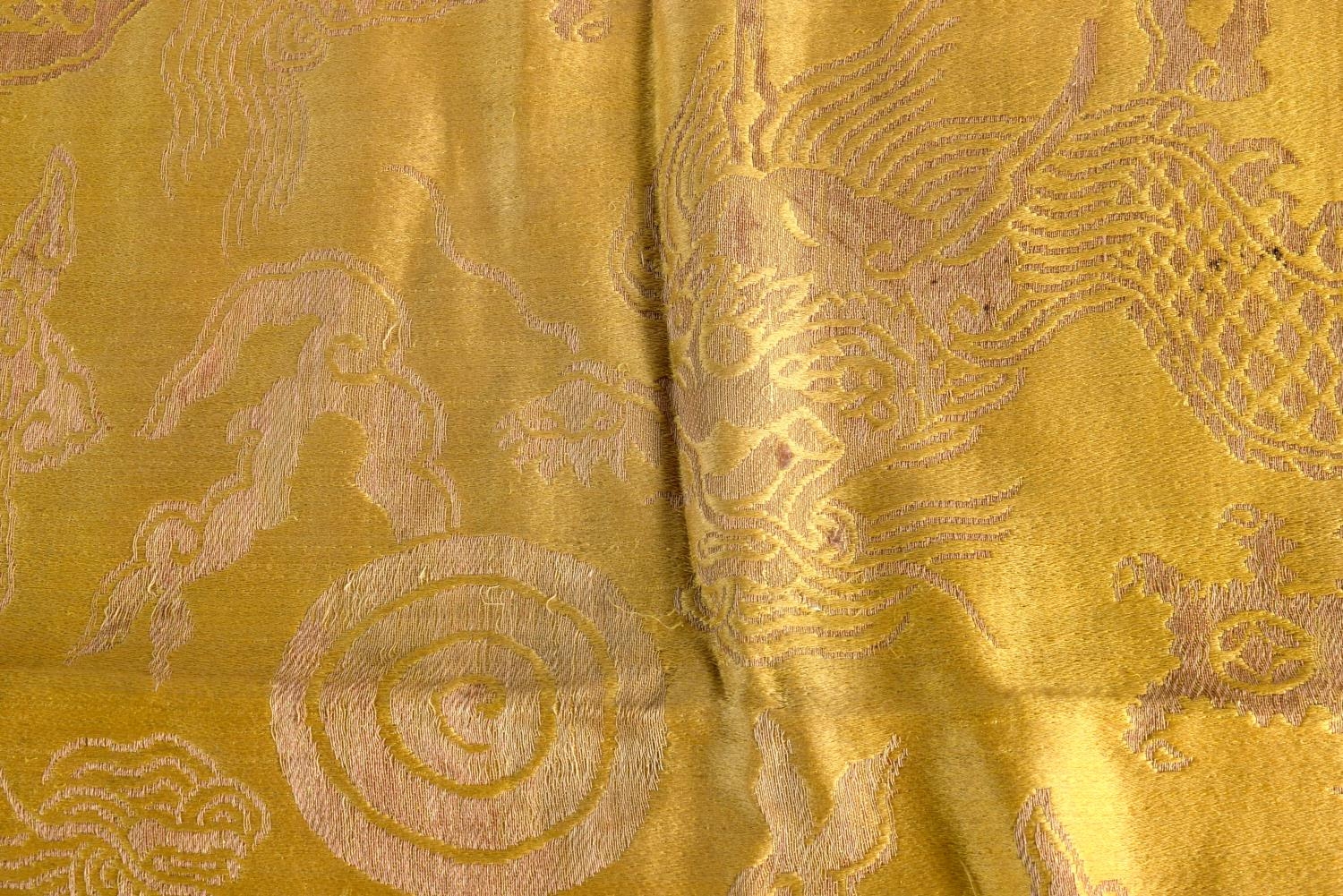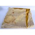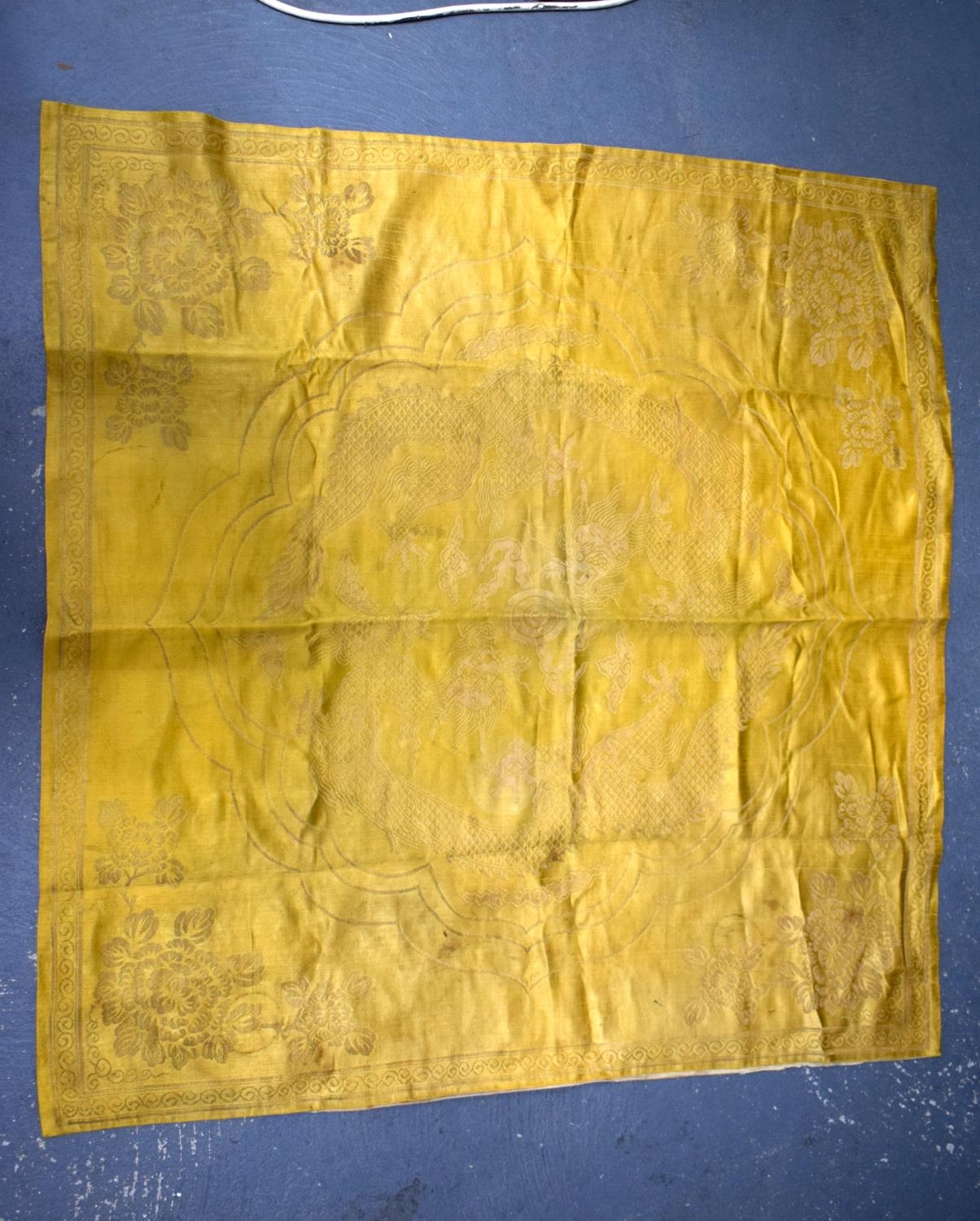 A 19TH CENTURY CHINESE YELLOW EMBROIDERED SILK COVER Qing. 105 cm square. Note: Sold with paper note, Liberated material from Grand Father Harry Beasley, whilst in the arm, from the Winter Palace Peking, during the boxer rebellion.