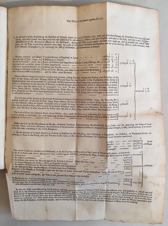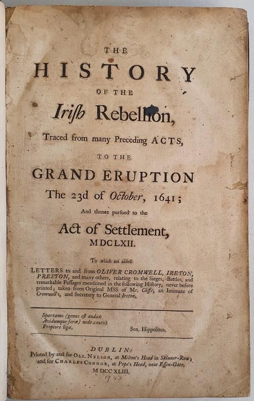[BORLASE, Edmund] The History of the Irish Rebellion, Traced from many Preceding Acts, to the Grand Eruption The 23d of October, 1641; And thence pursued to the Act of Settlement, 1662. To which are added Letters to and from Oliver Cromwell, Ireton, Preston ... relating to the Sieges, Battles and remarkable Passages mentioned in the following History, never before printed; taken from Original MSS of Mr. Cliffe, an Intimate of Cromwell’s and Secretary to General Ireton. Dublin: Printed by and for Oli. Nelson, at Milton’s Head in Skinner-Row; and for Charles Connor, at Pope’s Head, near Essex-Gate, 1743. Folio. pp. [ii], [2 (List of Subscribers)], iii-xxii, 420, [8 (index)], 46 (appendix), plus folding table. Half calf on marbled boards, titled in gilt on red morocco label on spine. Bookplate of O’Neil Segrave.