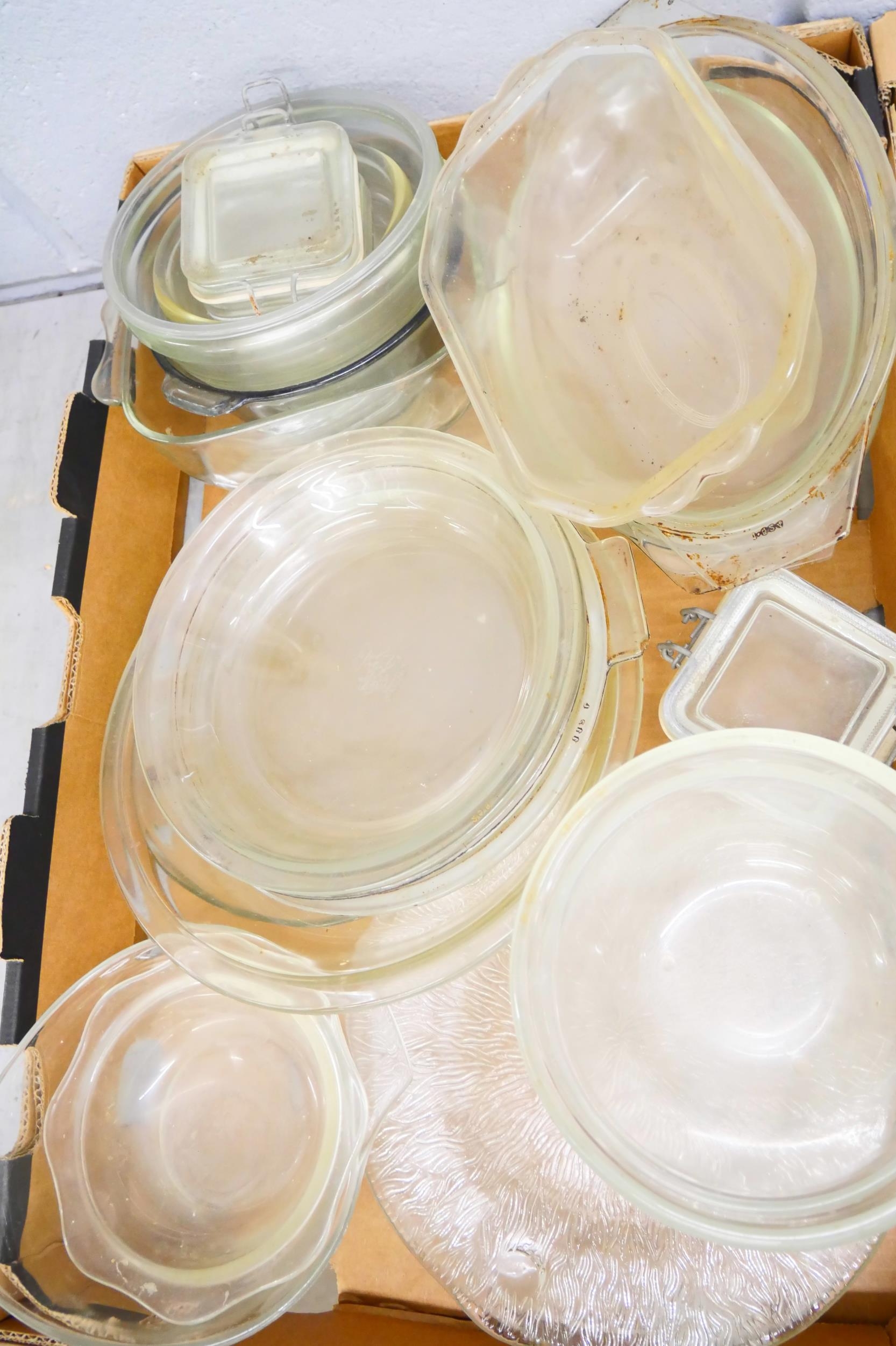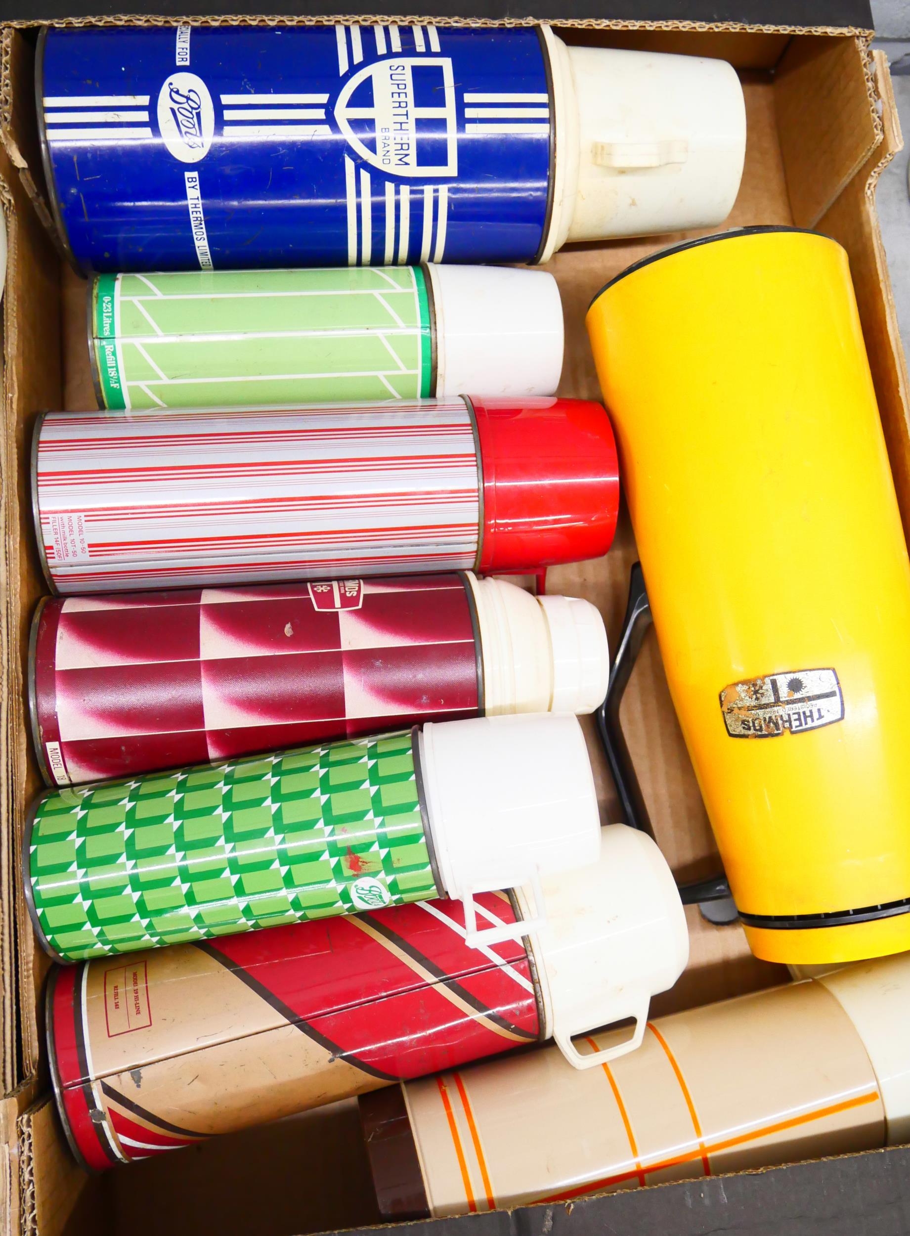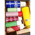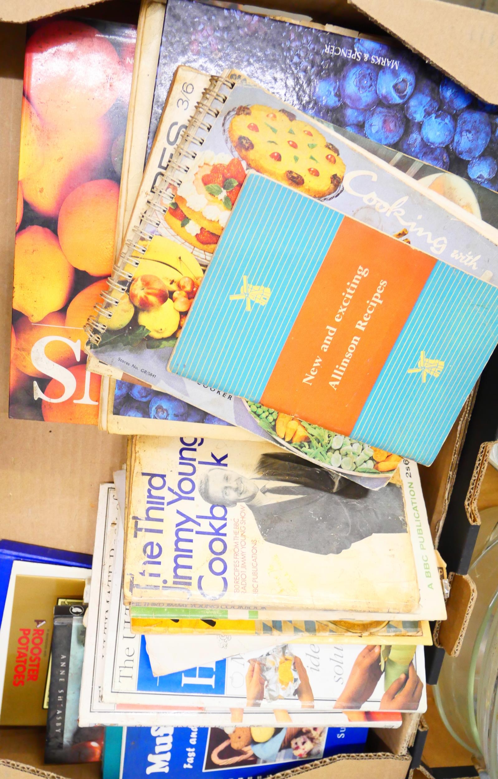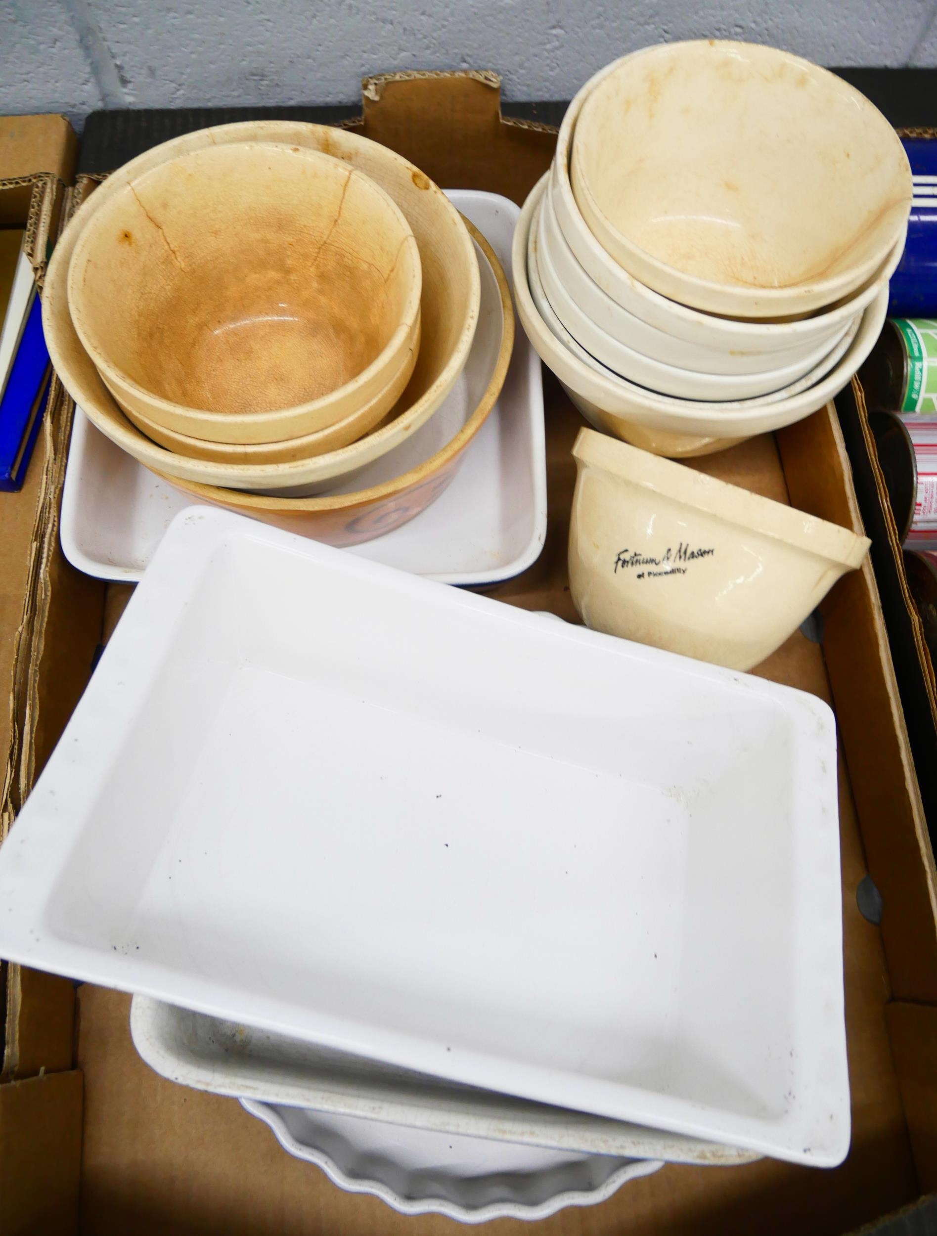 Four boxes of vintage cooking equipment from the 1960's onwards including; Thermos flasks, Pyrex glassware, Glazed UK stoneware pottery pudding basins including Fortnum & Mason and a box of 1970s cookery books including Fanny Craddock, Jimmy Young, Mary Berry and others *Not for Posting and Packing*