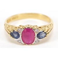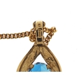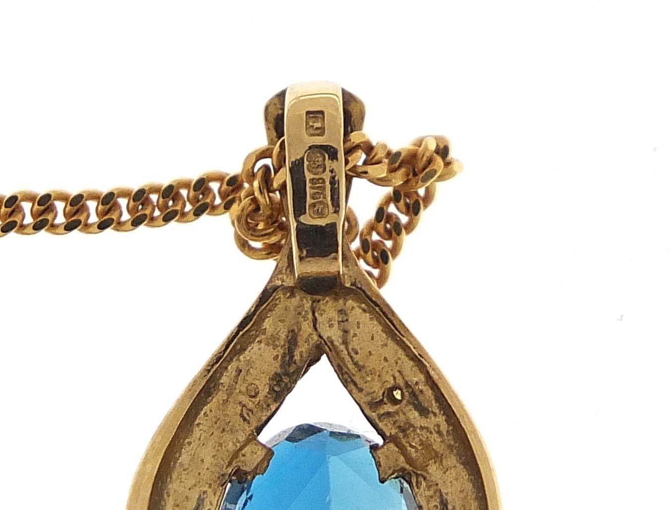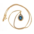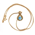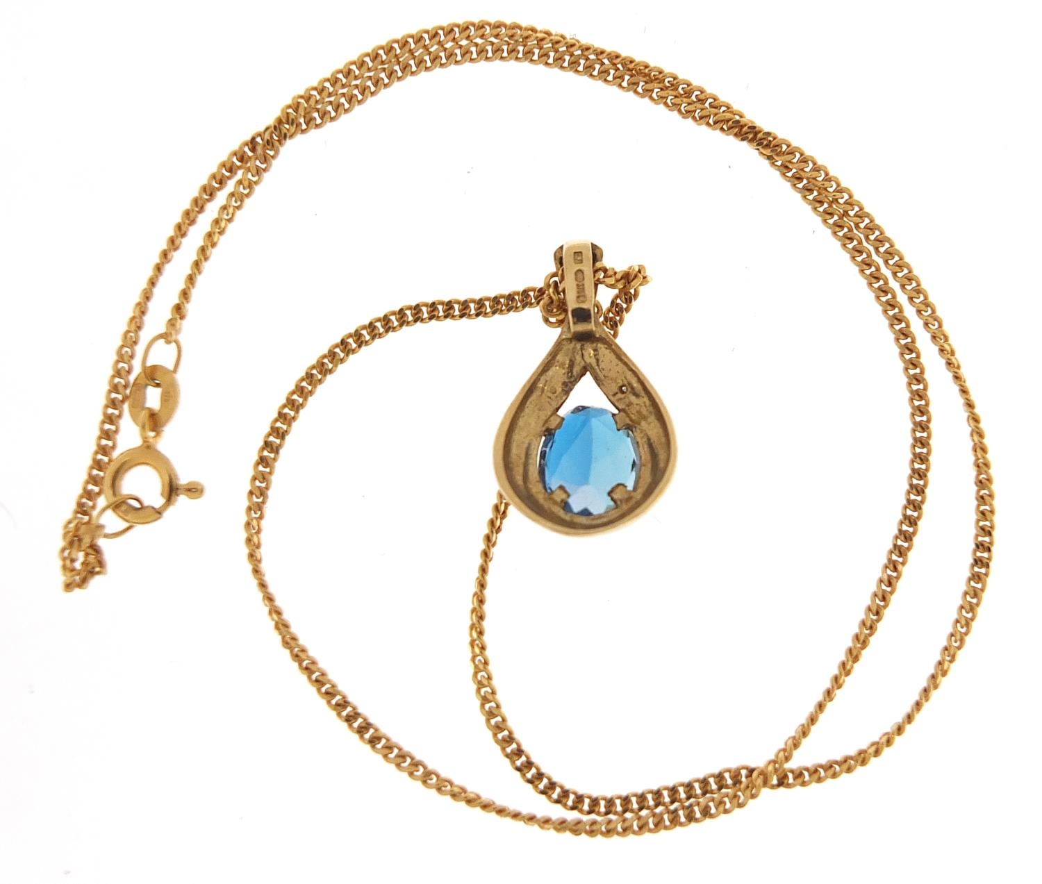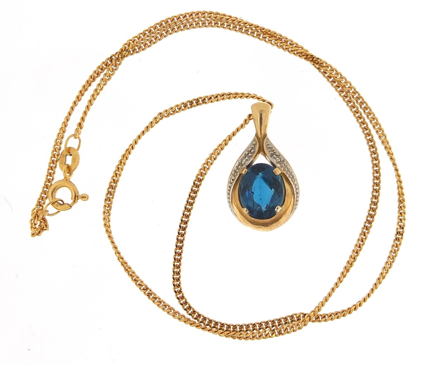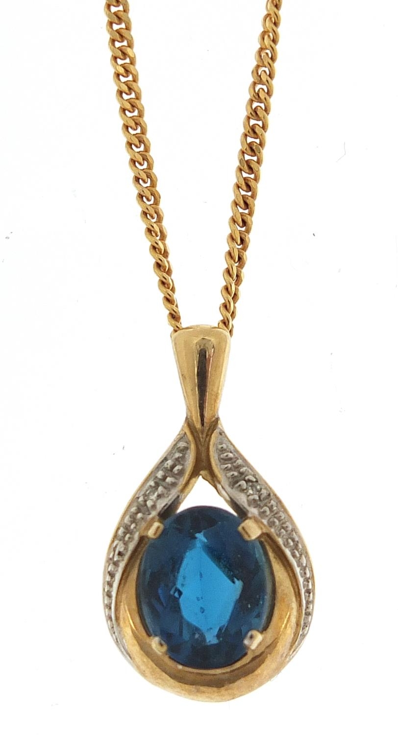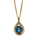 9ct gold blue topaz and diamond tear drop pendant on a 9ct gold necklace, 2cm high and 40cm in length, total 5.2g