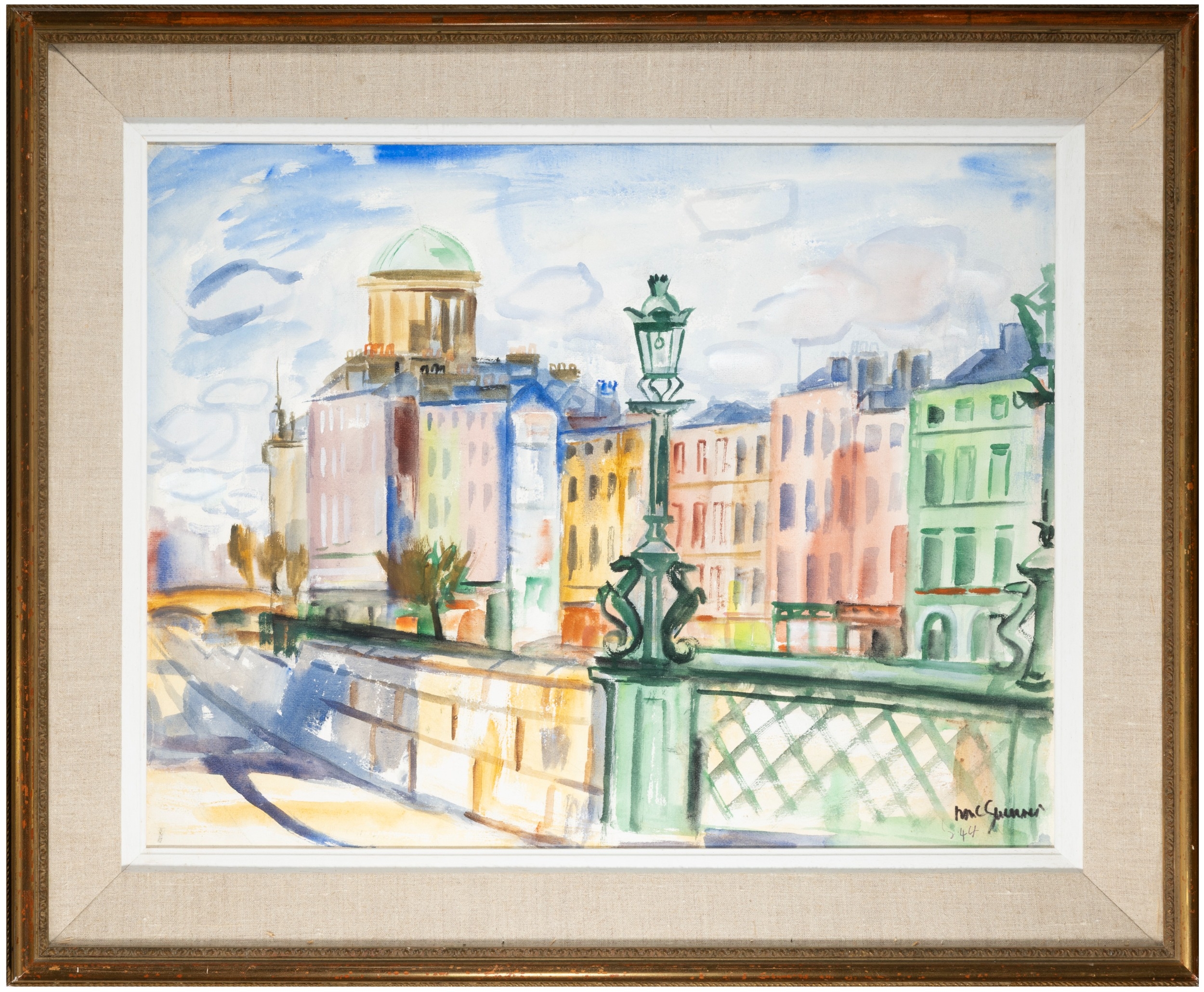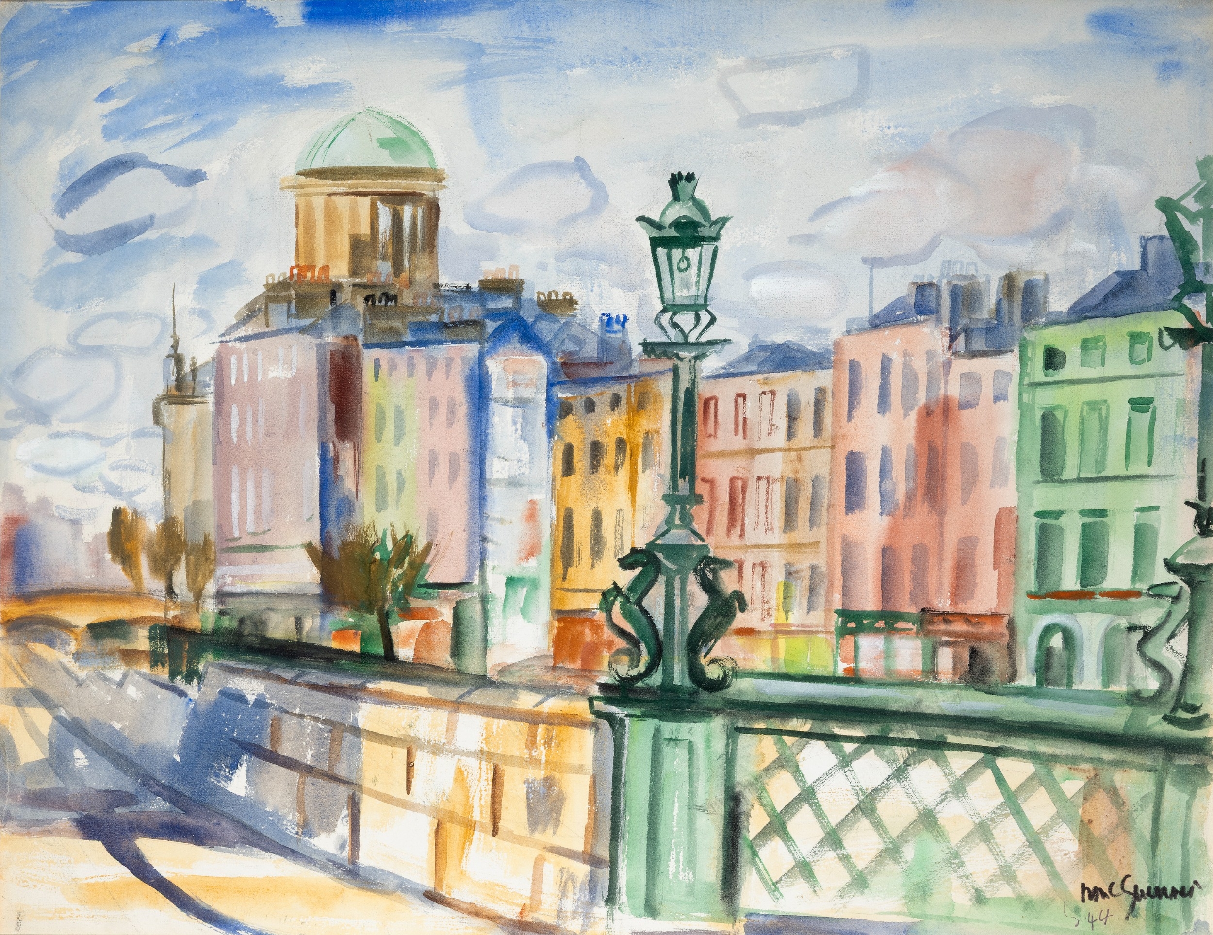 Norah McGuinness HRHA (1901-1980) The Four Courts from the South Quays, Dublin (1944) Gouache, 43 x 55cm (17 x 21¾) Signed and dated (19)'44 Provenance: with Taylor Galleries, Dublin, 1979 as 'The Custom House' (sic); Private Collection, Dublin