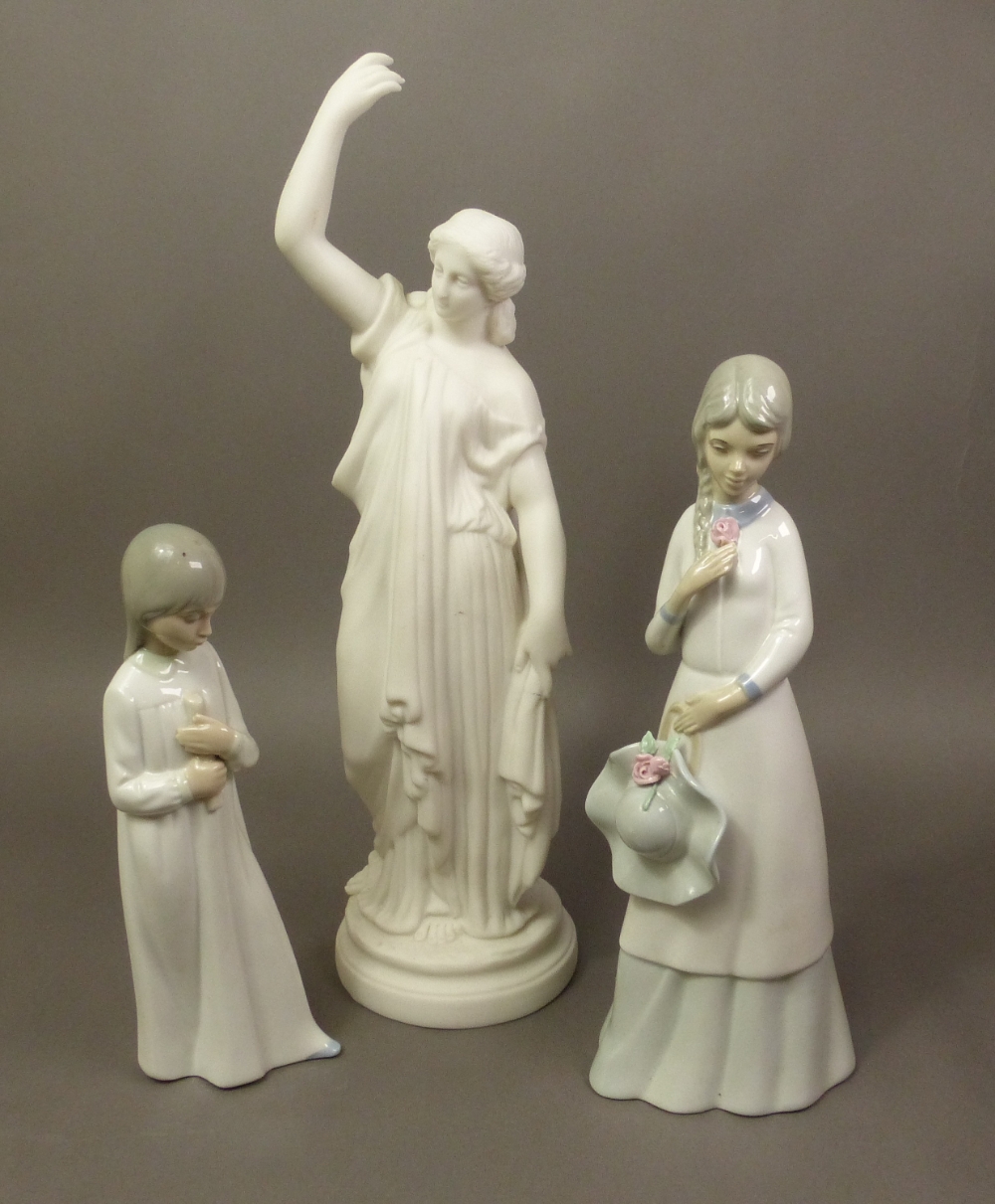 Two Spanish made figurines in the manner of Nao/Lladro, together with a modern Parian style figure (finger damage noted) height of tallest 34cm (3).