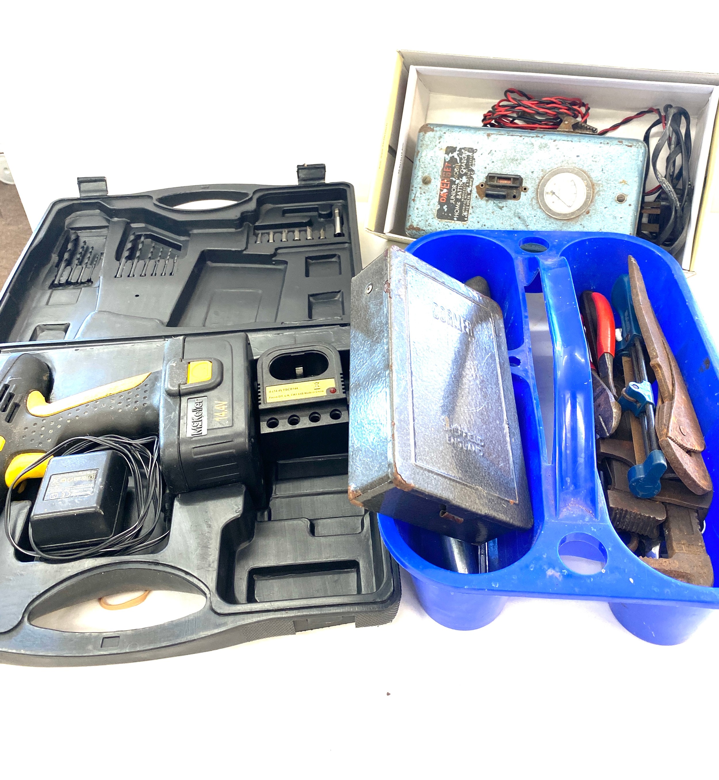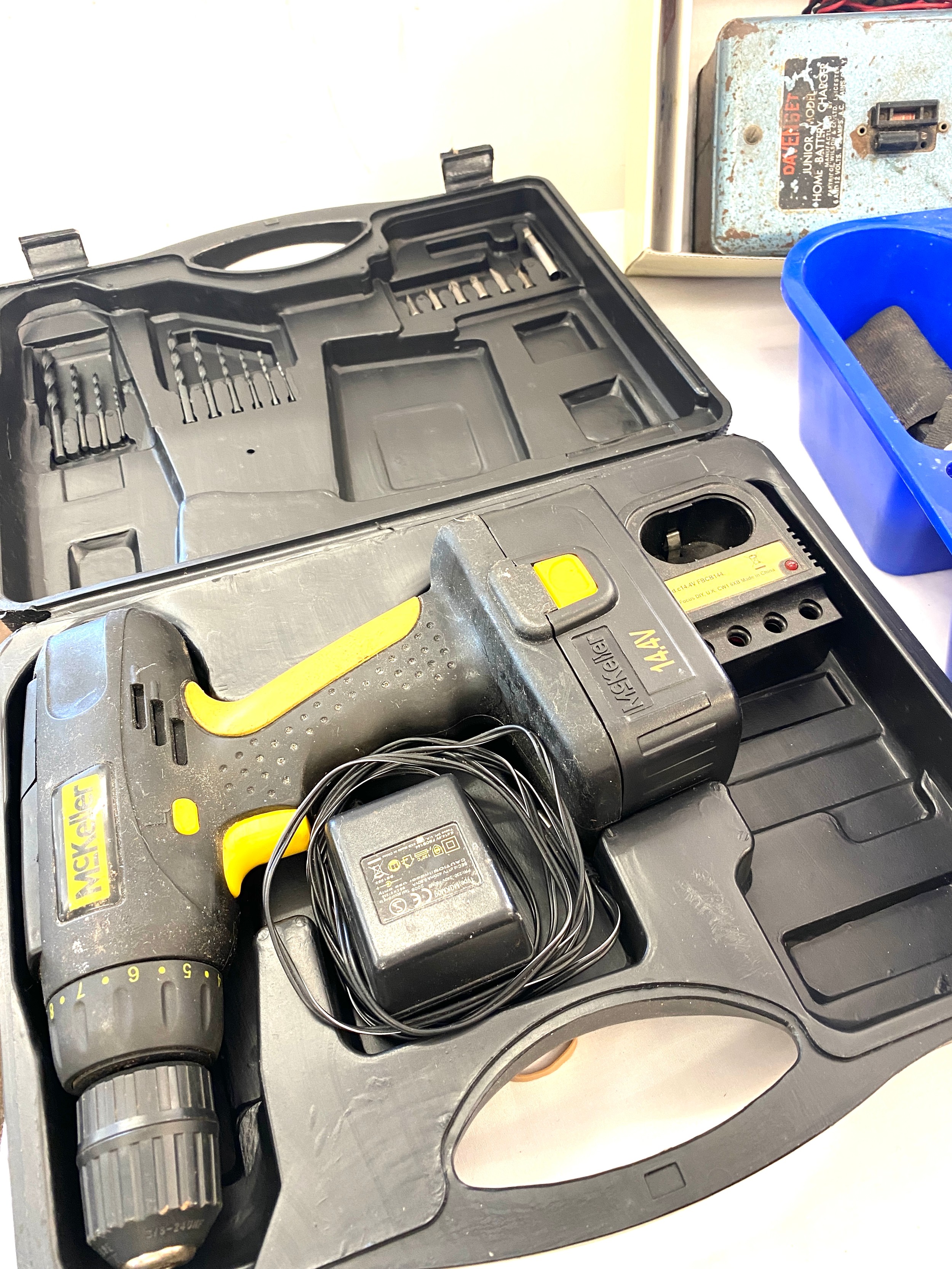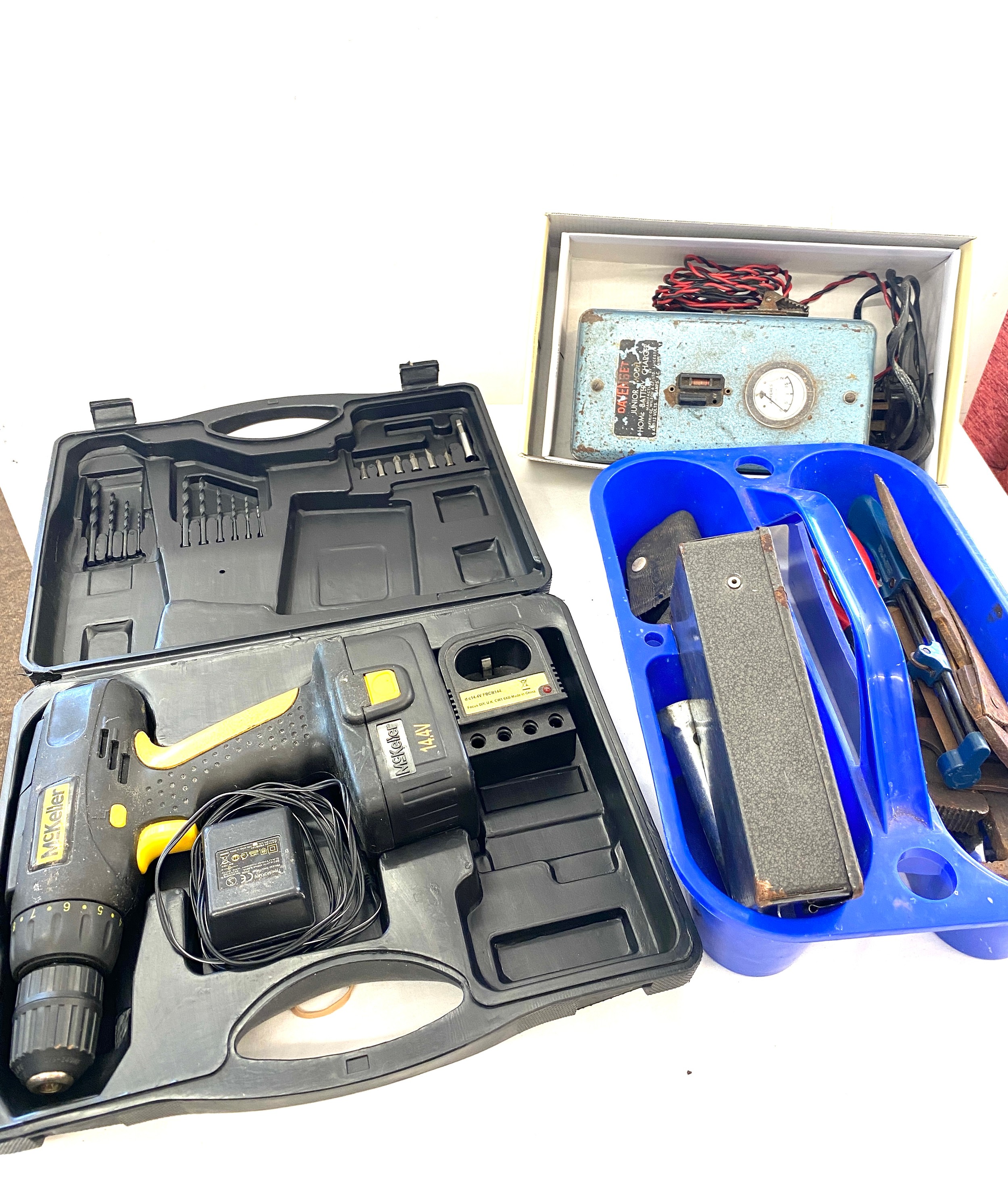 Selection of tools to include drill and accessories, battery charger, drill bits