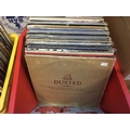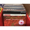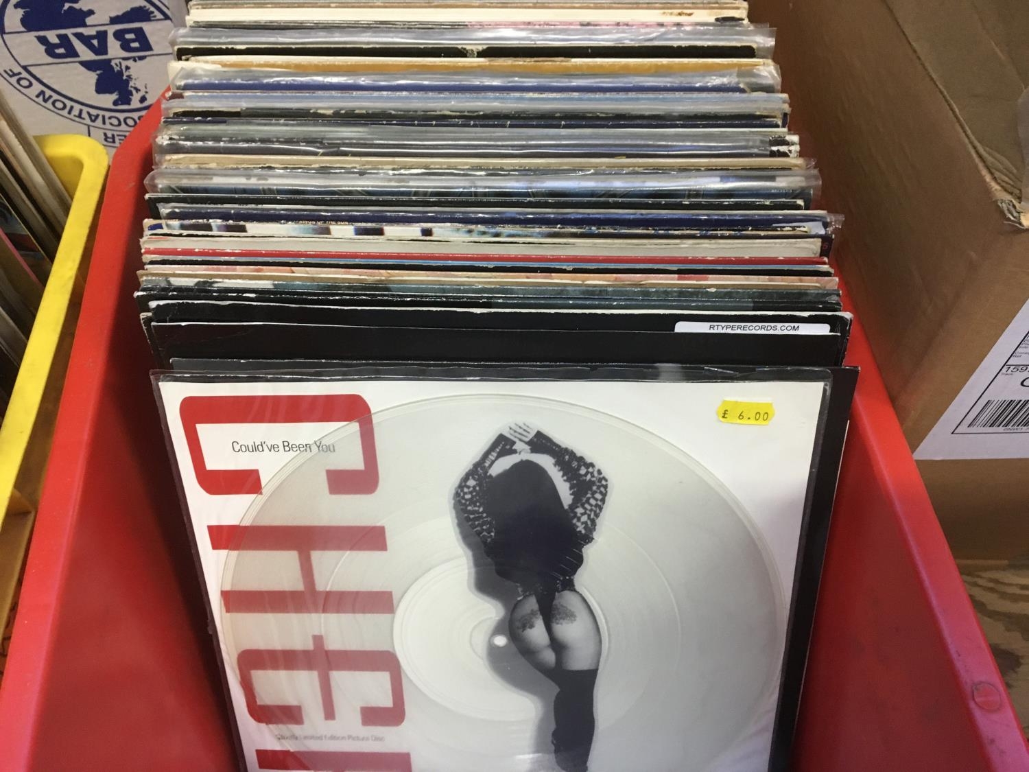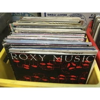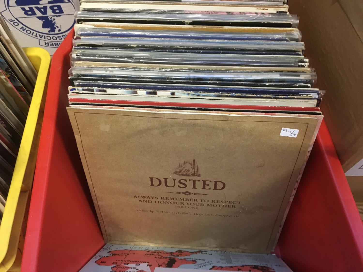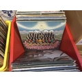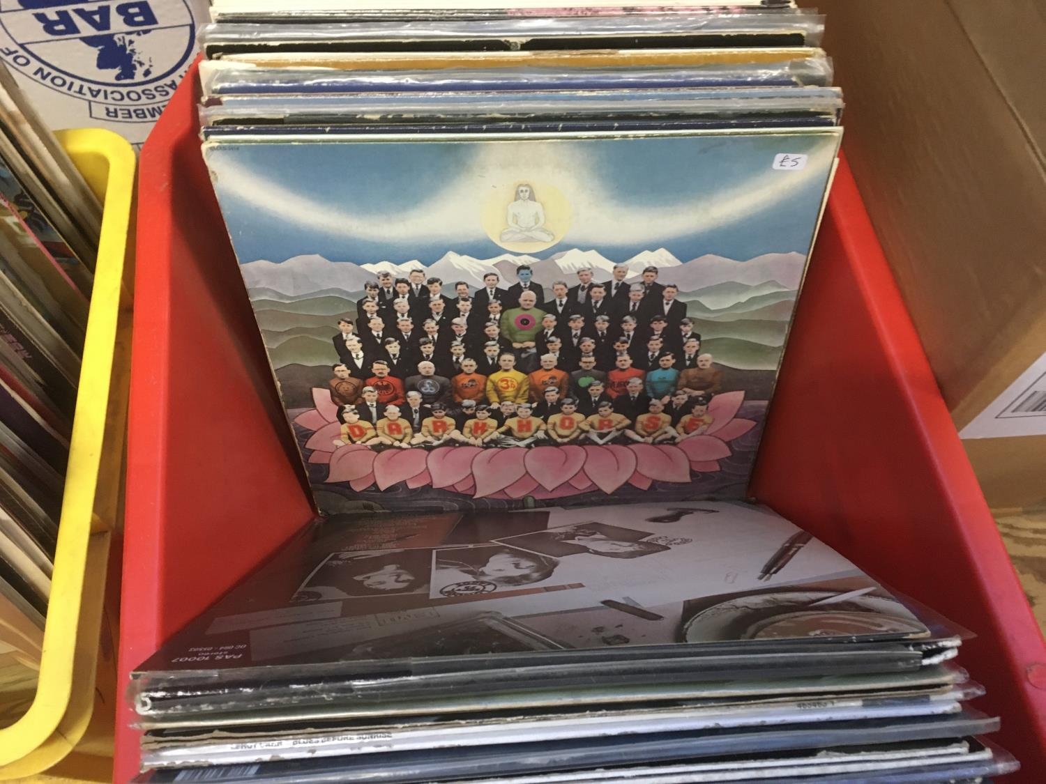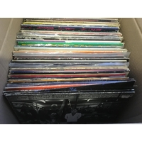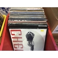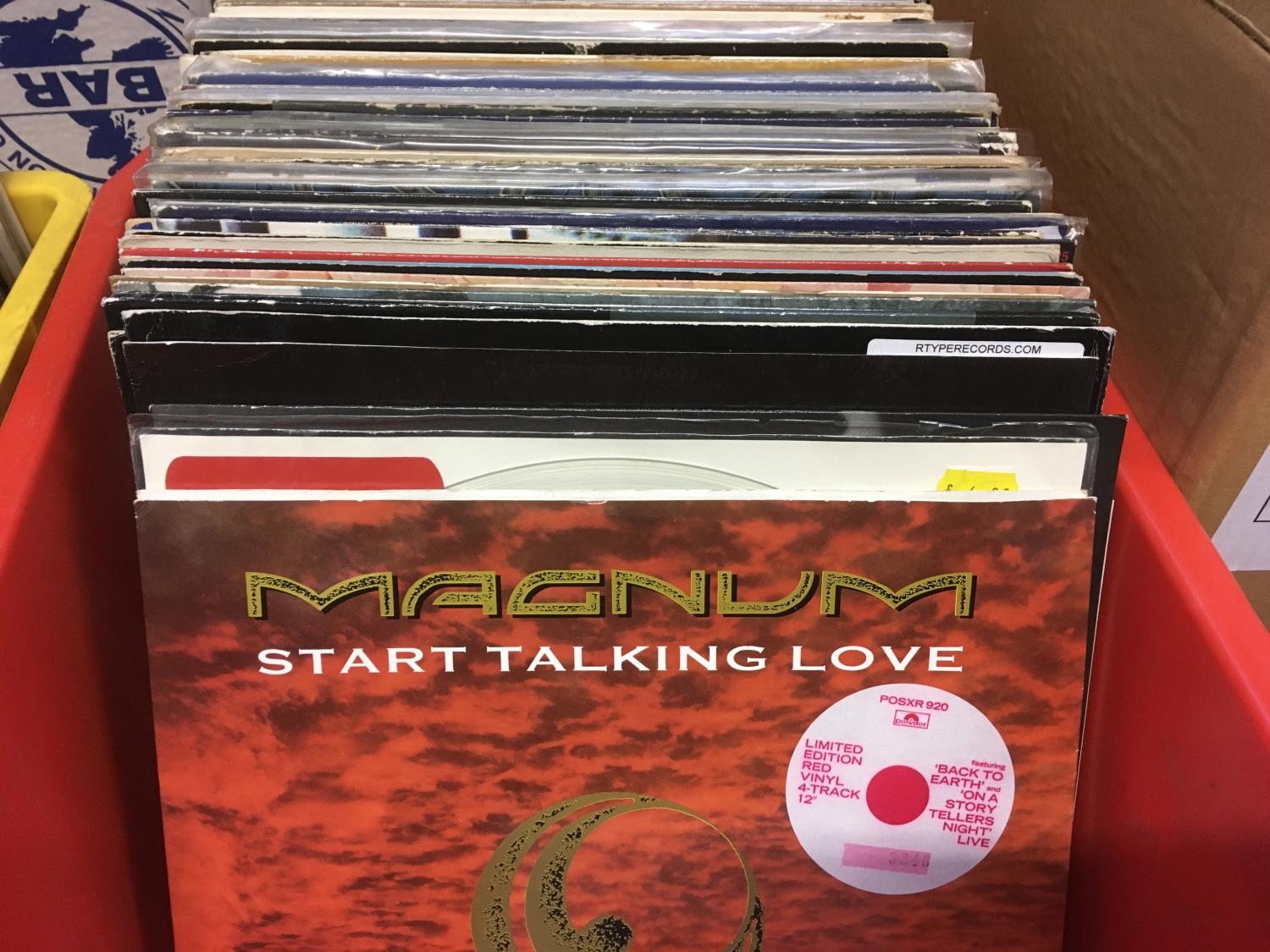 A box of LPs and 12 inch singles by various artists including George Harrison, T Rex, Scorpions and others.