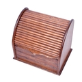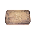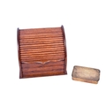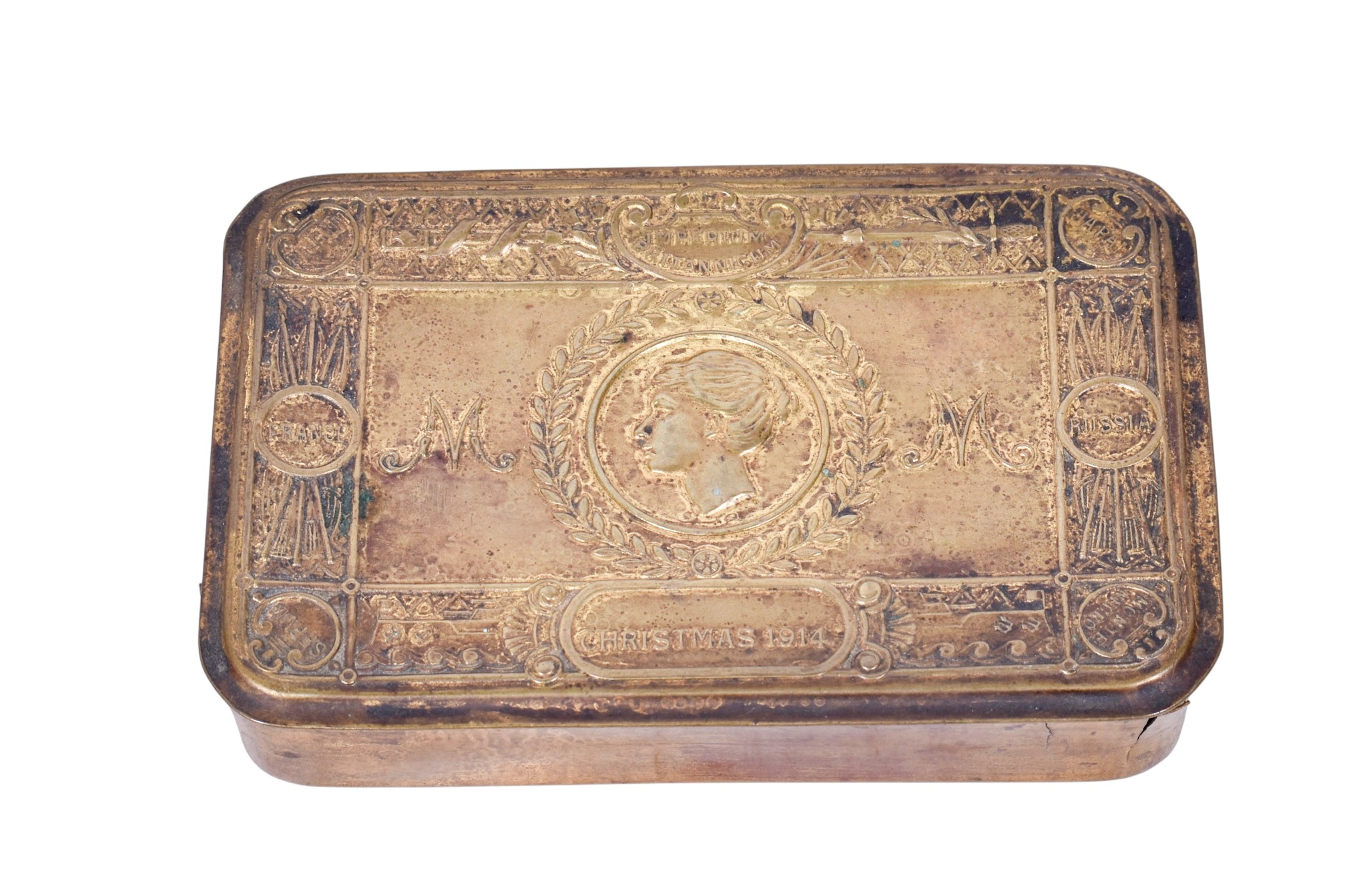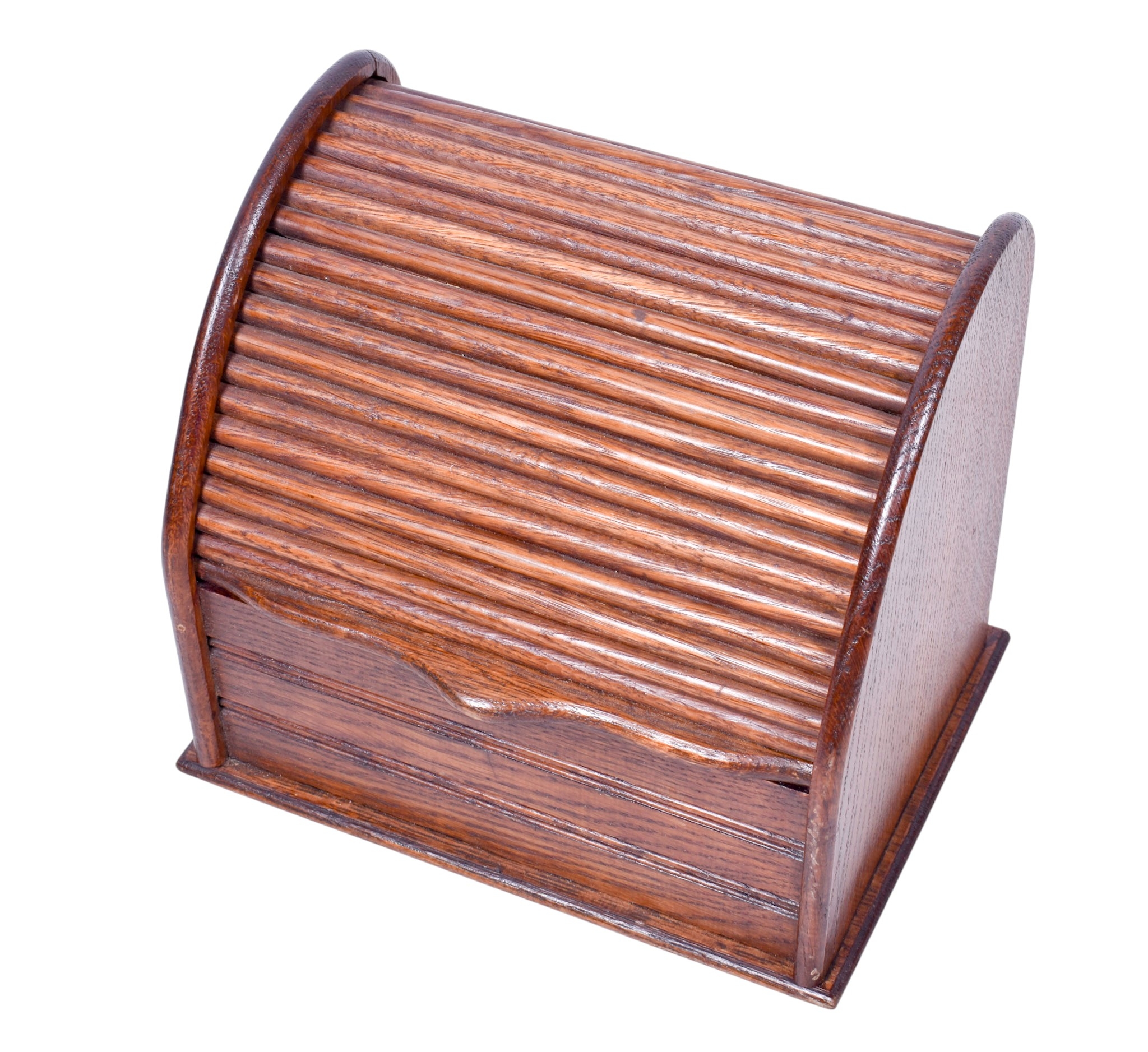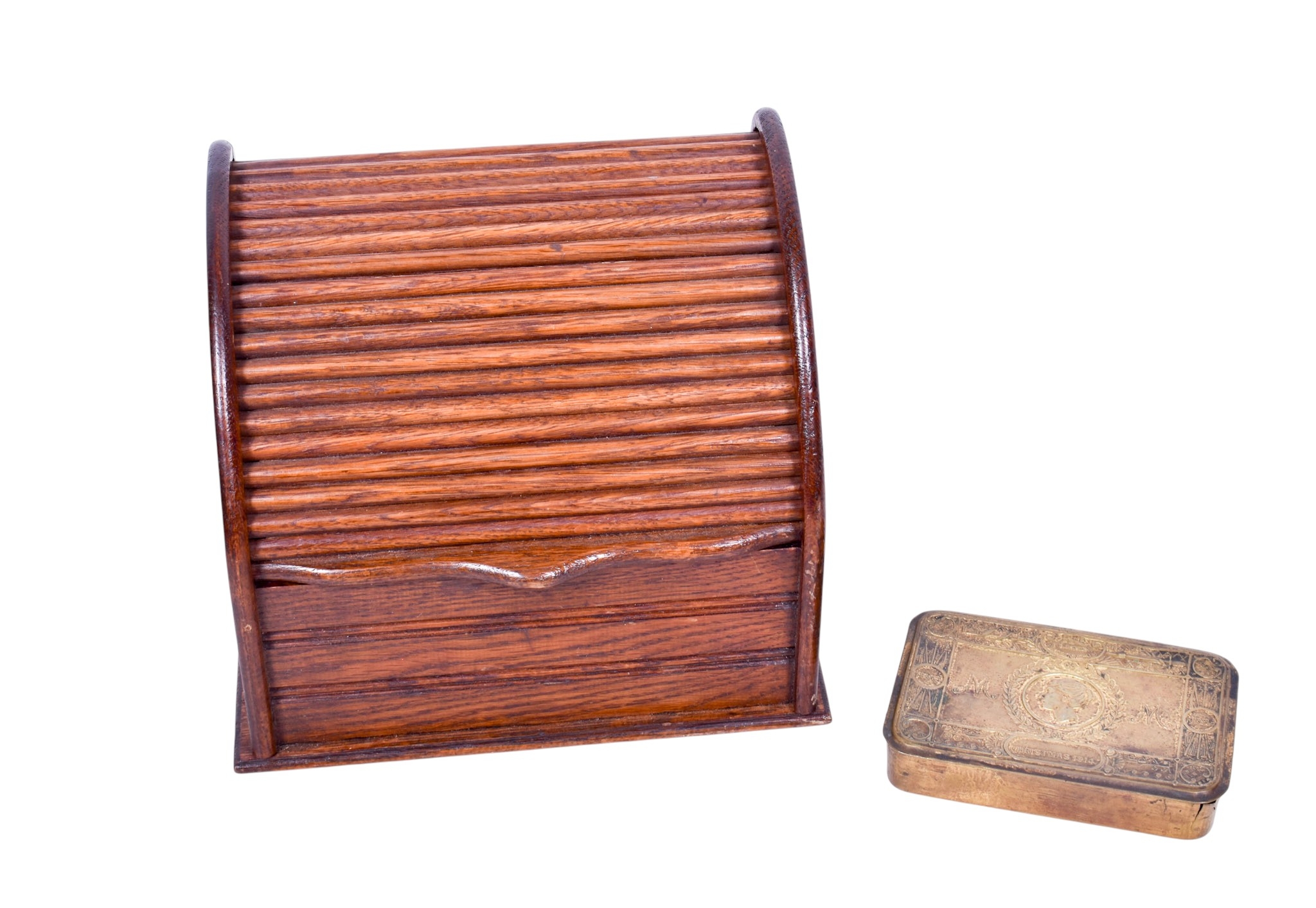 An oak letter rack and a Mary 1914 Christmas tin. The rack having a tambour front and containing four compartments, L23cm, the tin having embossed decoration, L13cm.