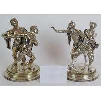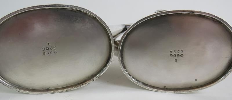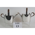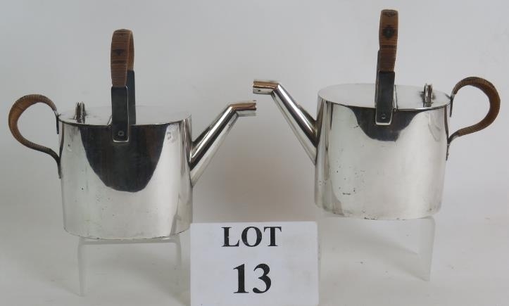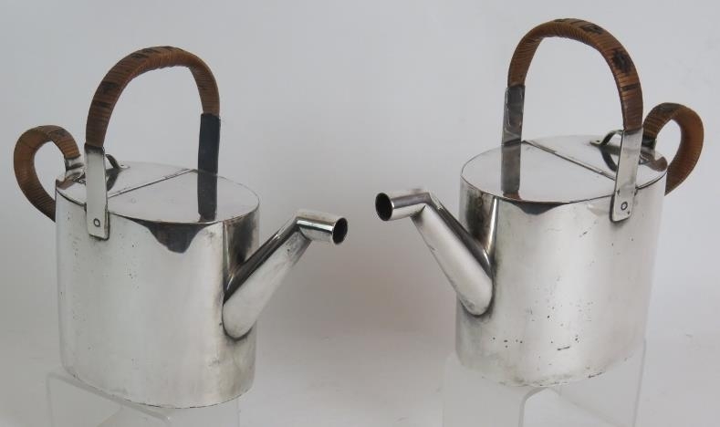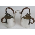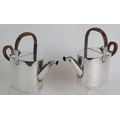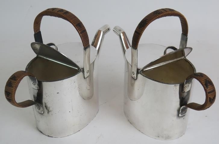 A pair of antique electroplated watering can water jugs by Hukin and Heath in the style of Dr Christopher Dresser. Each with rattan covered handles and marked to base. (2). Overall height: 16cm (approx)