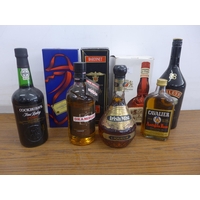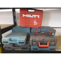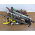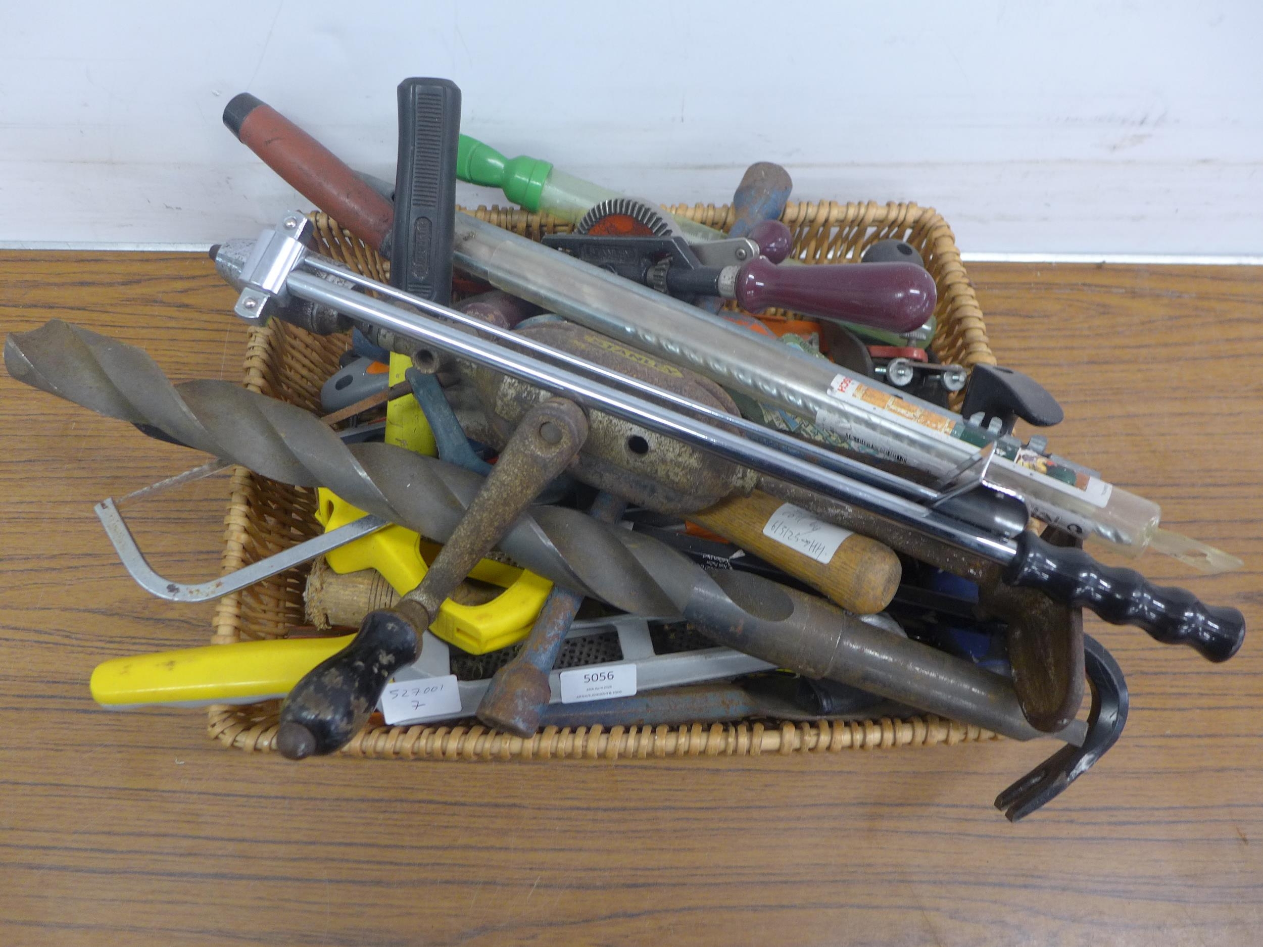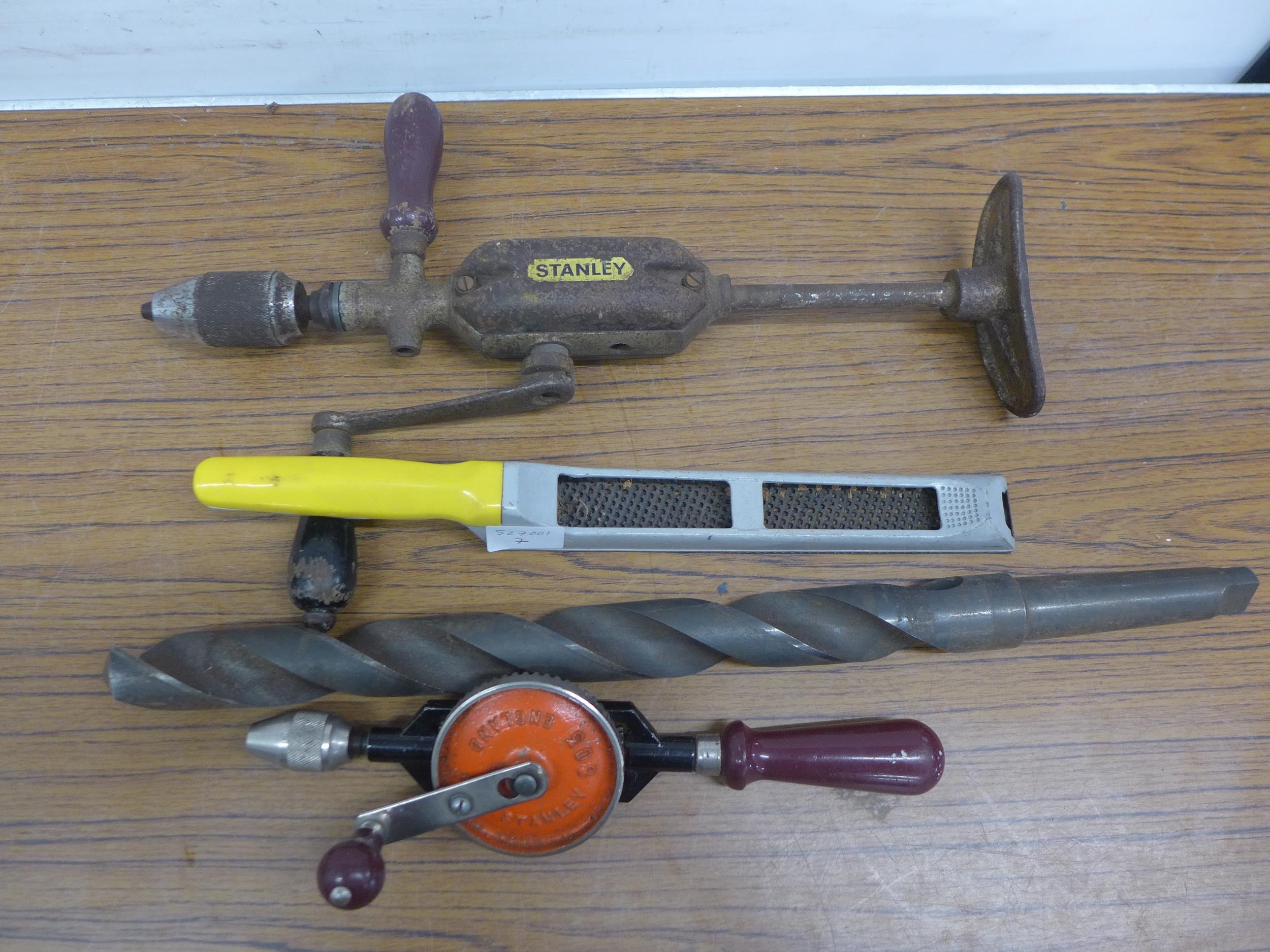 A tray of assorted tools including manual drills, large drill bit, hammer, etc.