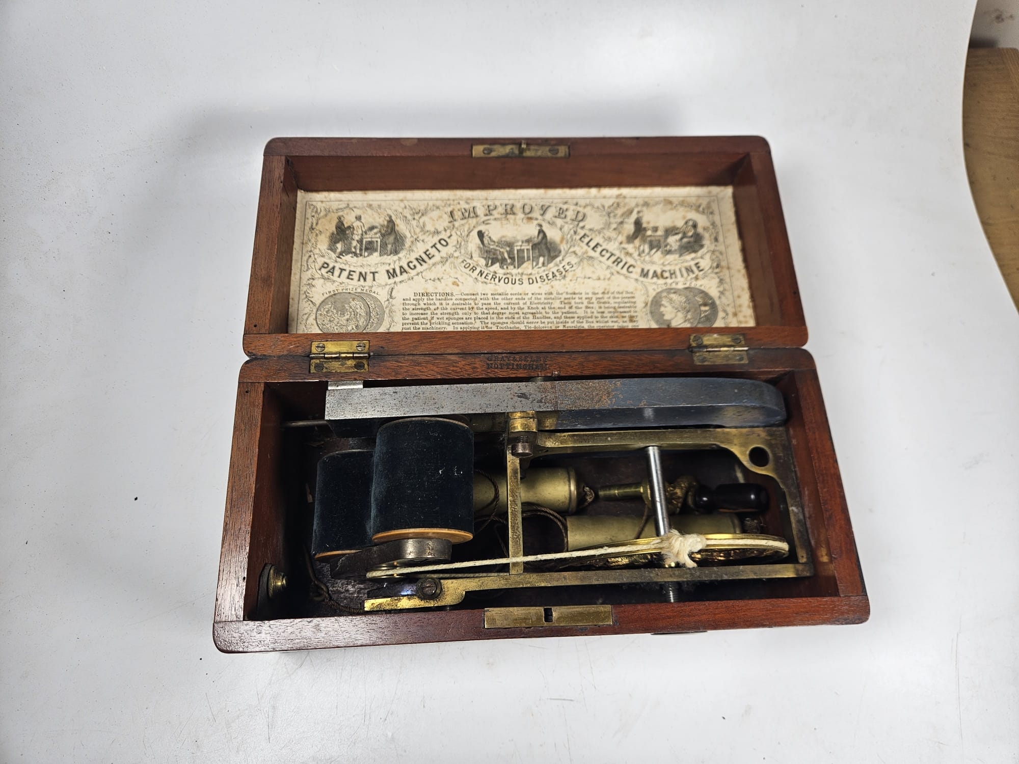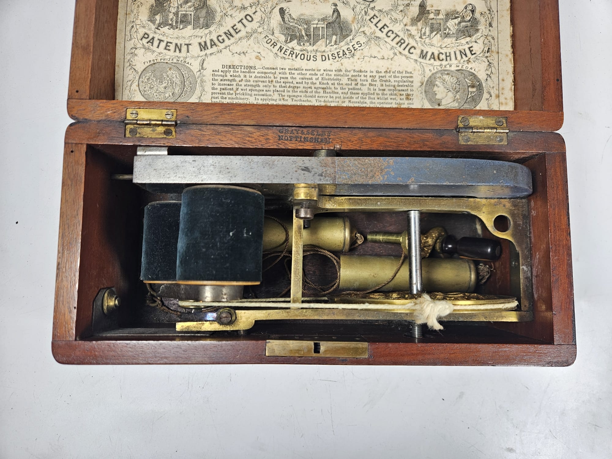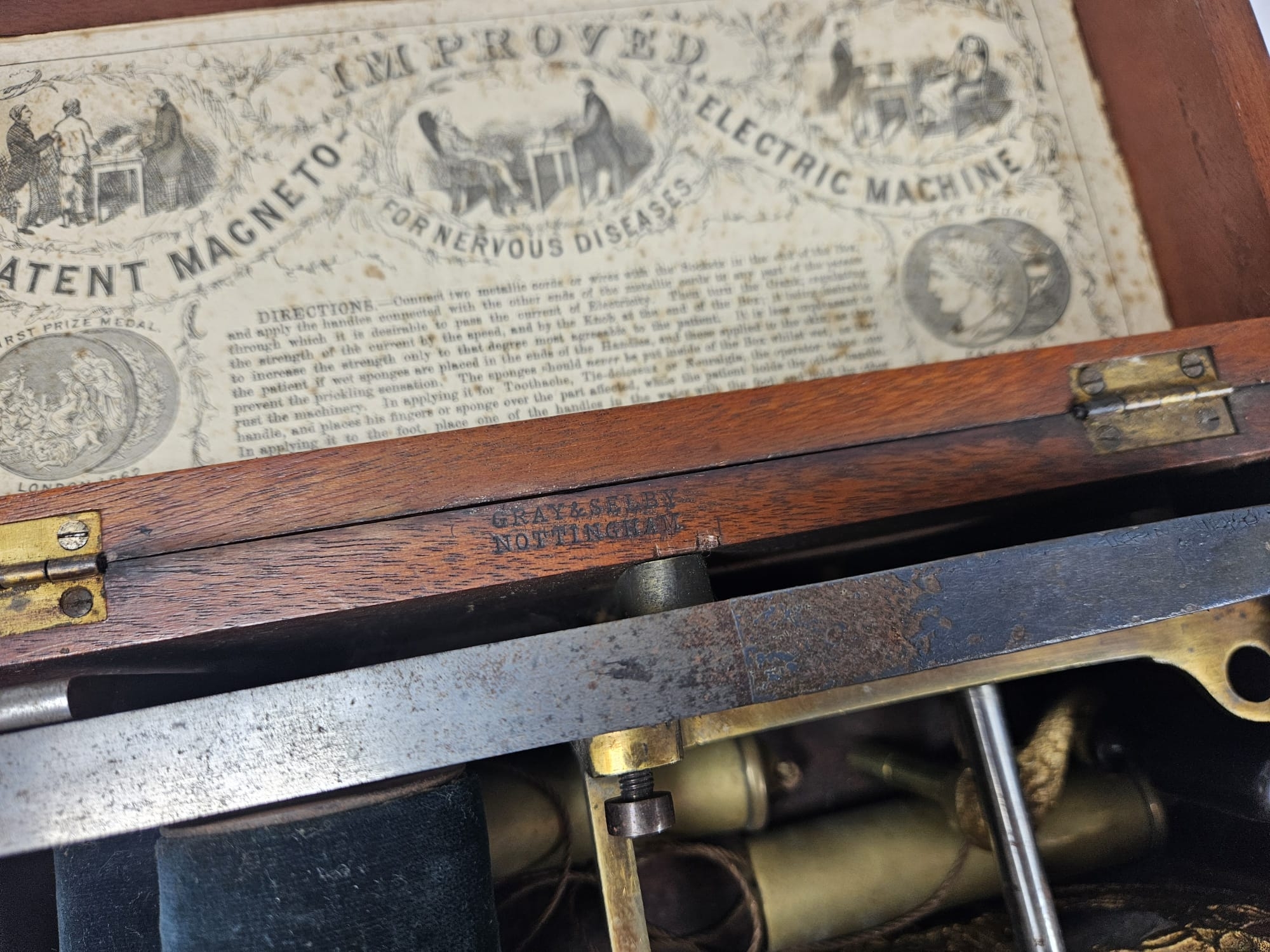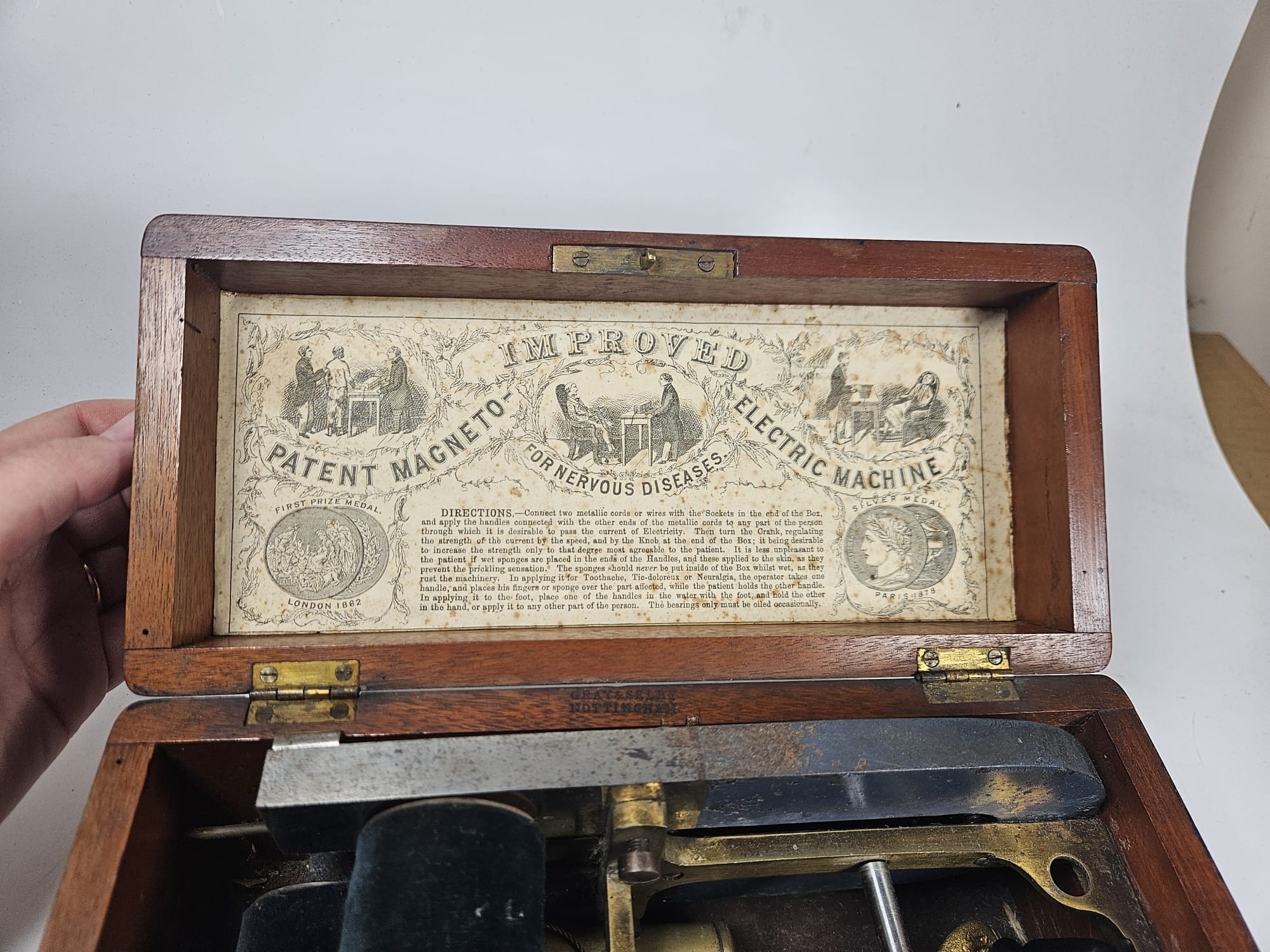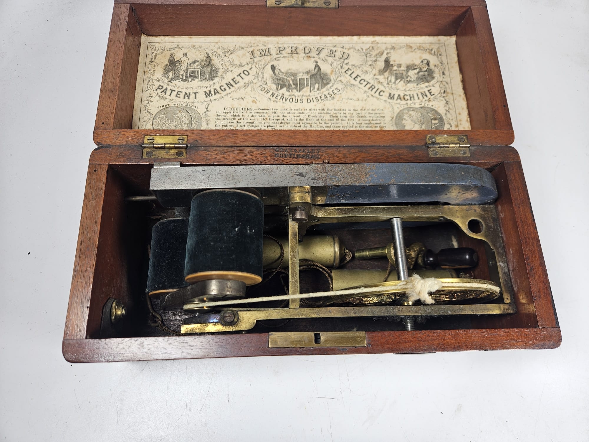Gray & Selby Improved Patent Magneto Electric Machine. In wooden case, With hand crank handle and both shock handles. measuring 26x12x12cm