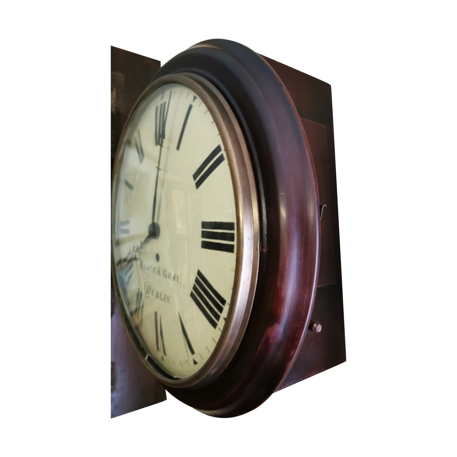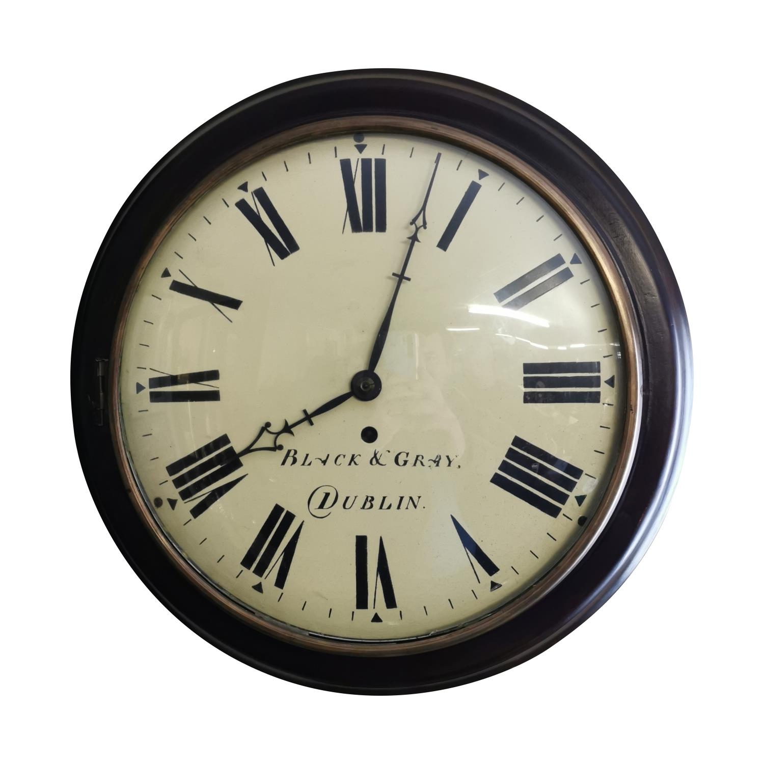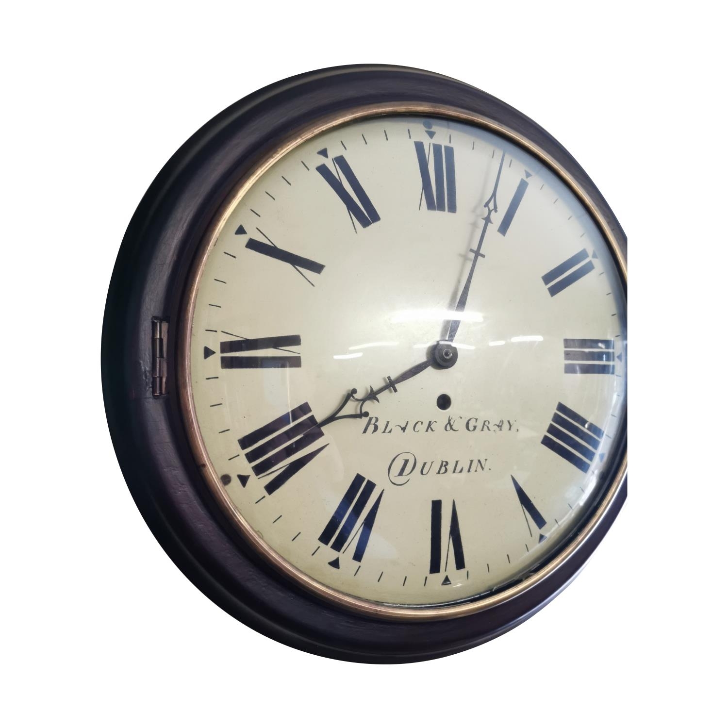 19th C. mahogany Black & Gray of Dublin wall clock with painted dial and fusee movement {39 cm Dia. x 15 cm D}