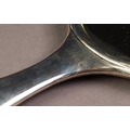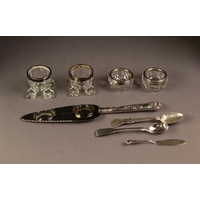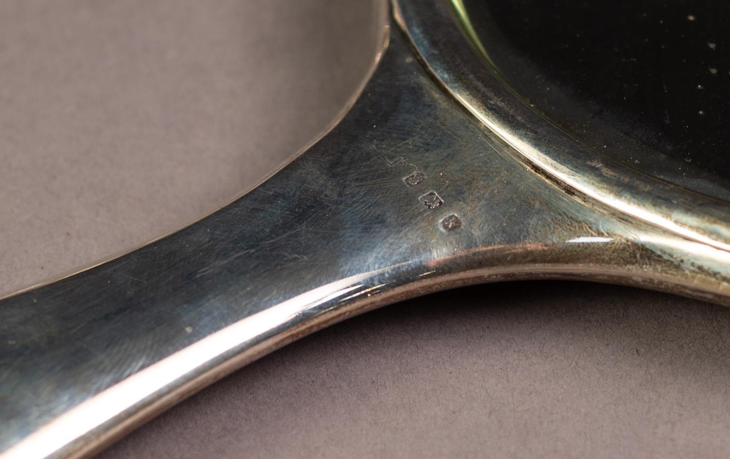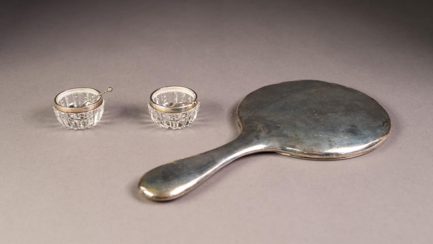 PLAIN SILVER CLAD DRESSING TABLE HAND MIRROR, with circular, bevel edged plate, Birmingham 1909, together with a PAIR OF CUT GLASS OPEN SALTS WITH SILVER RIMS, Birmingham 1903, and the MATCHING PAIR OF SALT SPOONS, (5)
