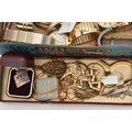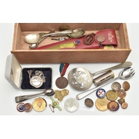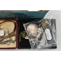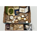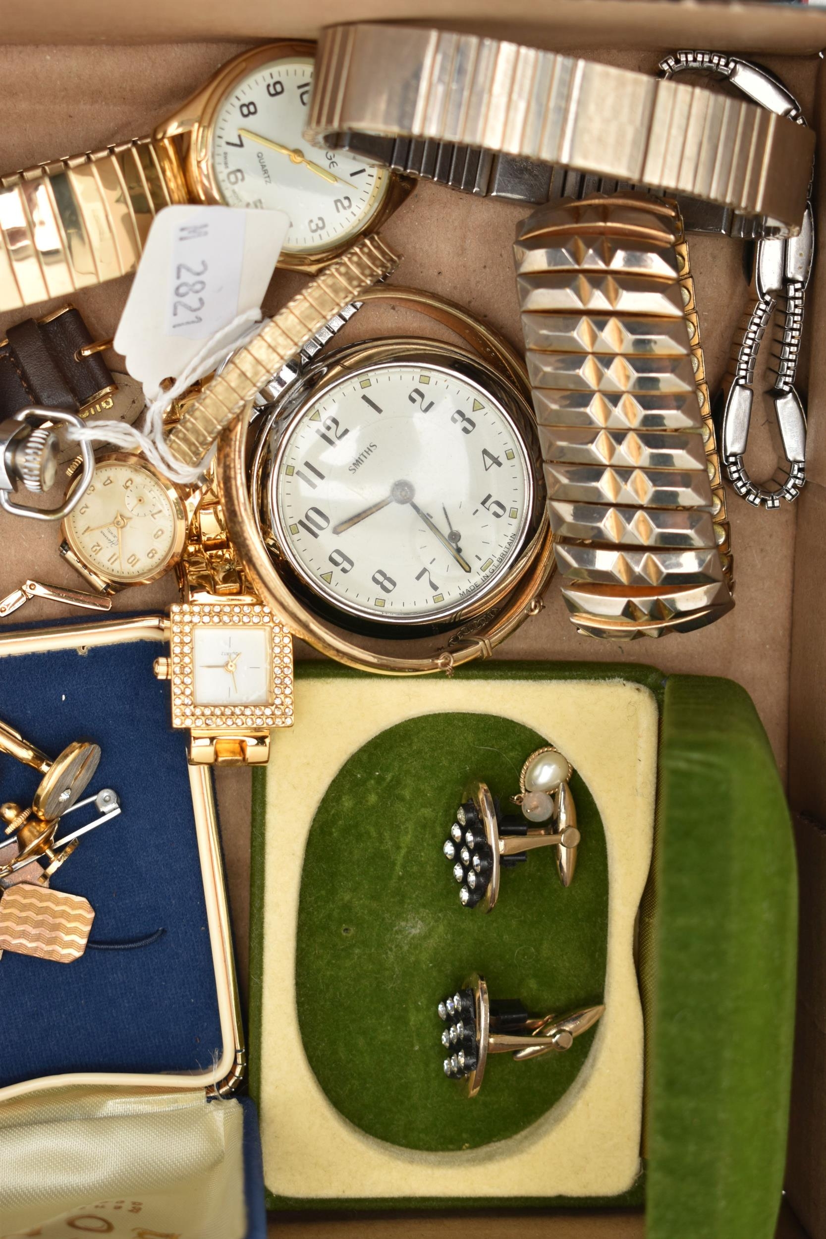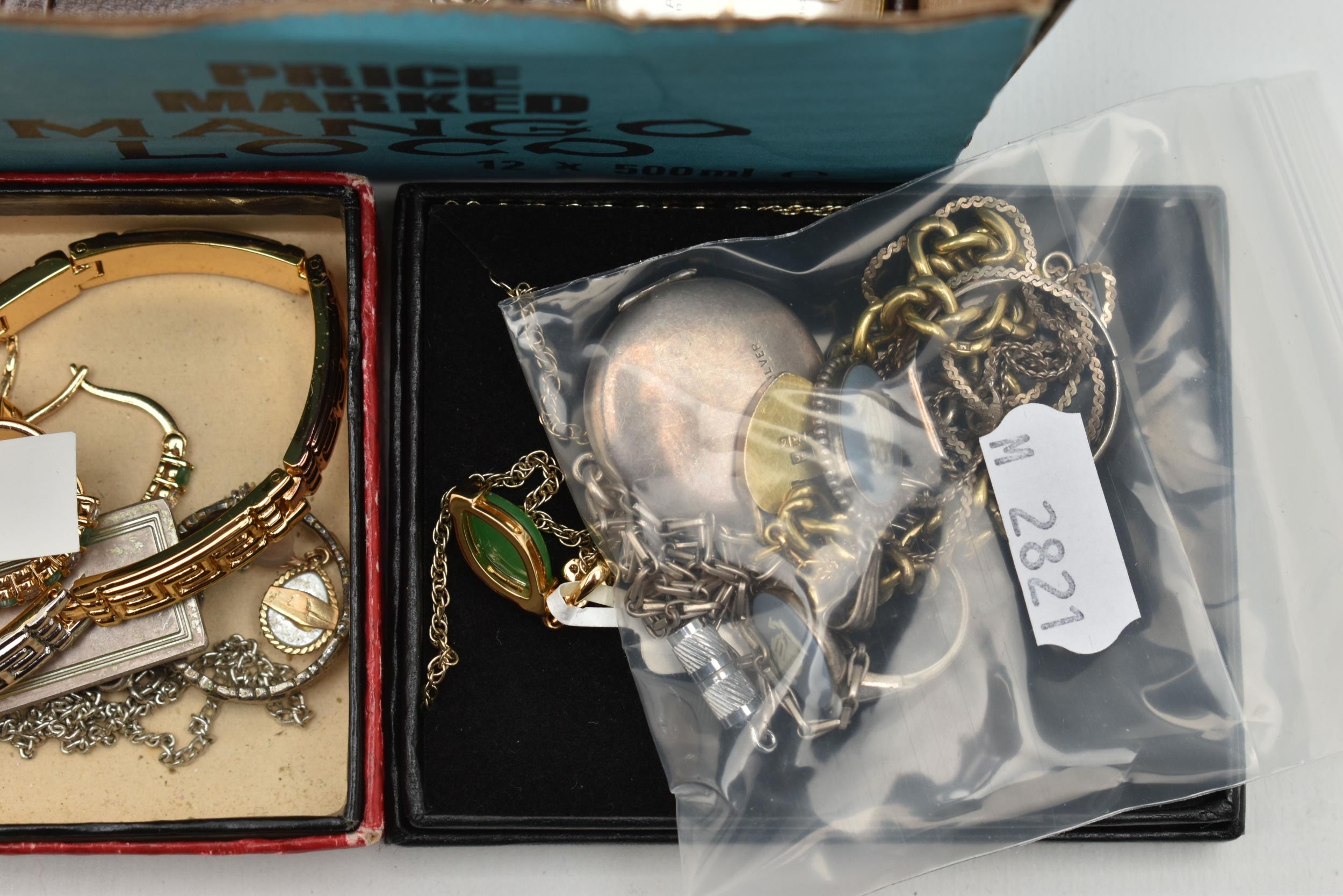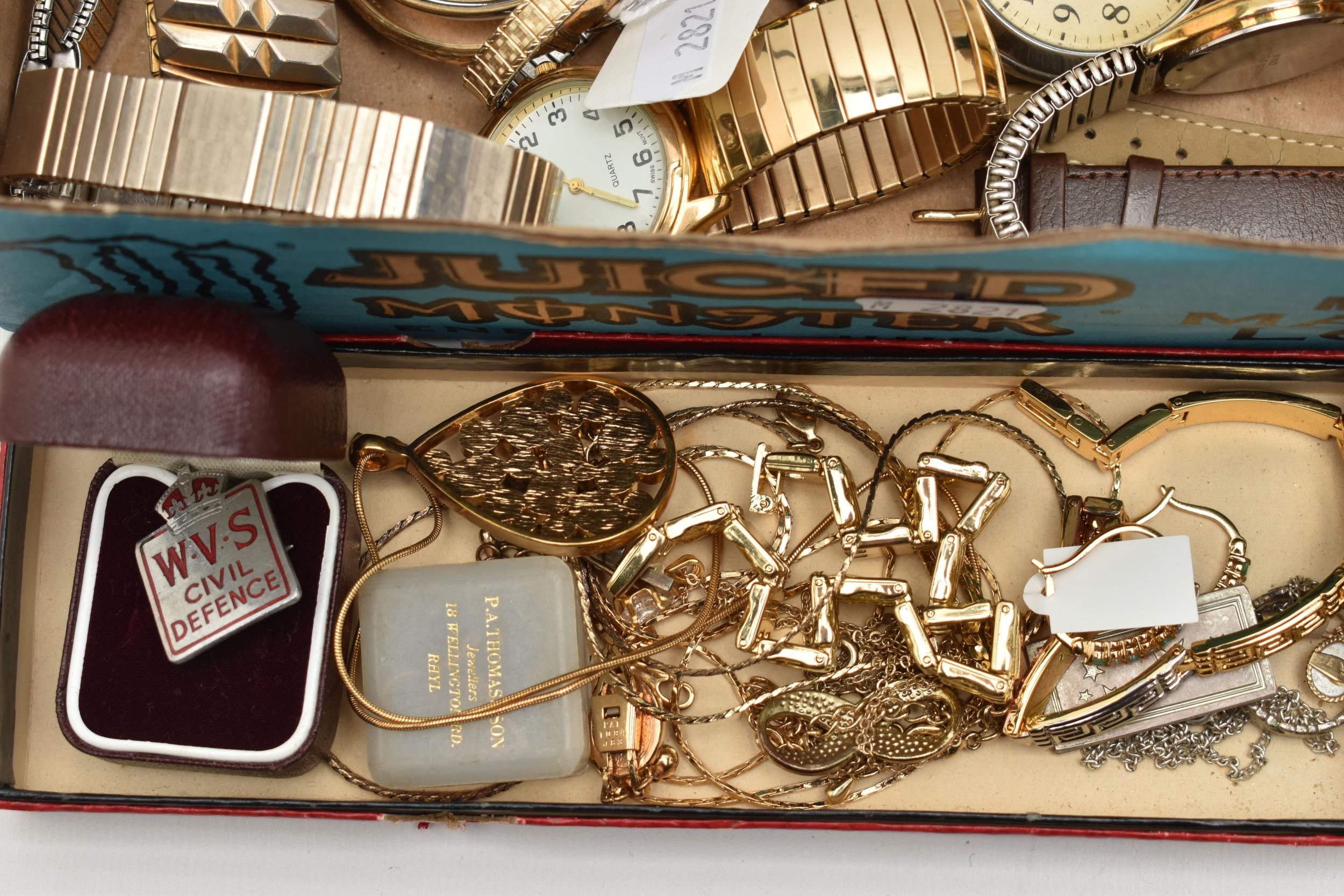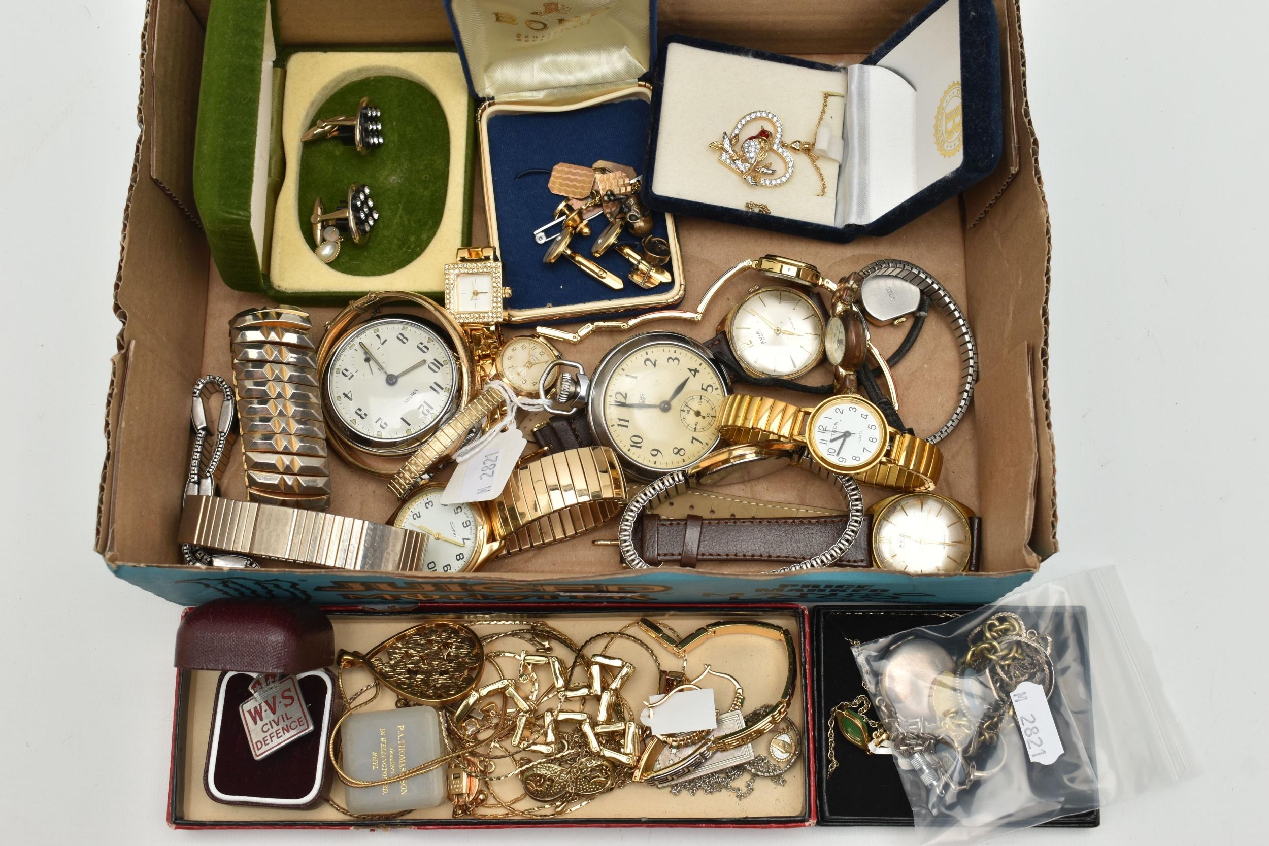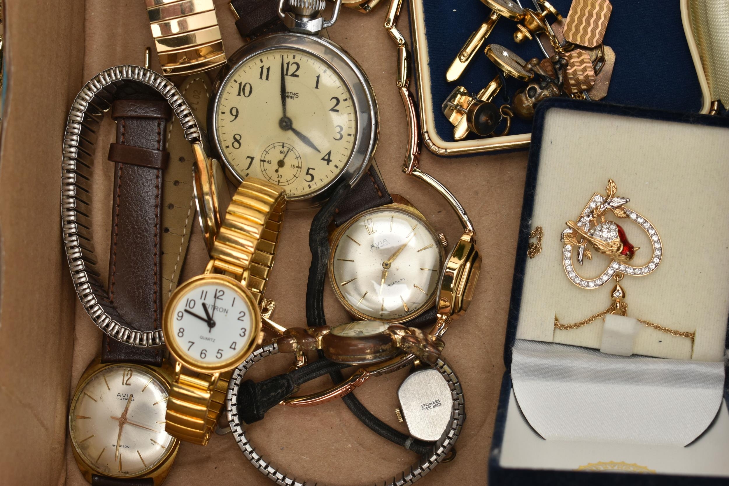 A BOX OF ASSORTED WATCHES AND JEWELLERY, to include an open face 'Smiths Empire' pocket watch and an open face 'Smiths' pocket watch, both with a hand wound movement, Arabic numerals, subsidiary dials, approximate width 51mm, a rolled gold hinged bangle, approximate width 8.5mm, a gold plated silver curb link bracelet, fitted with a heart padlock clasp, hallmarked silver Birmingham 16.6 grams, a white metal Wedgewood ring and pendant, an AF signet ring, stamped 9ct on sil, a white metal s link chain, and a white metal locket, approximate gross weight 15.5 grams, nine wrist watches, names to include Avia, Berge, Rotator, Citron and Herma, together with an assortment of costume jewellery items, (condition report: general moderate wear, signet ring shank has been cut, watches have not been tested for working condition, we cannot guarantee the working order of any watch)