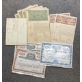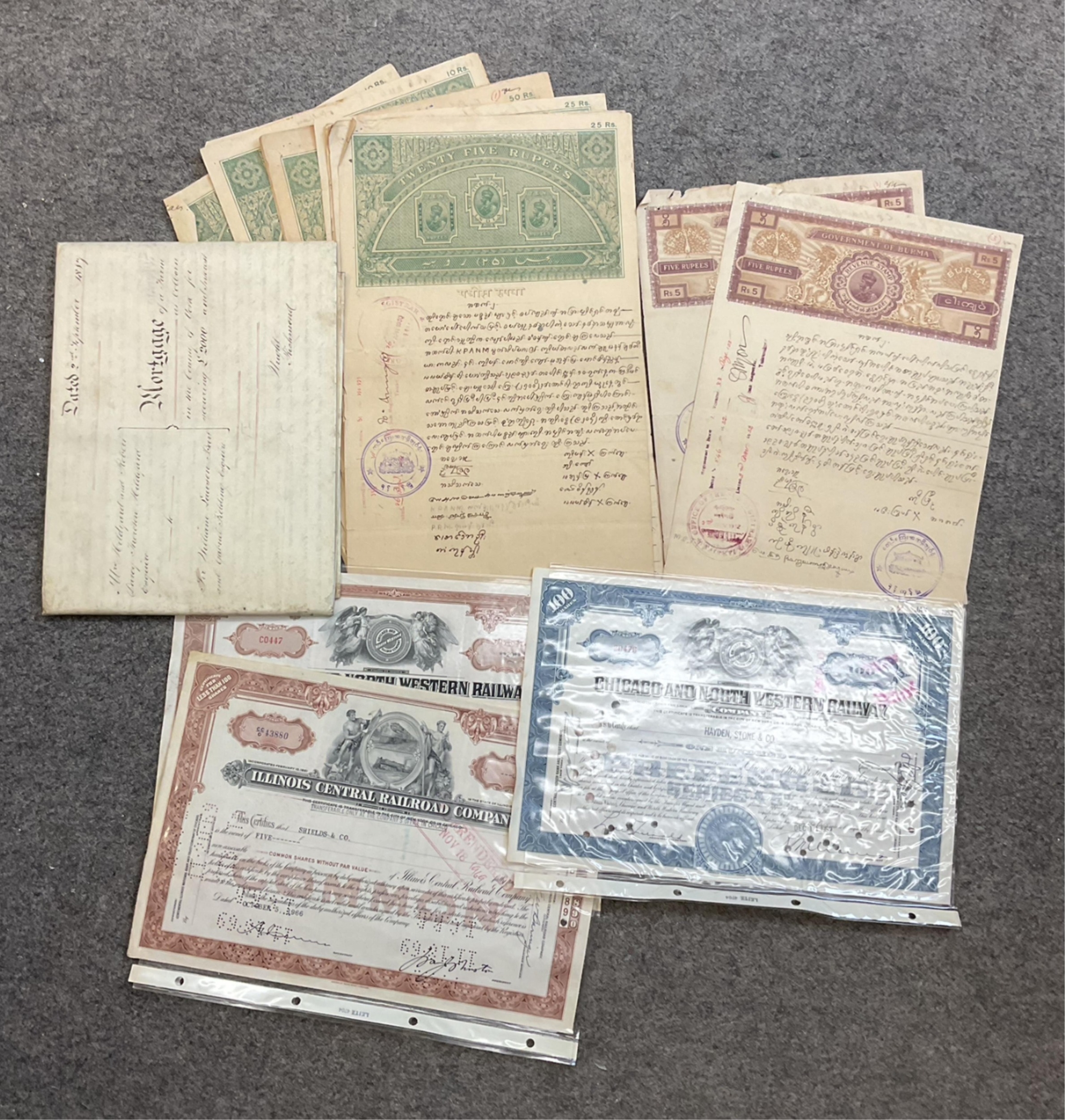 Collection of ephemera - To include Twenty Five Rupees & Five Rupees stamp paper (19), together with Chicago and North Western Railway & Illinois Central Railroad share certificates (3); 1847 mortgage deeds; Andy Priaulx ephemera; Mercedes-Benz 350L 450L brochure. (qty)