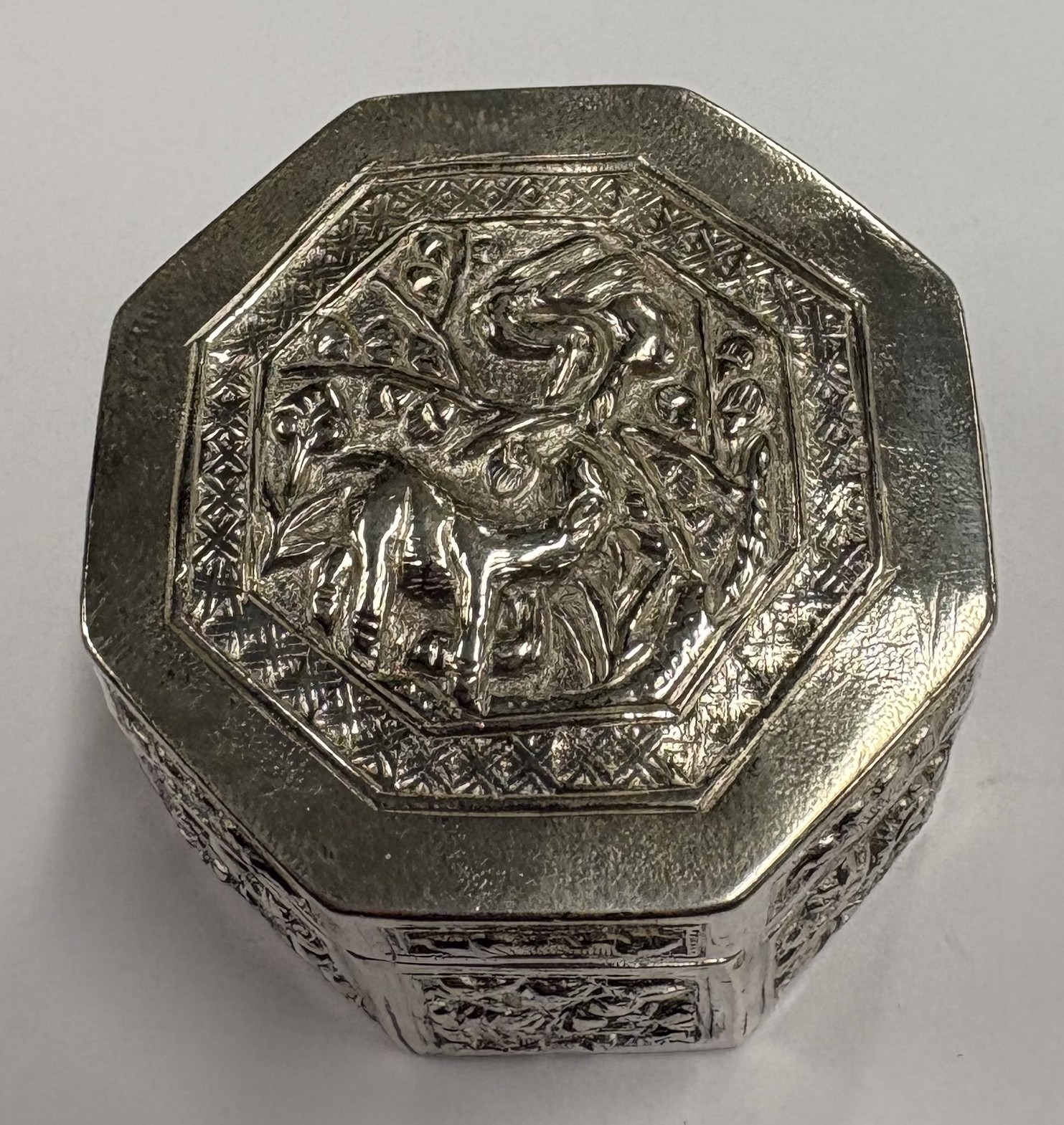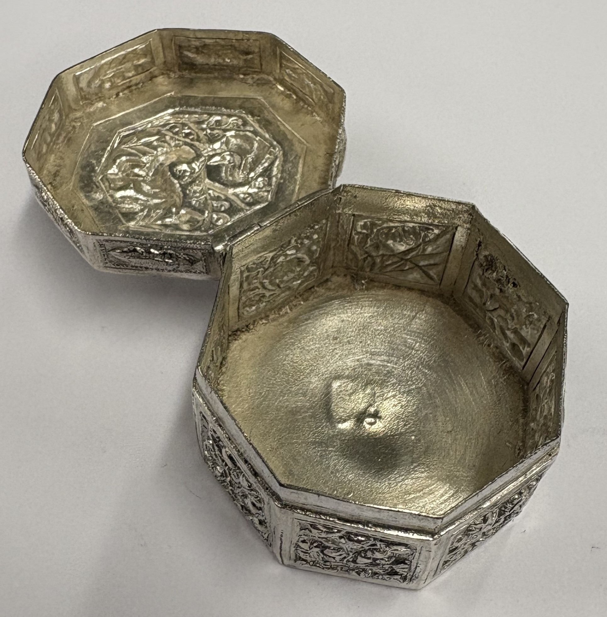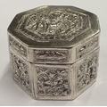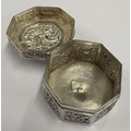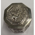 A chased Chinese export silver snuff box with hinged cover, marked to base. Approx. 29 grams. Est. £80 - £120.