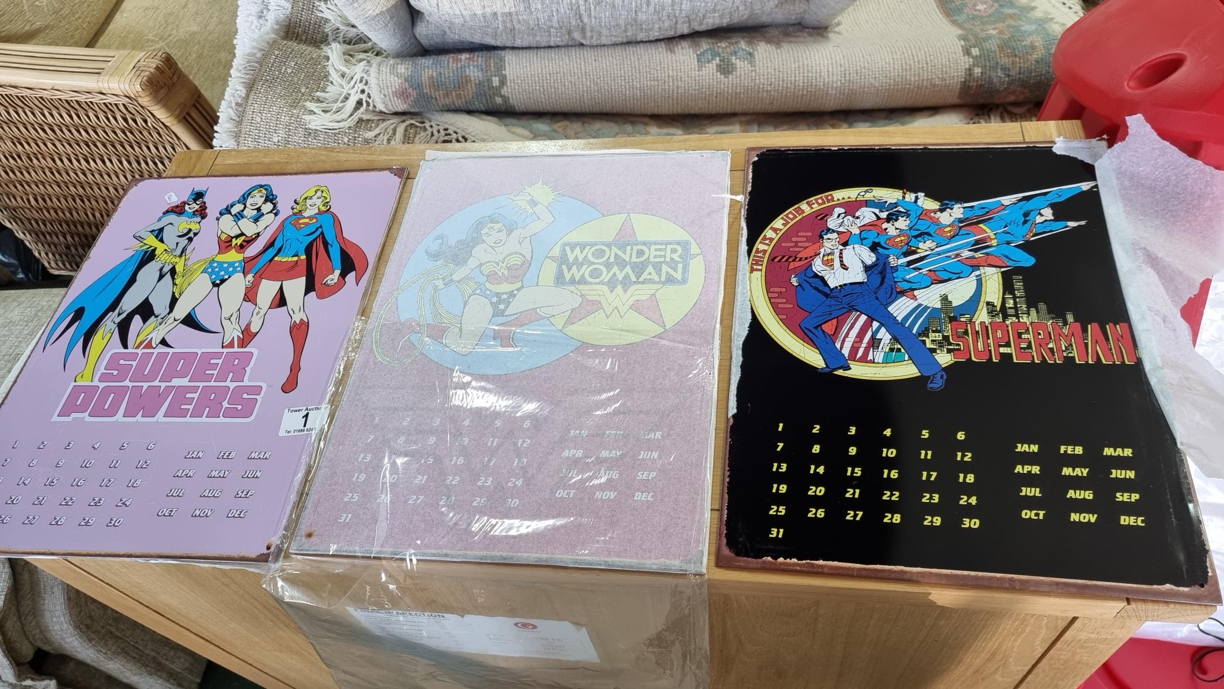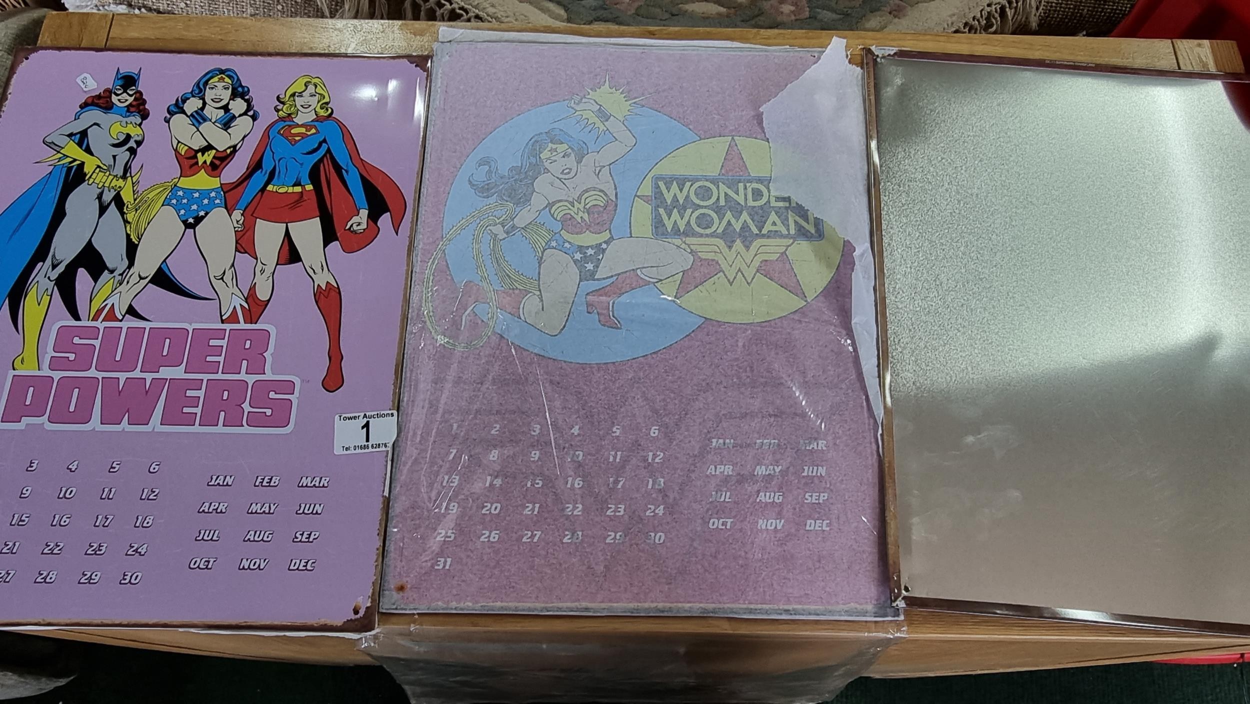 3x metal calendars showing DC comic superhero inc Superman, Wonder woman etc 40cm by 30cm
