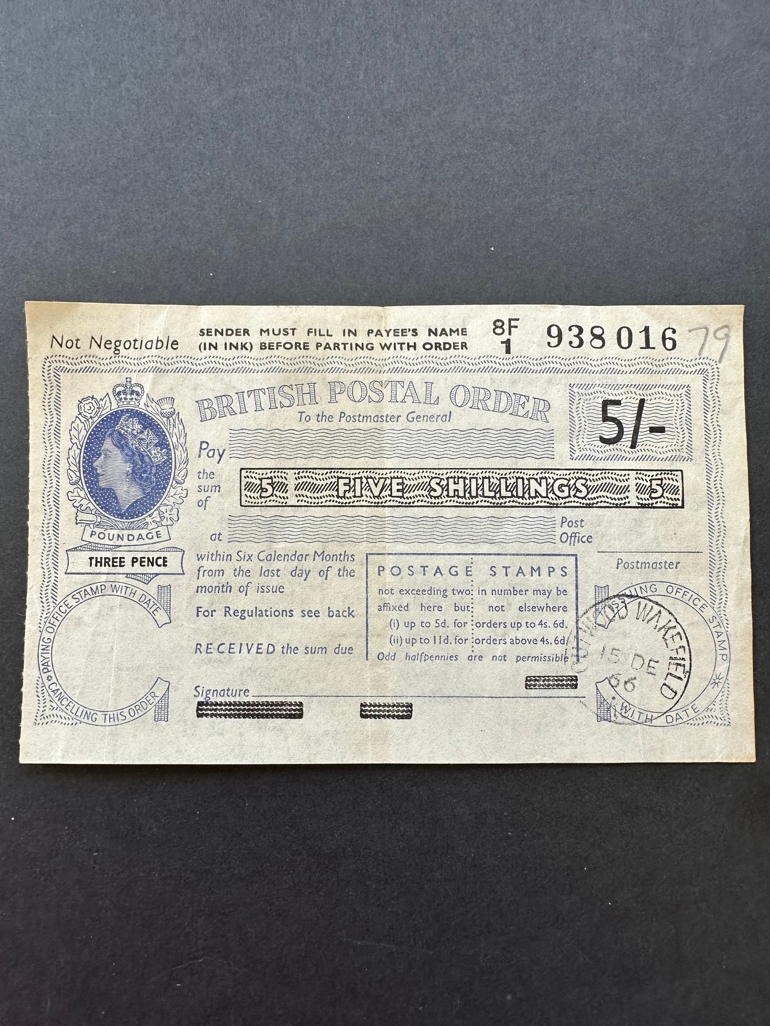 1966 GB 5/- Postal Order QEII, Outwood Wakefield, Yorkshire cancel