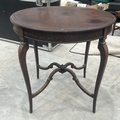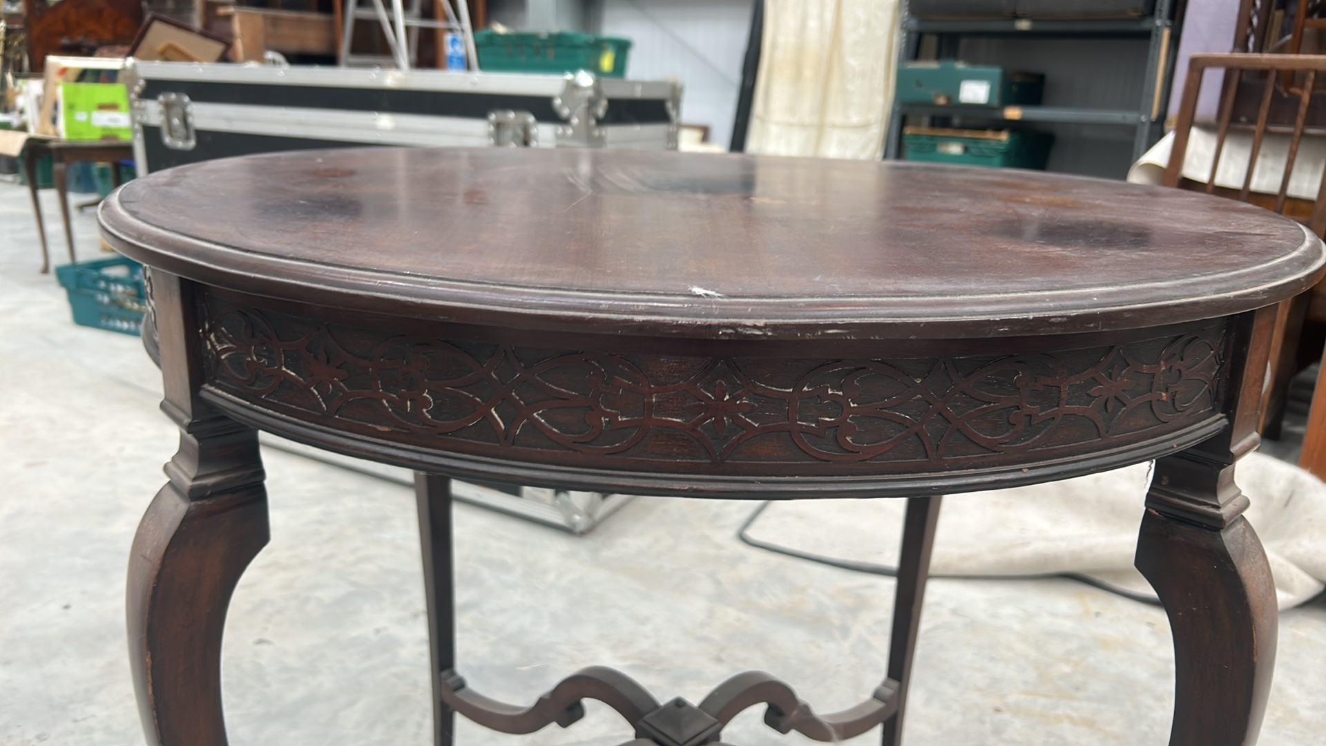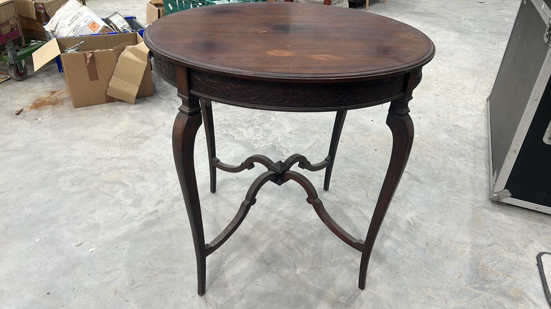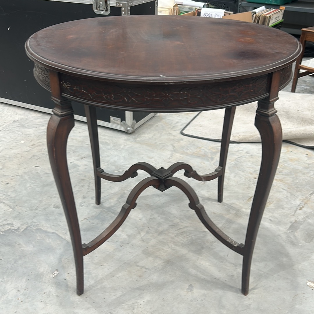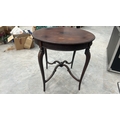 Edwardian mahogany circular occasional table, pierced arabesque frieze, moulded top over cabriole legs joined by serpentine X-form stretcher with central finial.