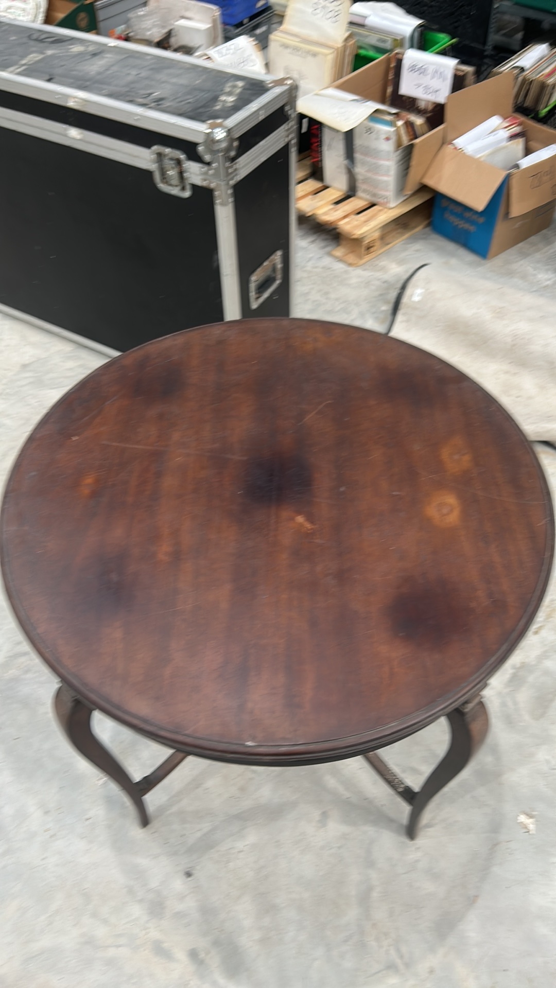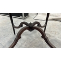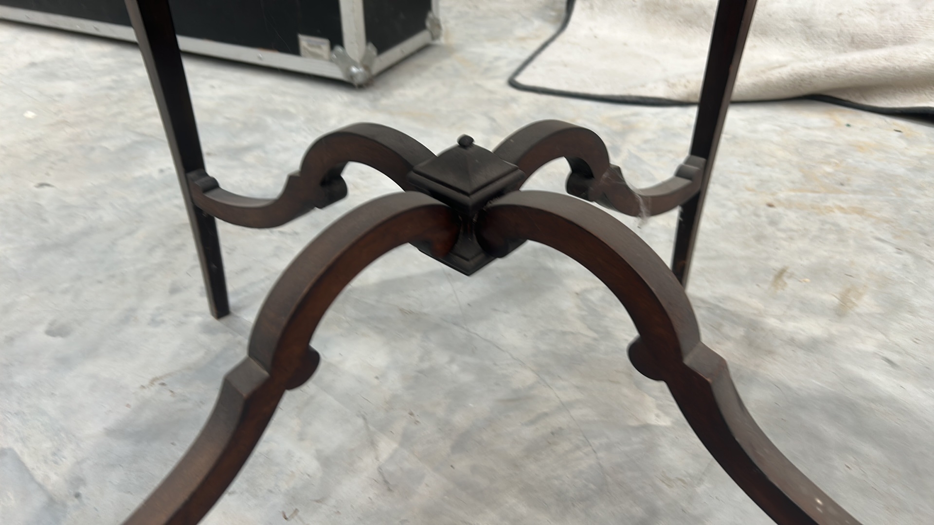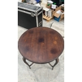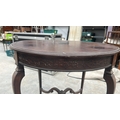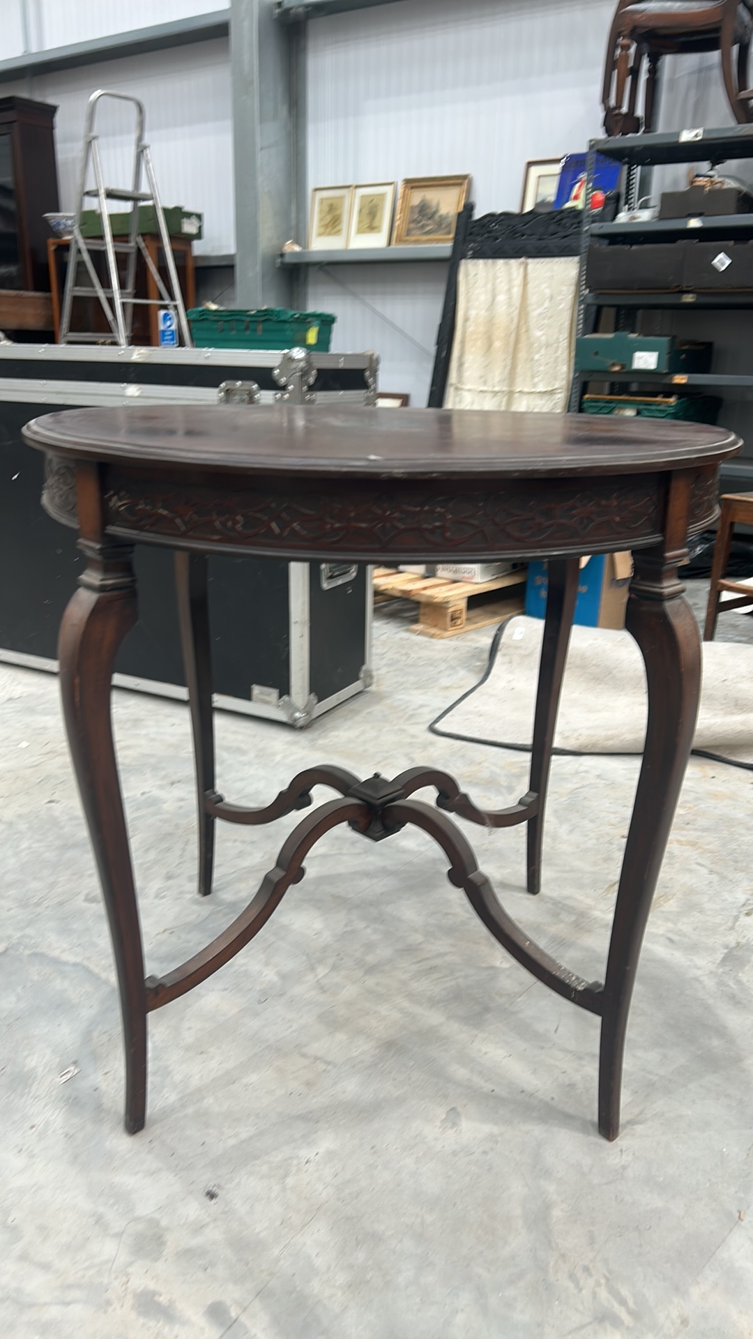 Edwardian mahogany circular occasional table, pierced arabesque frieze, moulded top over cabriole legs joined by serpentine X-form stretcher with central finial.