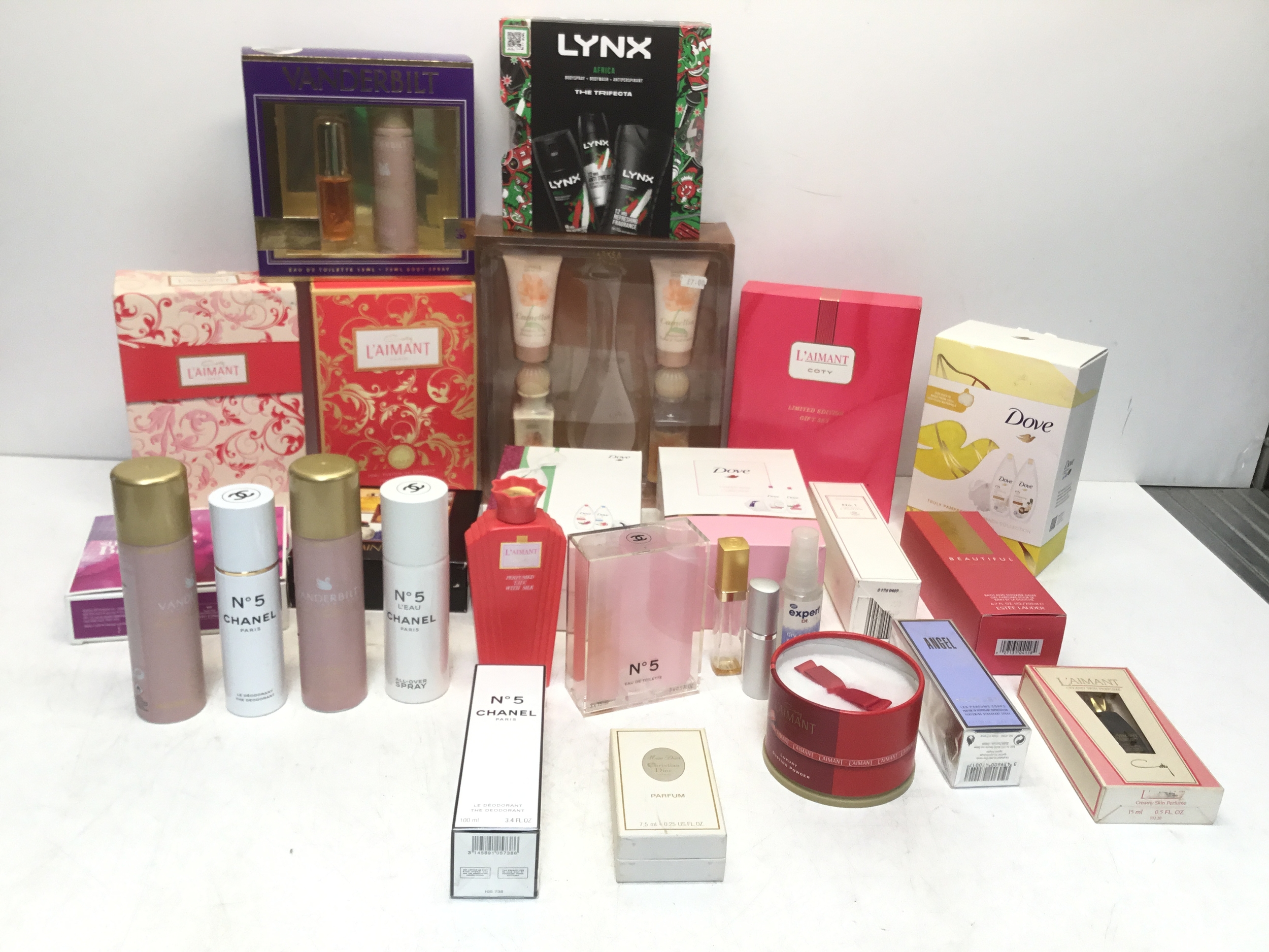 A quantity of toiletries including Lynx Africa Trifecta, Dove Happiness and Chanel No.5 deodorant