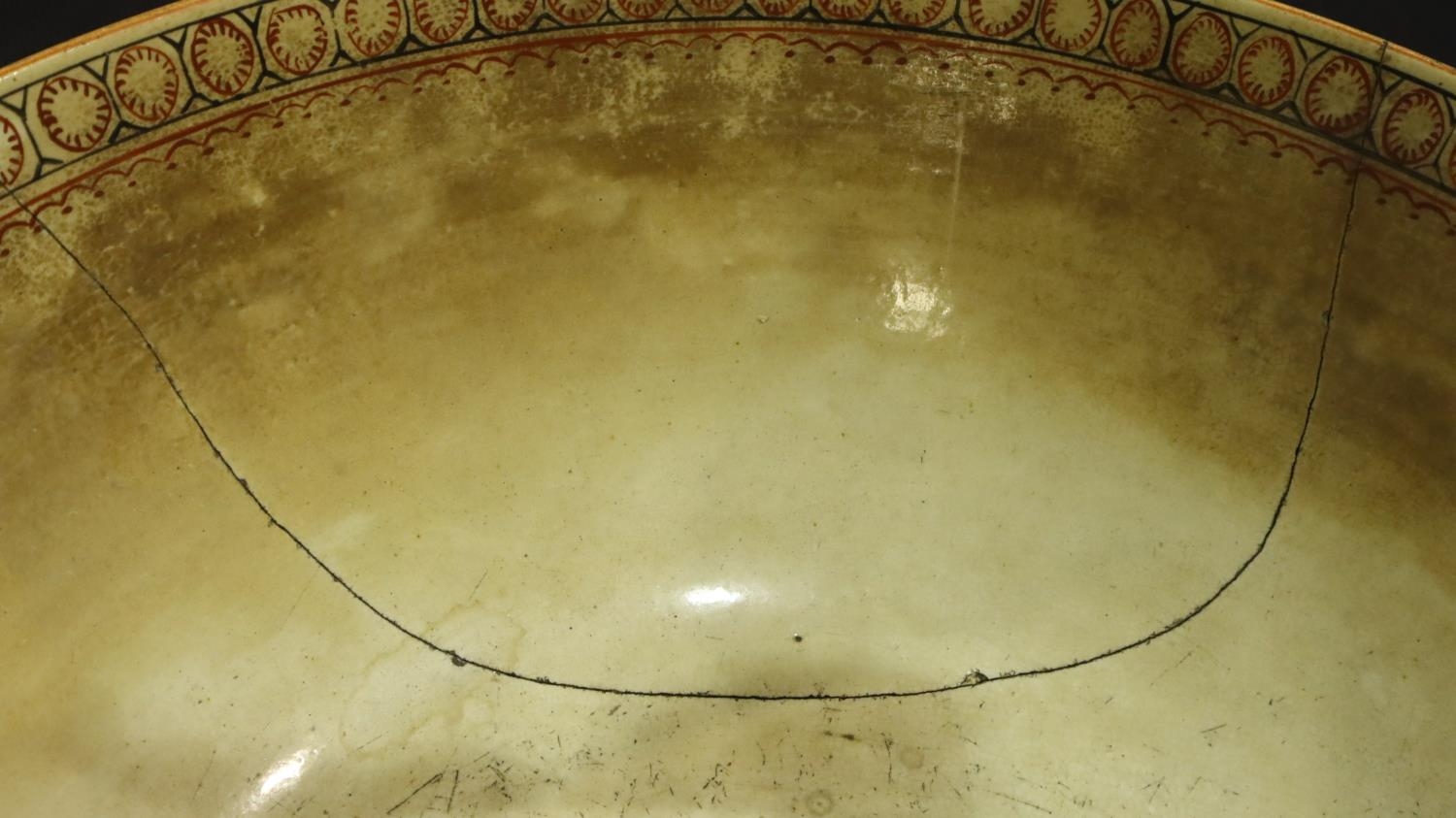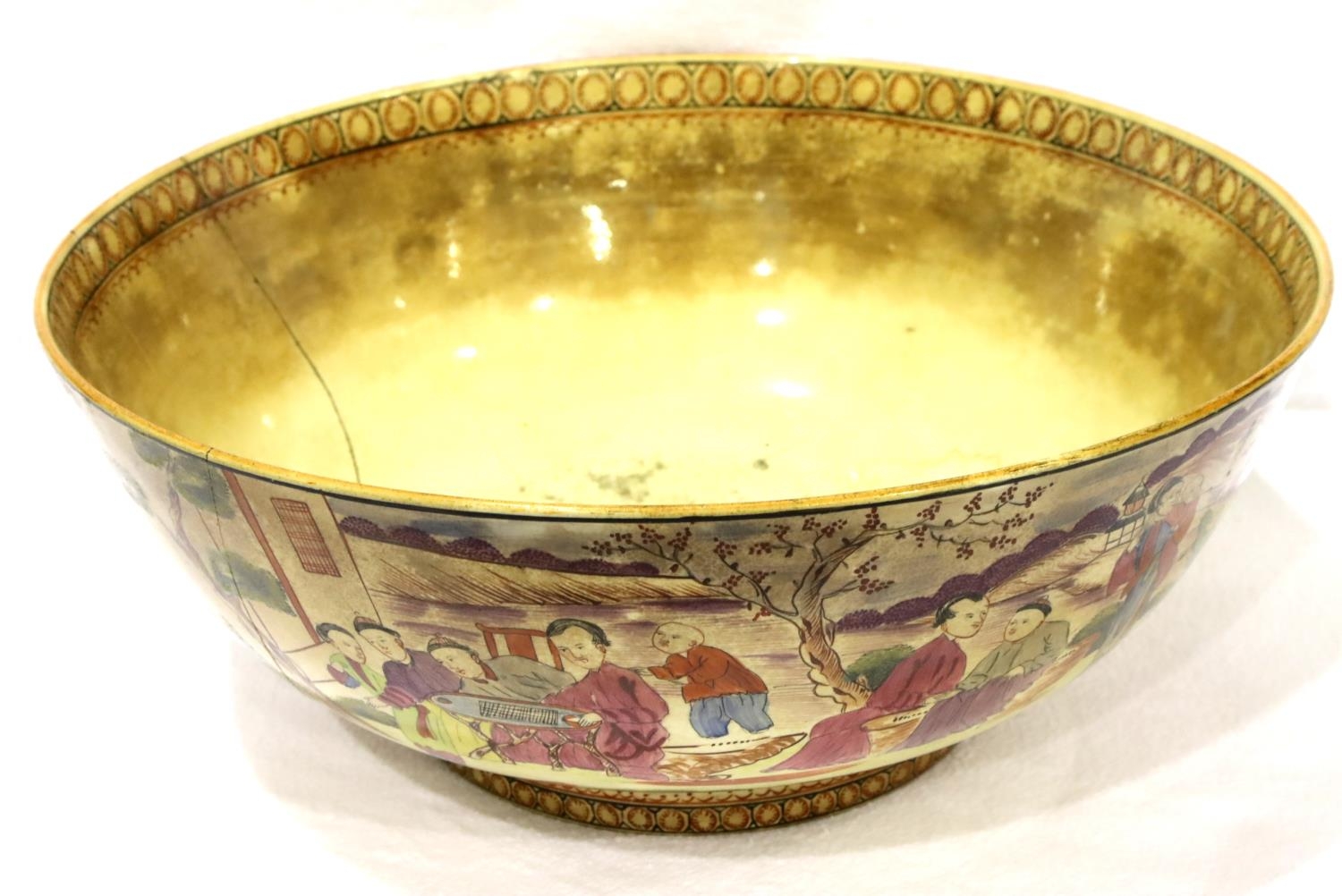 Wolfe & Hamilton of Stoke, a substantial creamware bowl, c1800, decorated with Oriental figural scenes for restoration, D: 29 cm, large glued repair, chips to rim, heavy crazing and discolouration. Not available for in-house P&P, contact Paul O'Hea at Mailboxes on 01925 659133