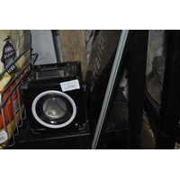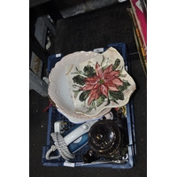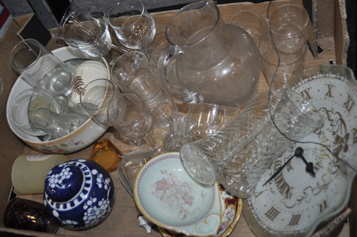 A SELECTION OF VINTAGE KITCHENALIA INC BELLS WHISKY GLASS, WINE GLASSES, CARAFE, FRUIT BOWL, VINTAGE CHINESE BLE AND WHITE GINGER JAR WITH CORK SEAL AND LID INTACT, VASES ETC