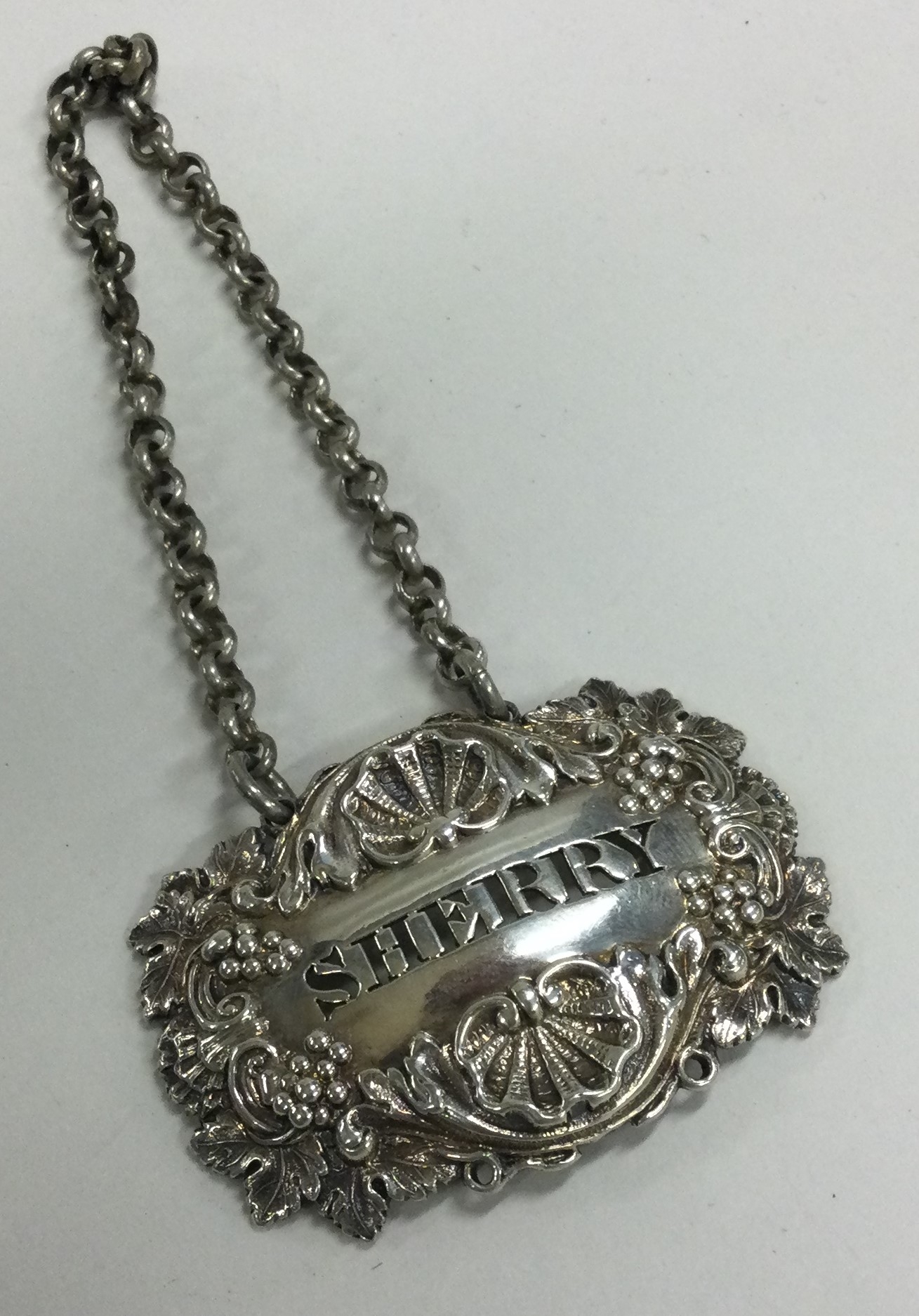 A heavy cast silver wine label for 'Sherry'. Approx. 26 grams. Est. £25 - £30.